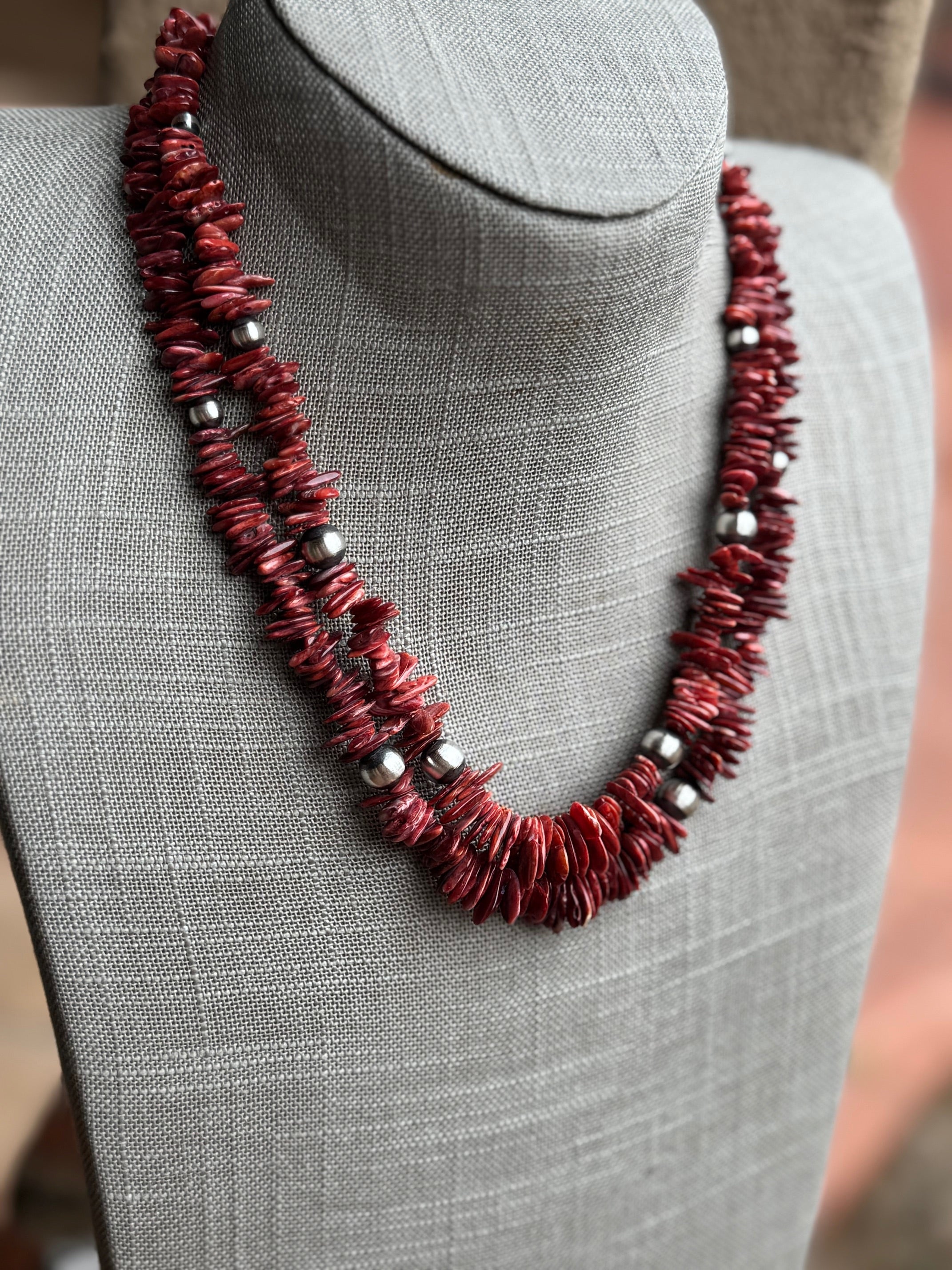Beautiful Handcrafted Red Spiny Oyster Shell Beaded Necklace. Measures 18 inches long. Beads measure 5-8mm. Such a pretty piece!  This listing is for 1 strand only, multiple strands is for display only.