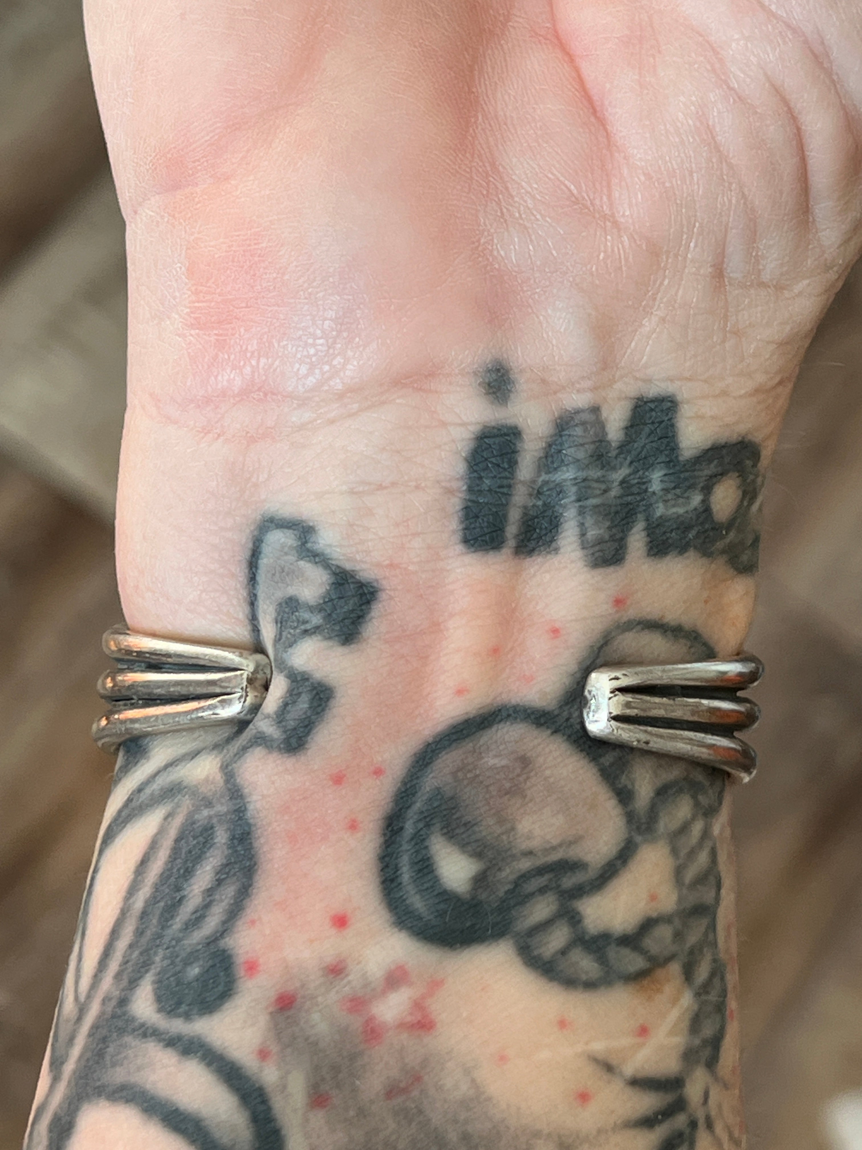 Since the early 80’s, Santa Fe Artist Buffalo has been pounding out old school ingot jewels like no other. Each piece is truly one of a kind with subtle variances in stamping, shape and texture, allowing the wearer to literally feel the passion that went into creating it.