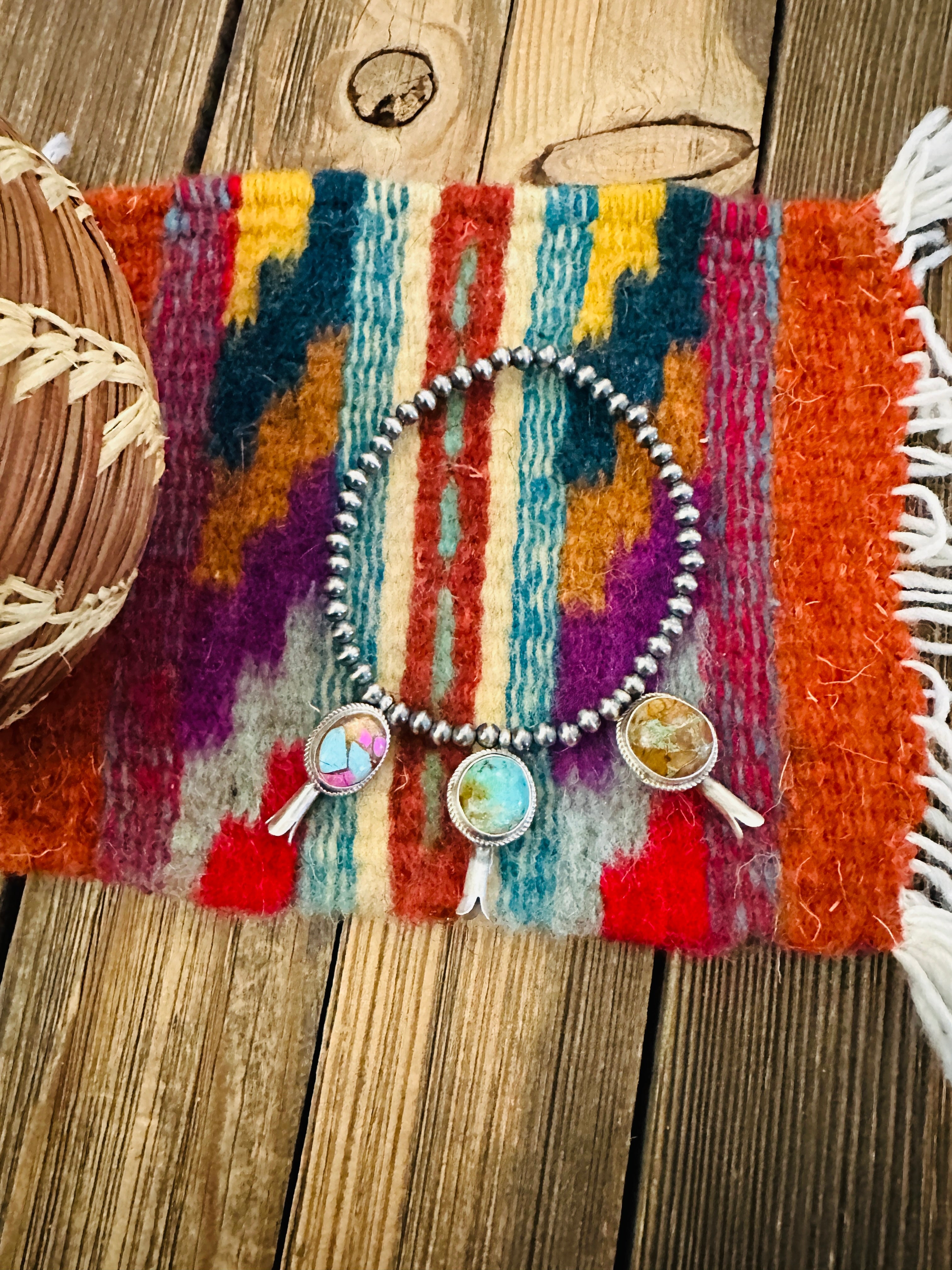 Beautiful handcrafted 3mm Sterling Silver Pearl and Multi Stone Blossom Beaded Stretch Bracelet. Blossoms measure just over 1 inch long. Perfect for stacking! Stretchy to fit most wrist sizes. Signed by the artist and stamped Sterling.