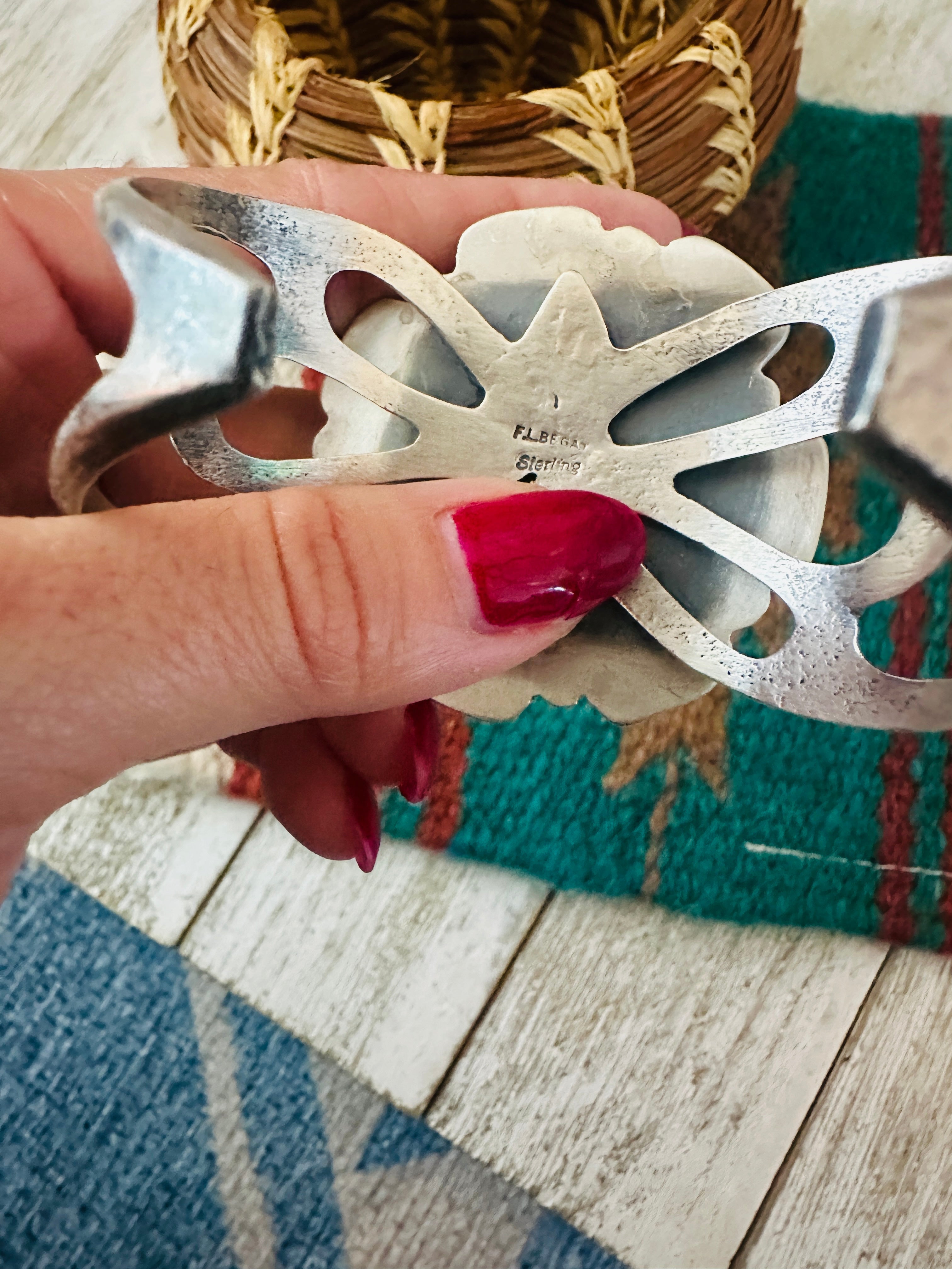 Beautiful Old Pawn Handcrafted Queen Pink Conch Shell and Sterling Silver Cluster Cuff Bracelet. Cuff has an inside circumference of 5 1/4 inches with a 1 inch gap. Width is 2 inches. Signed by the artist and stamped Sterling. Such a cool piece!