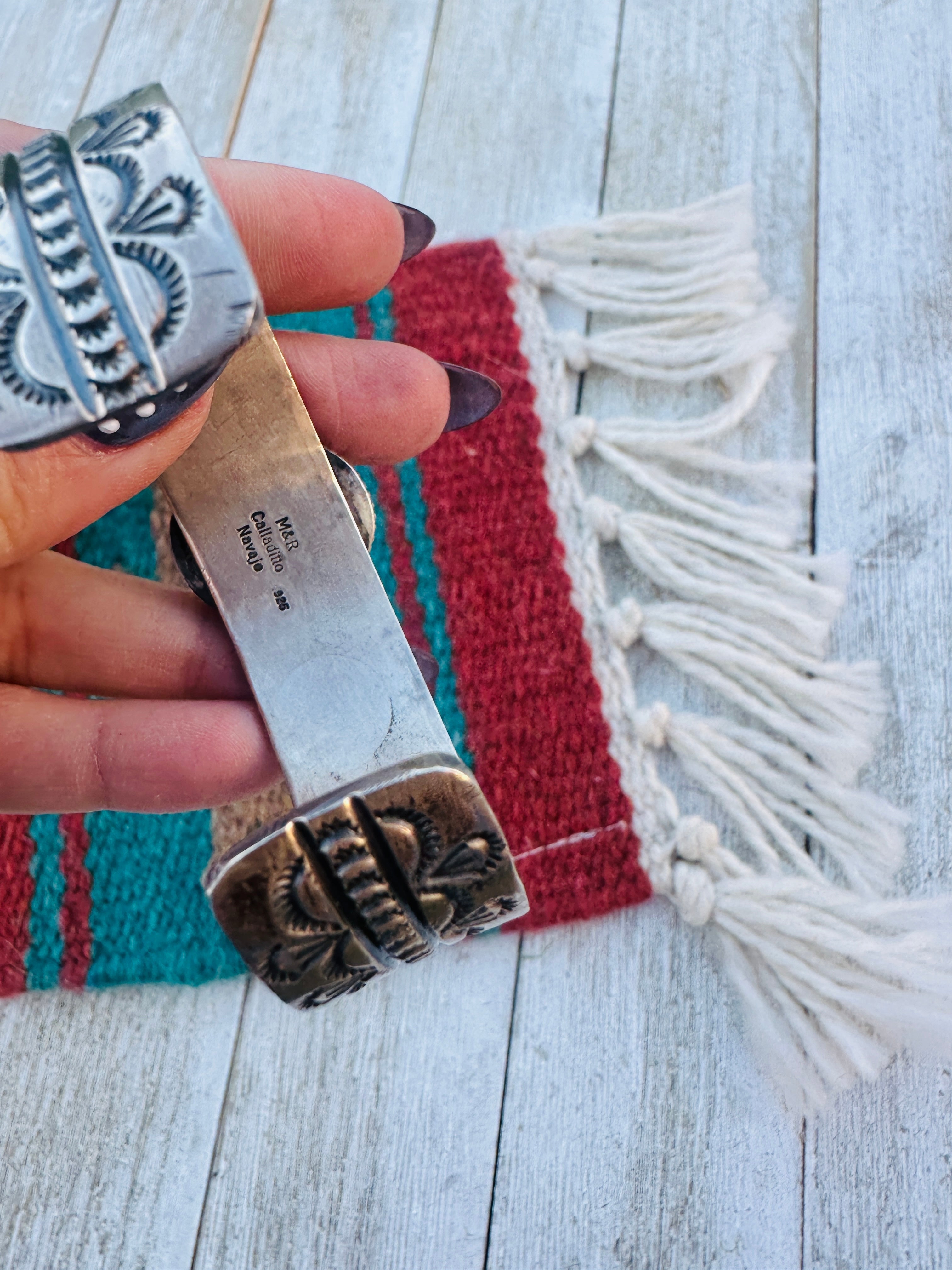 Beautiful Old Pawn Handcrafted Turquoise and Sterling Silver Cuff Bracelet. Cuff has an inside circumference of 5 5/8 inches with a 1 inch gap. Width is 1 inch. Signed by the artist M&R Calladitto and stamped Sterling. Such a cool piece!