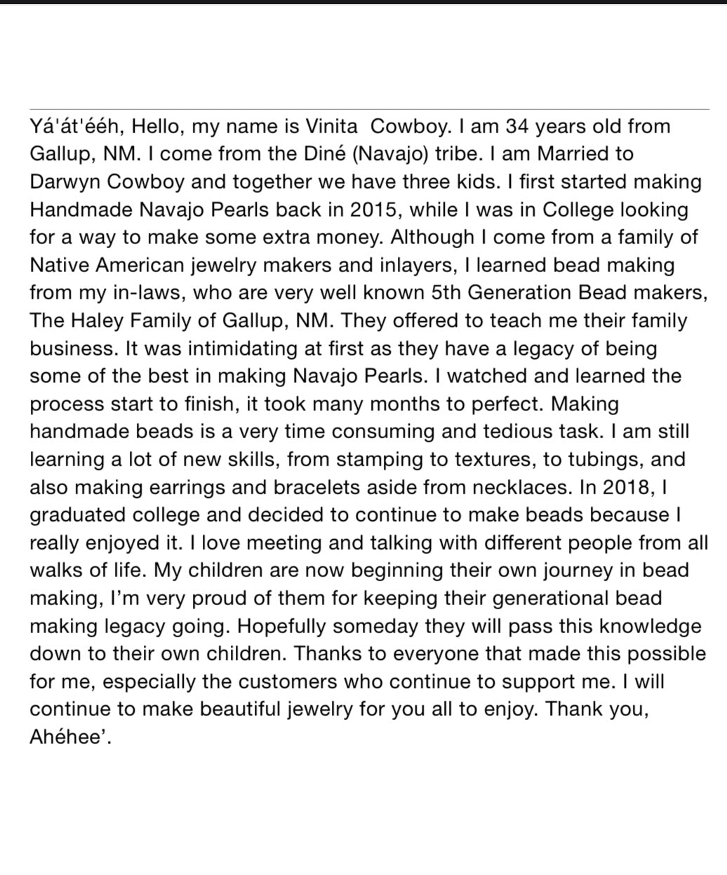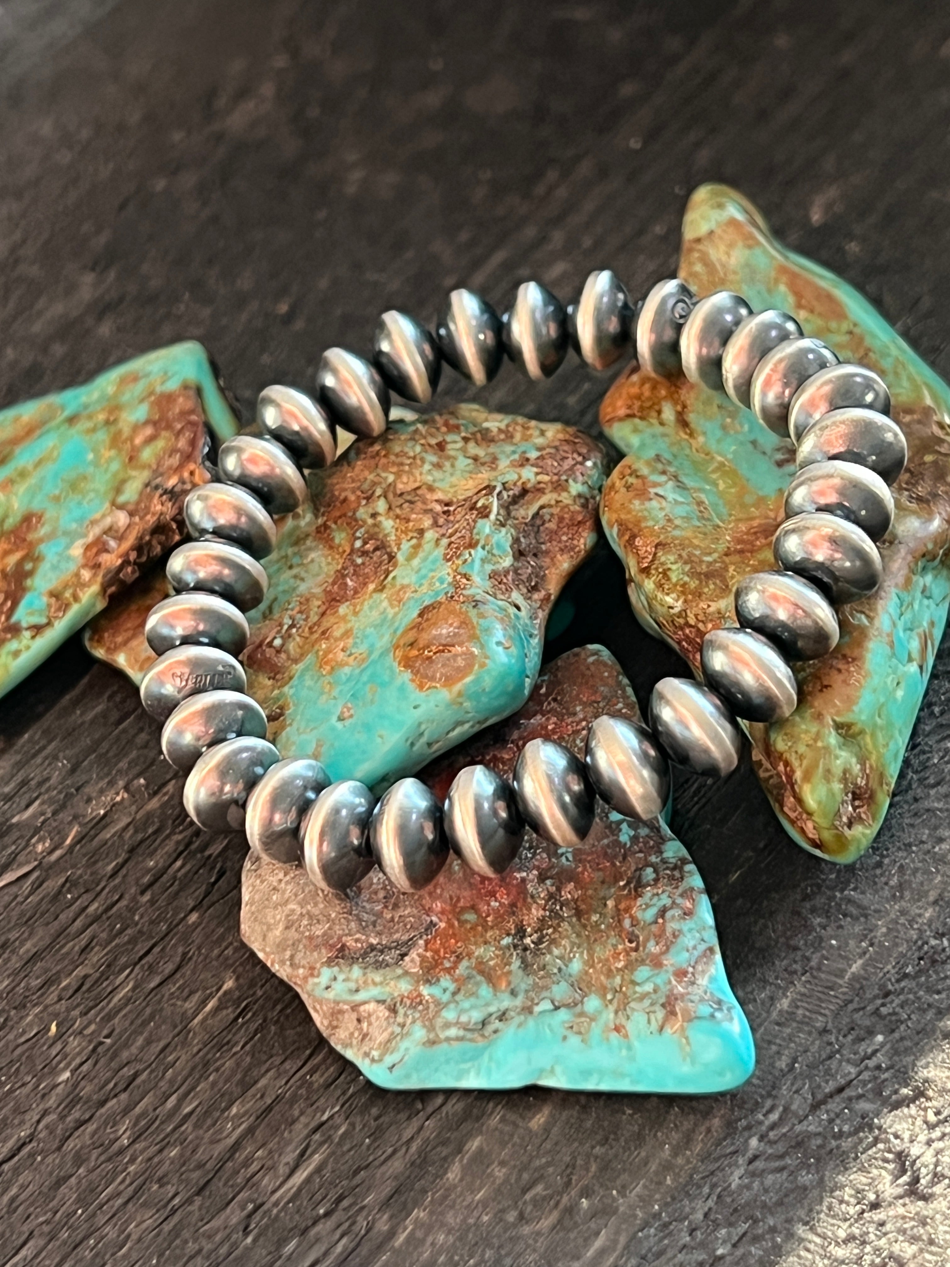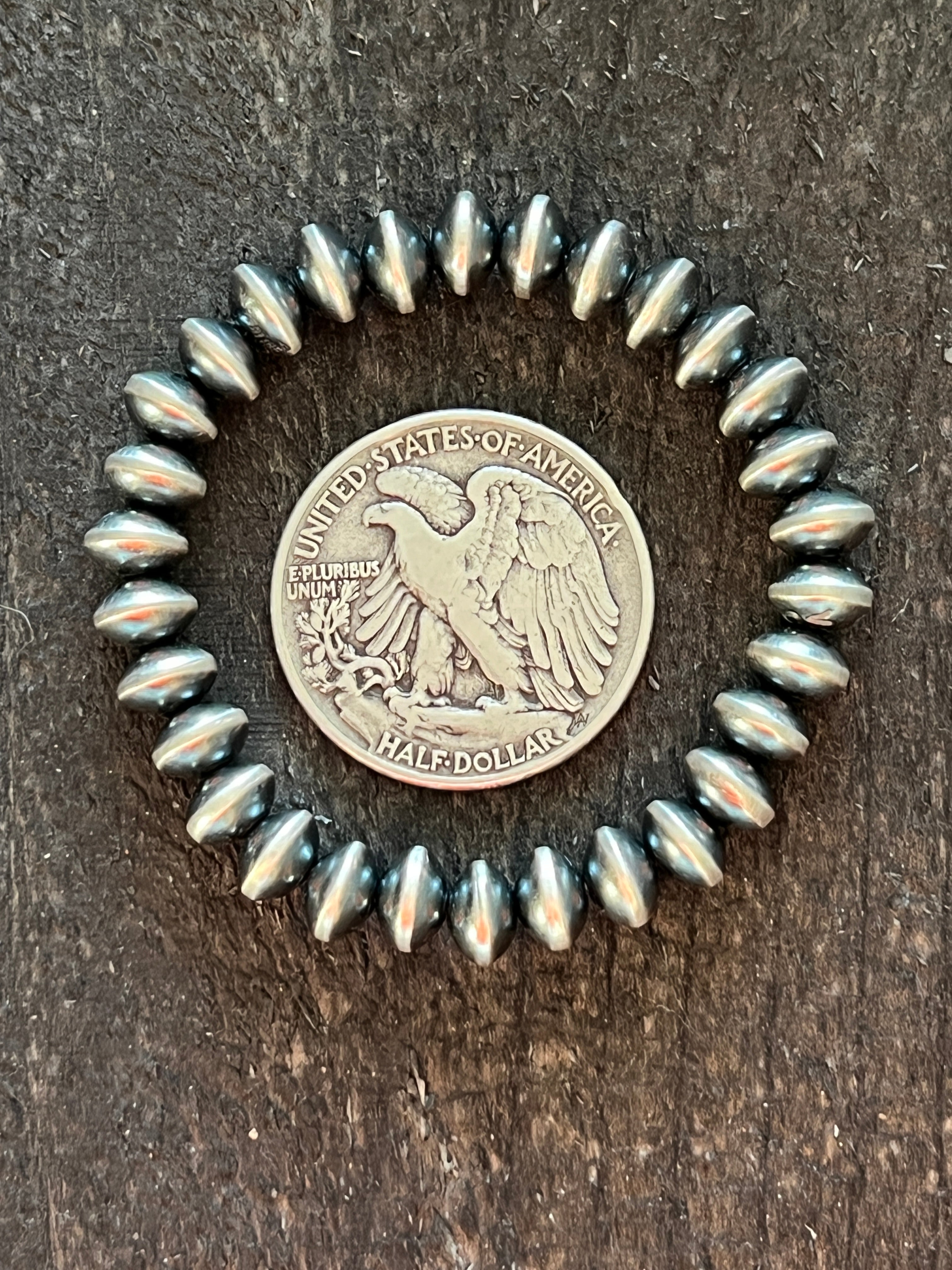 These gorgeous 8mm sterling silver saucer beads were painstakingly handcrafted by Navajo artist, Vinita Cowboy. In fact, beads like this are the only ones that can truly be called Navajo Pearls, as they were made by Navajo hands. It measures 1-3/4 inches in diameter which is best for 5 to 6 inch wrist. It is perfect by all by itself or stacked with other bracelets. This listing is for one beaded stretch bracelet only - be sure to search ‘Vinita Cowboy’ to see all of her beautiful handmade creations on our site.
