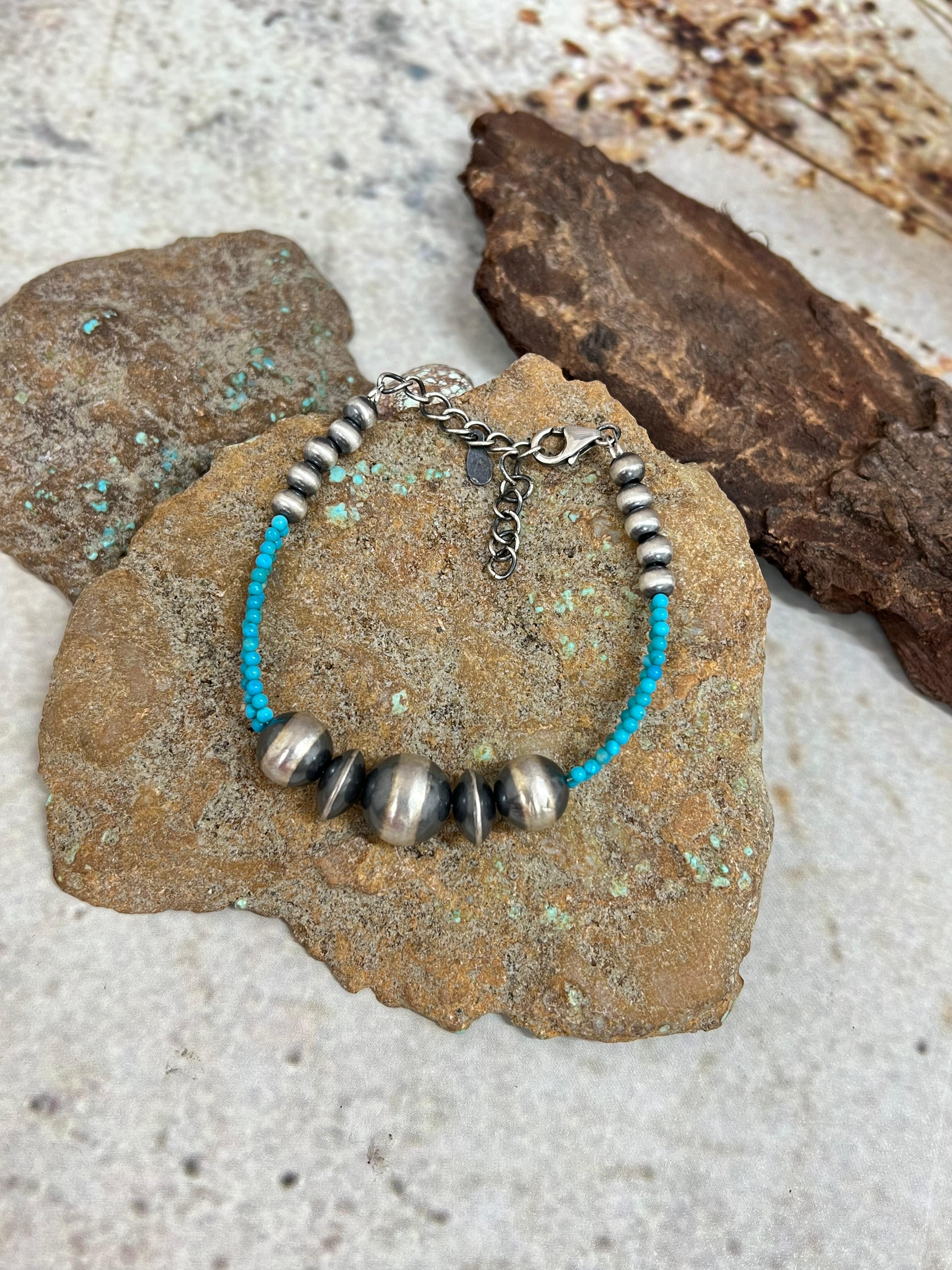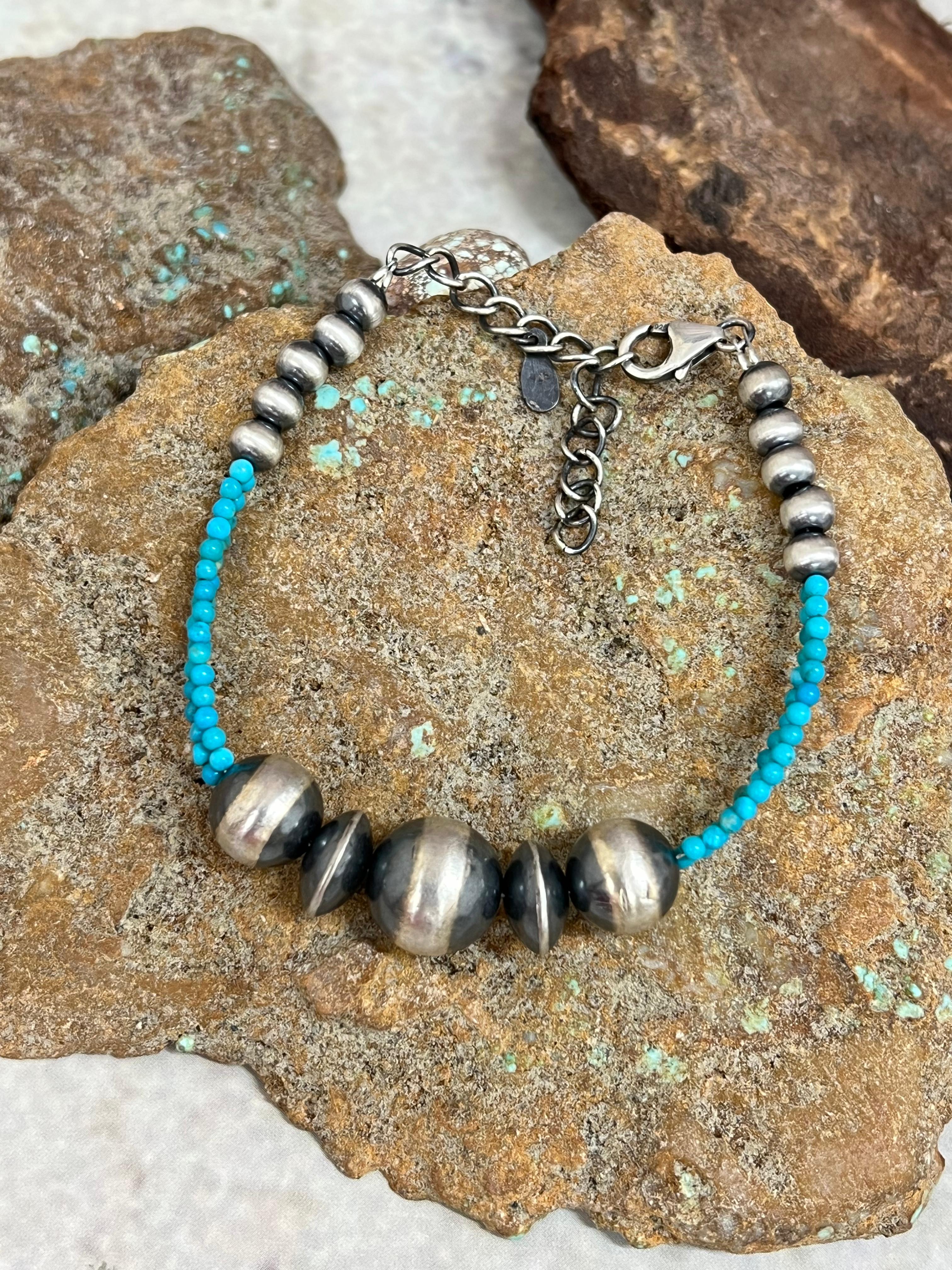 Handmade Sterling Silver Beaded Kingman Turquoise Bracelet with Signed Nizhoni