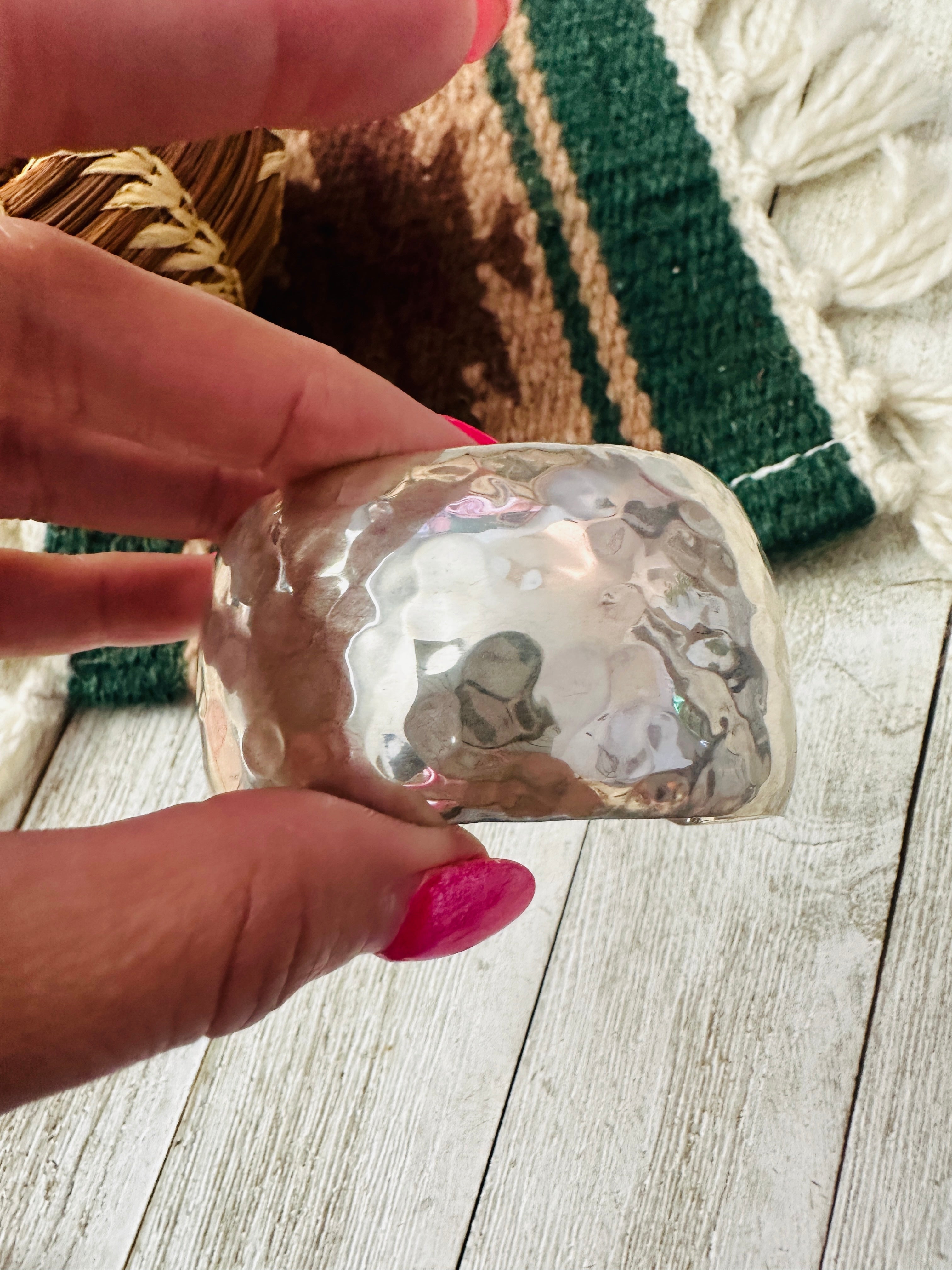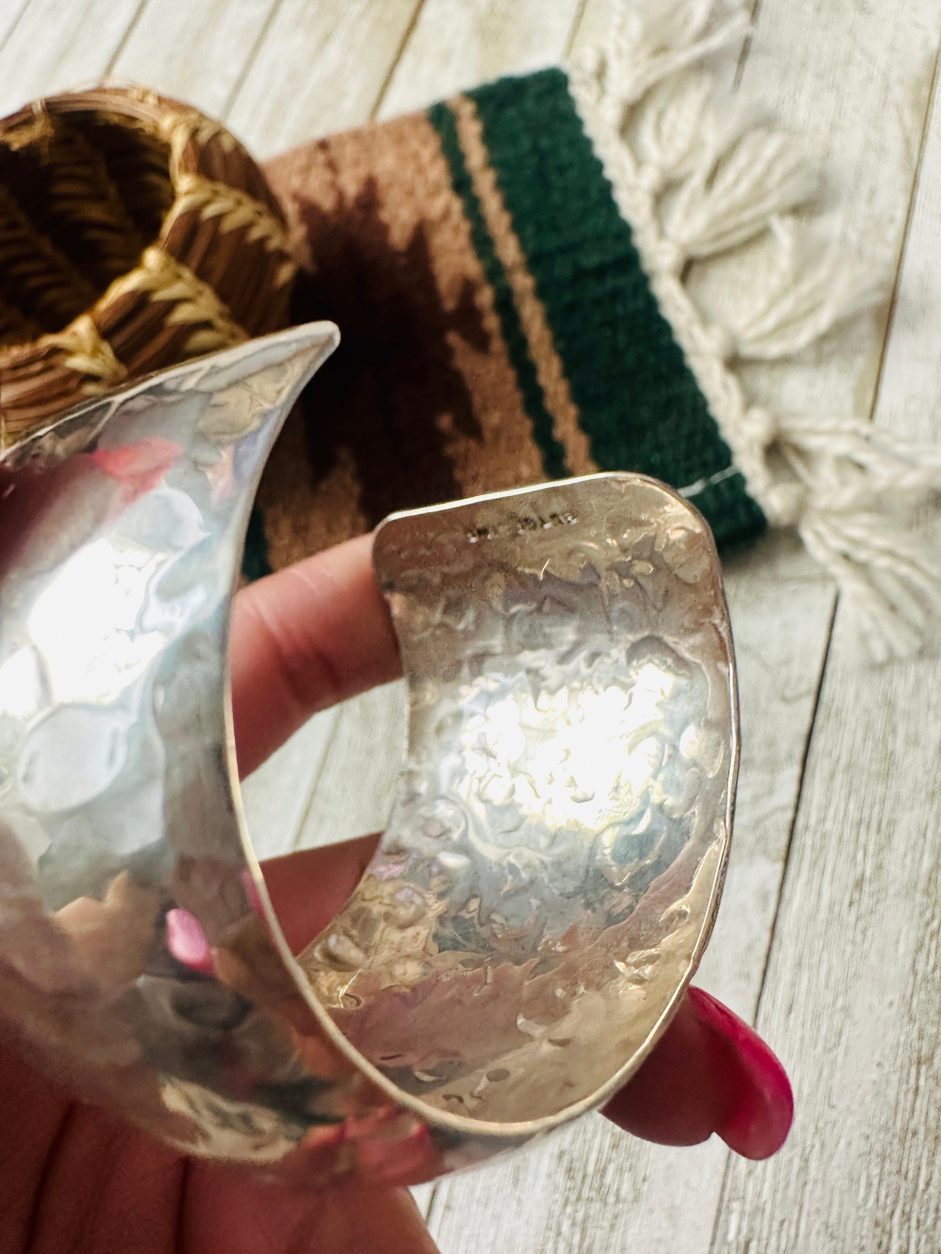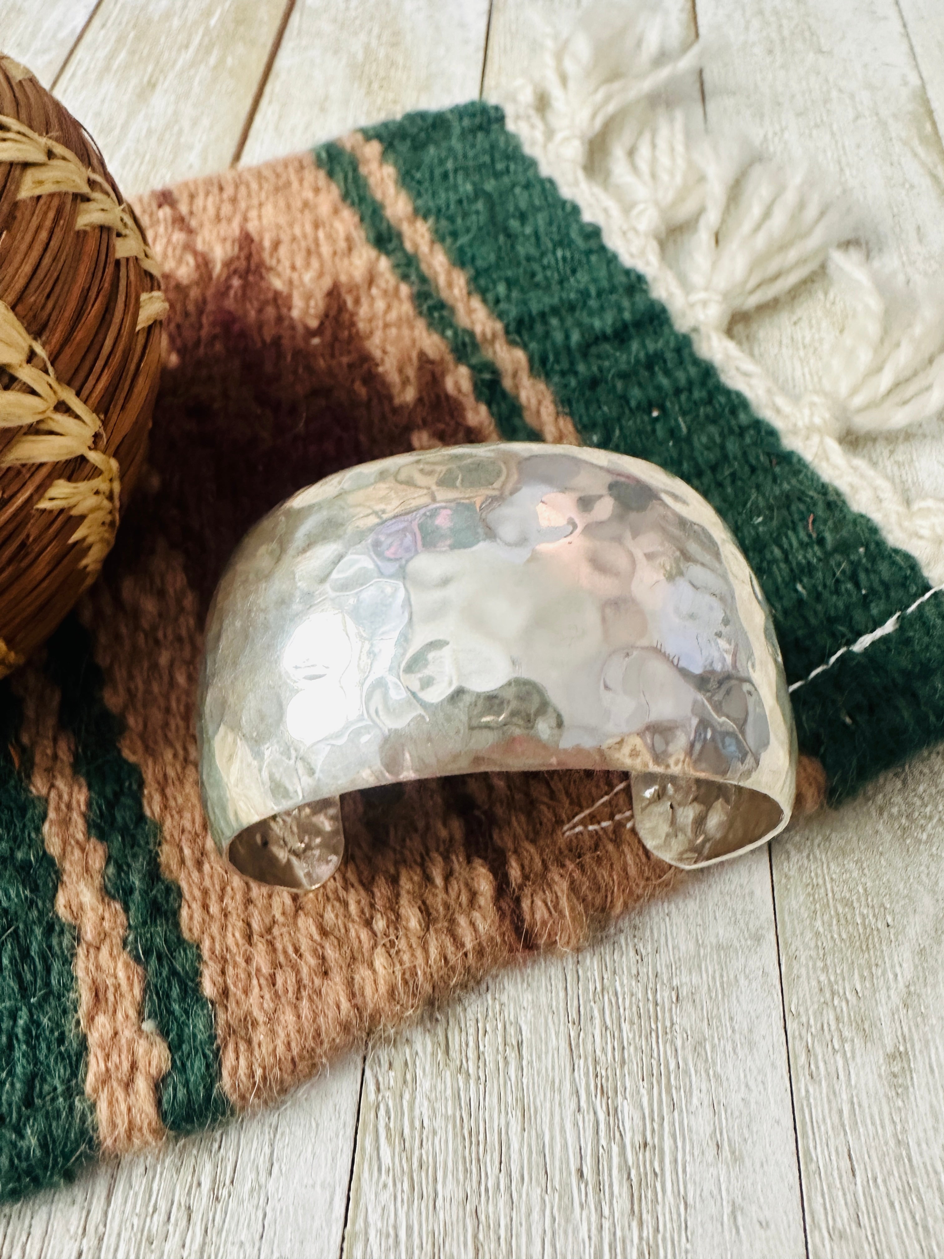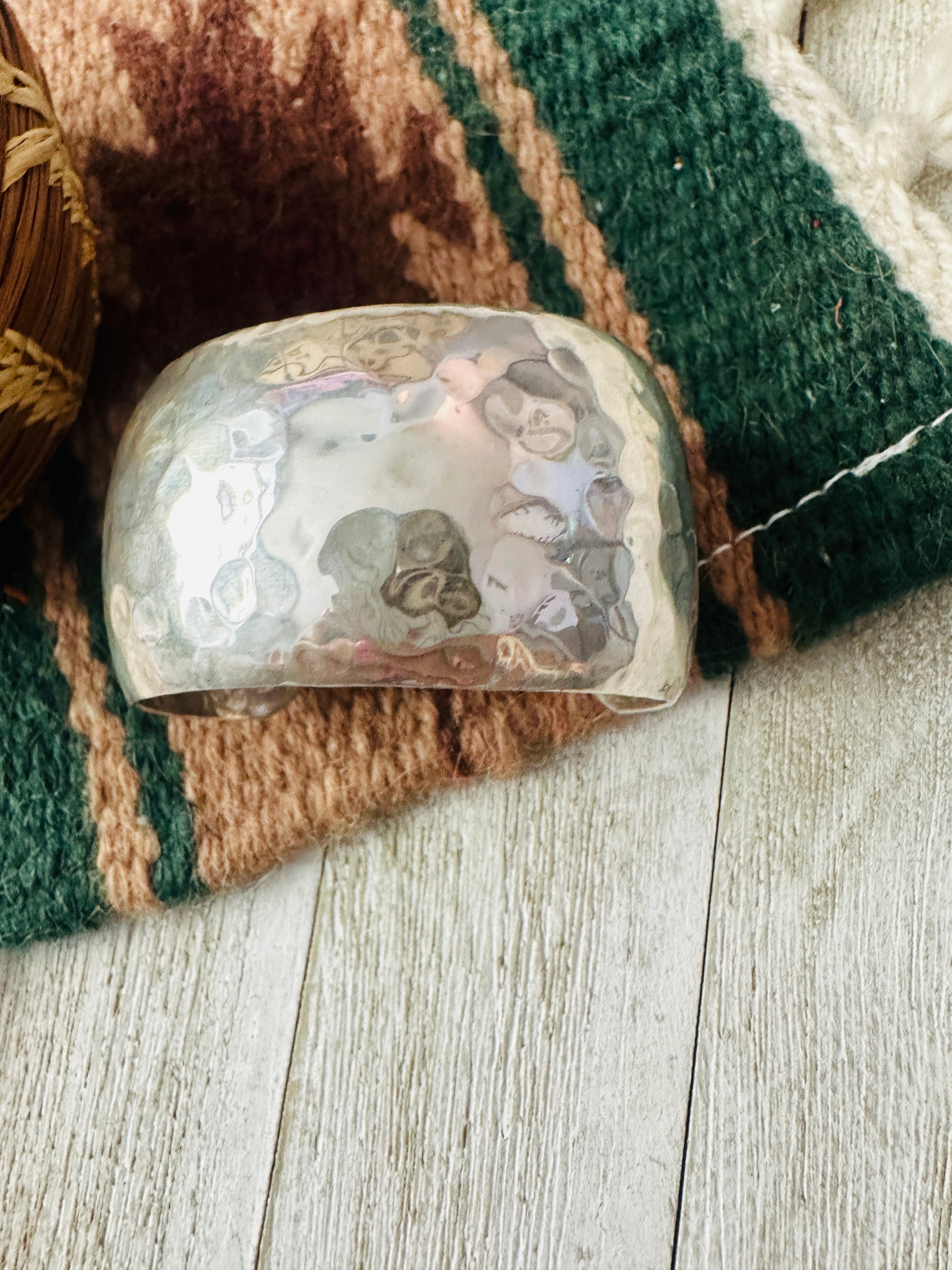 Gorgeous Old Pawn Navajo Hammered Sterling Silver Cuff Bracelet. Such beautiful craftsmanship on this cuff! Cuff has an inside circumference of 5 1/2 inches with an 1 1/2 inch gap. Width is 1 1/2 inches. Stamped Sterling and signed by the artist.