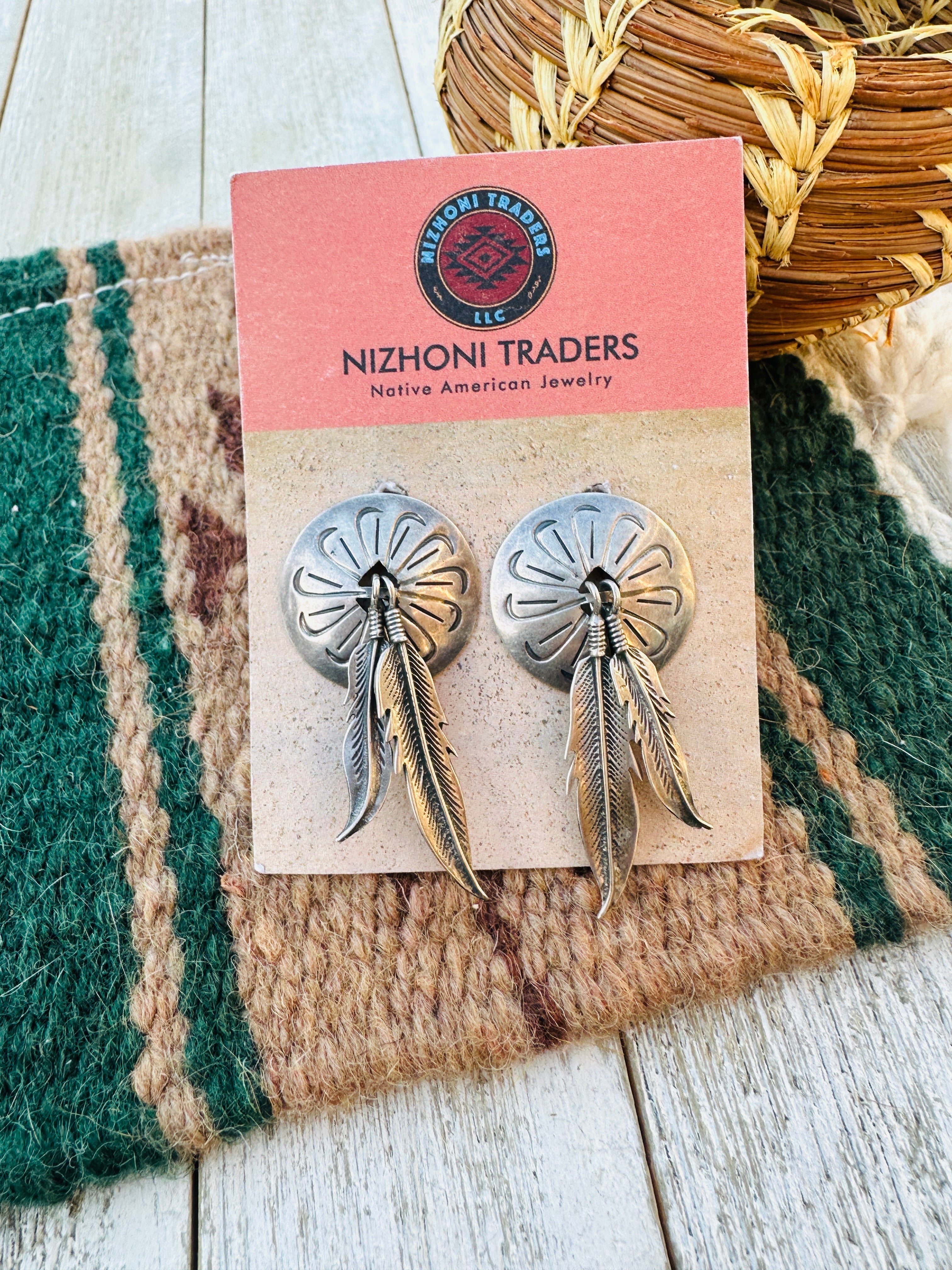 Handcrafted Old Pawn Sterling Silver Feather Concho Dangle Earrings