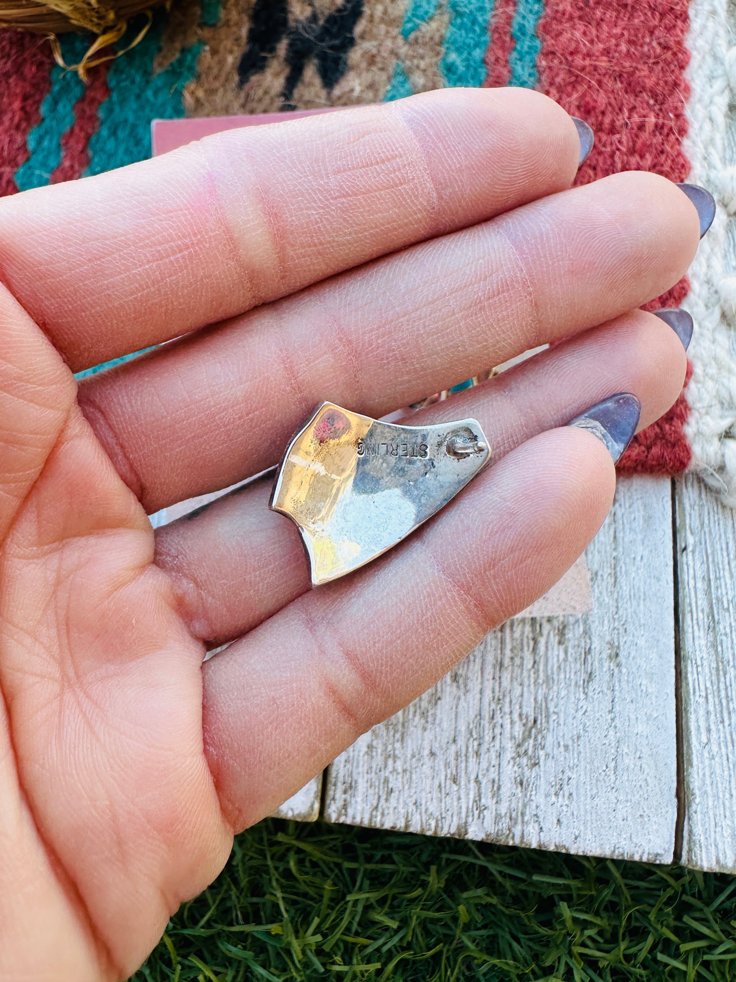 Beautiful Old Pawn Handcrafted Sterling Silver, Spiny Oyster Shell and Turquoise Inlay Post Earrings. These measure 7/8 of an inch long and 3/4 of an inch wide. Stamped Sterling.