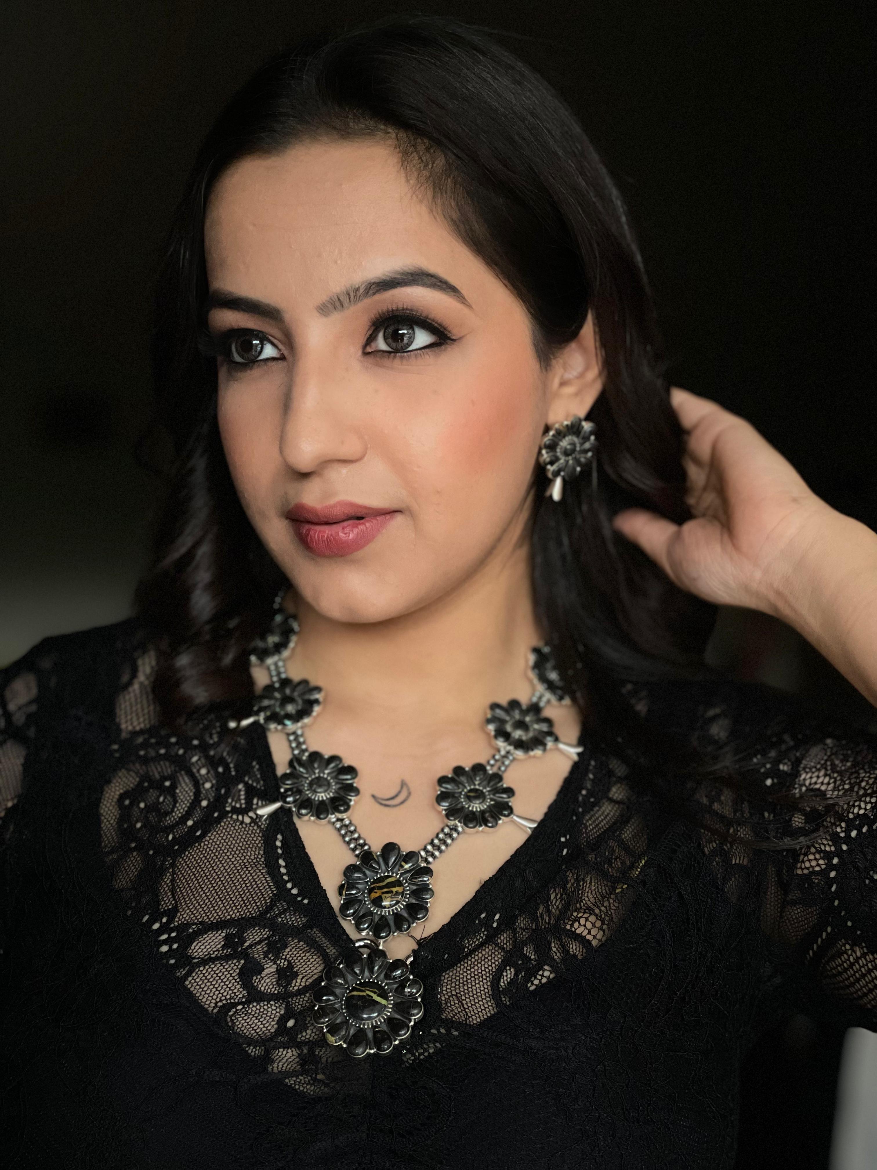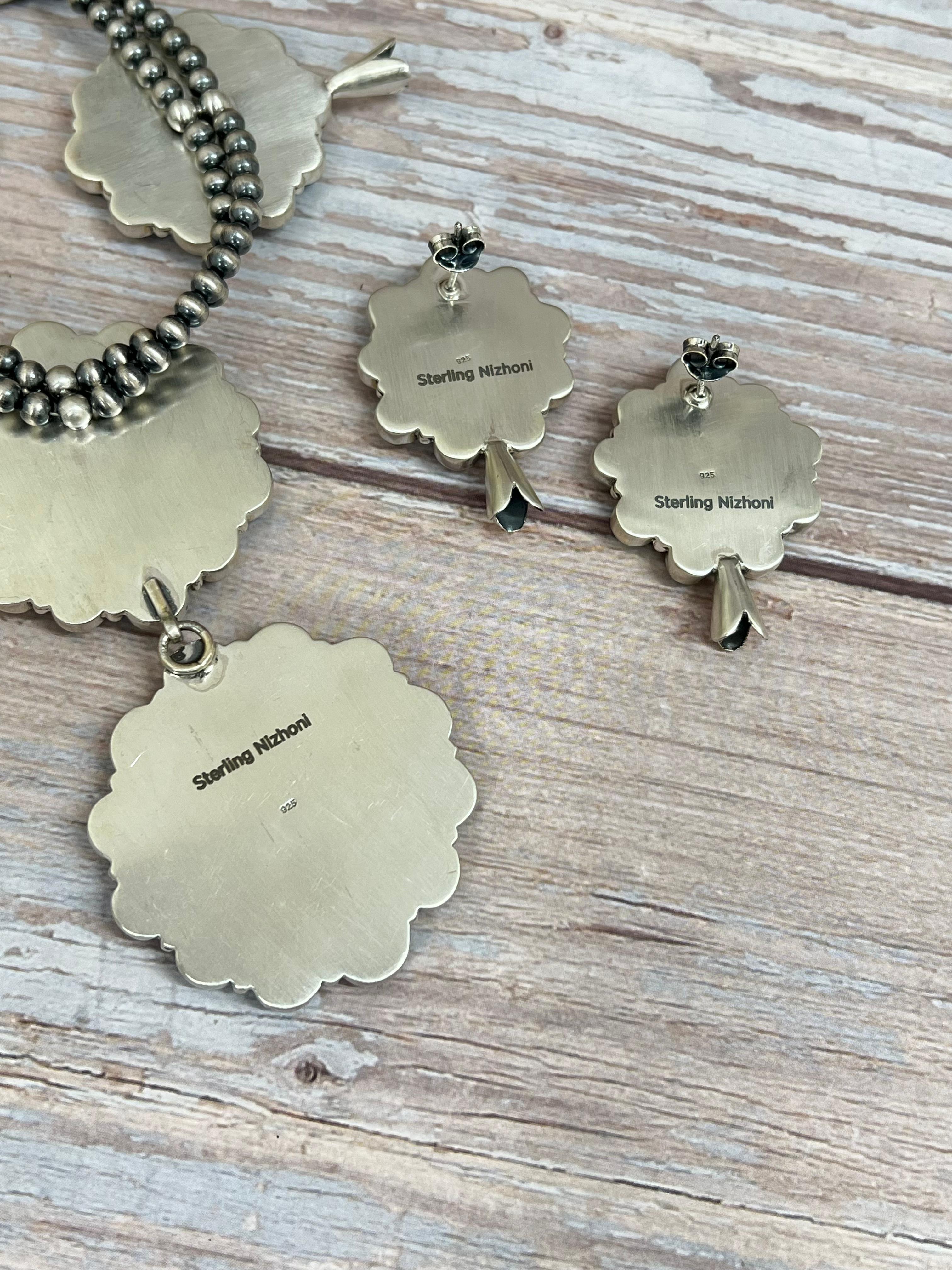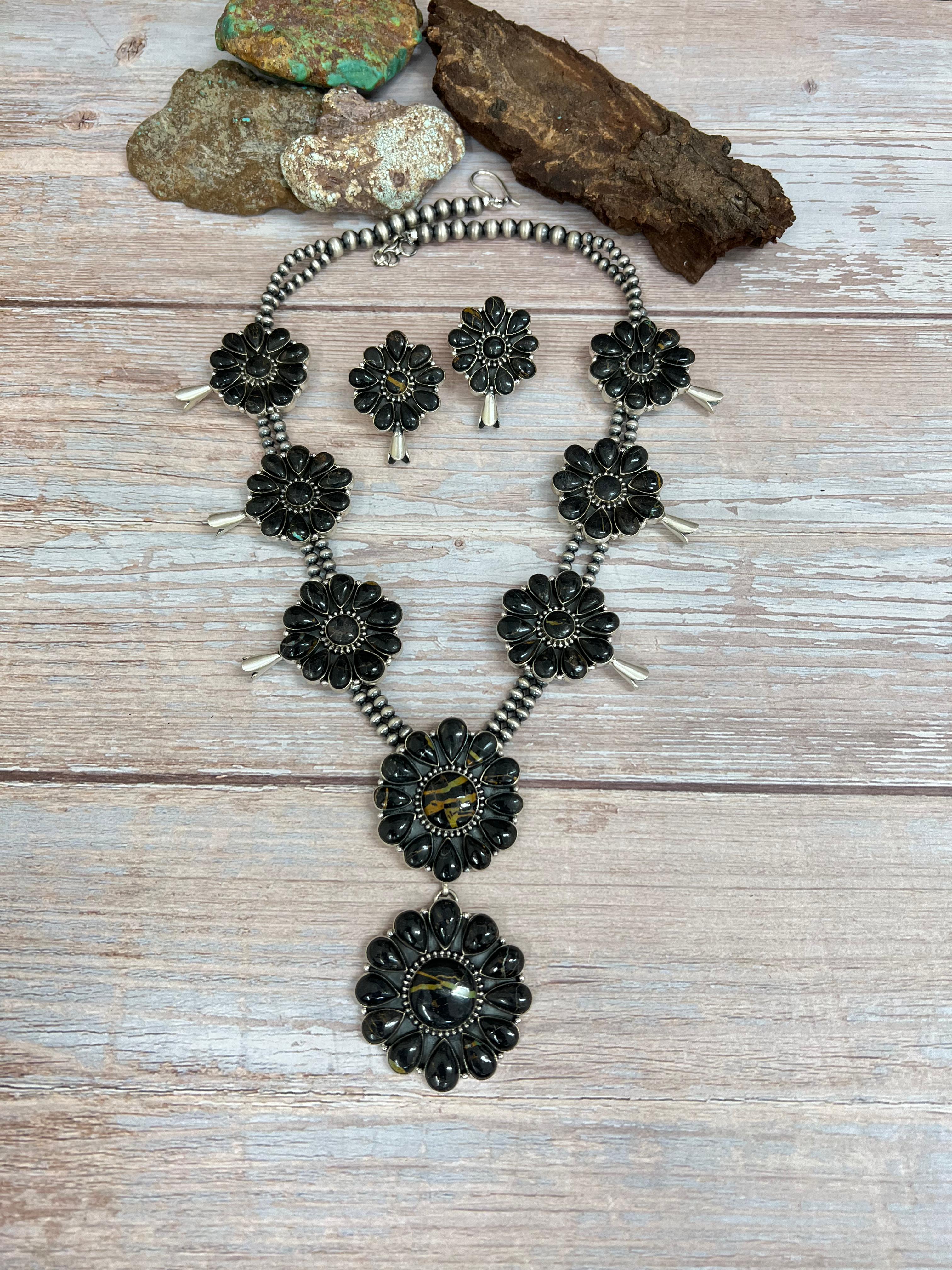 Handmade Sterling Silver Blackjack Turquoise Beaded Blossom Necklace Earrings Set with Signed Nizhoni
