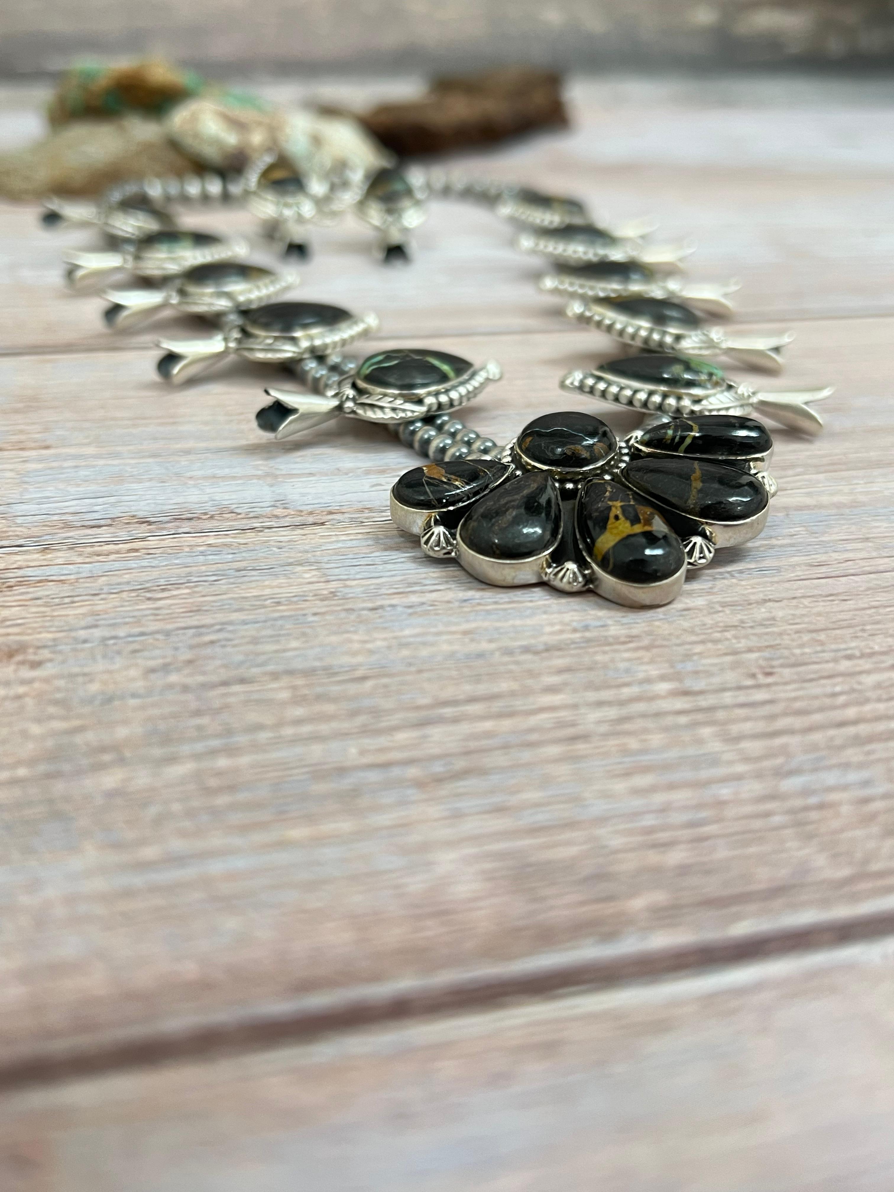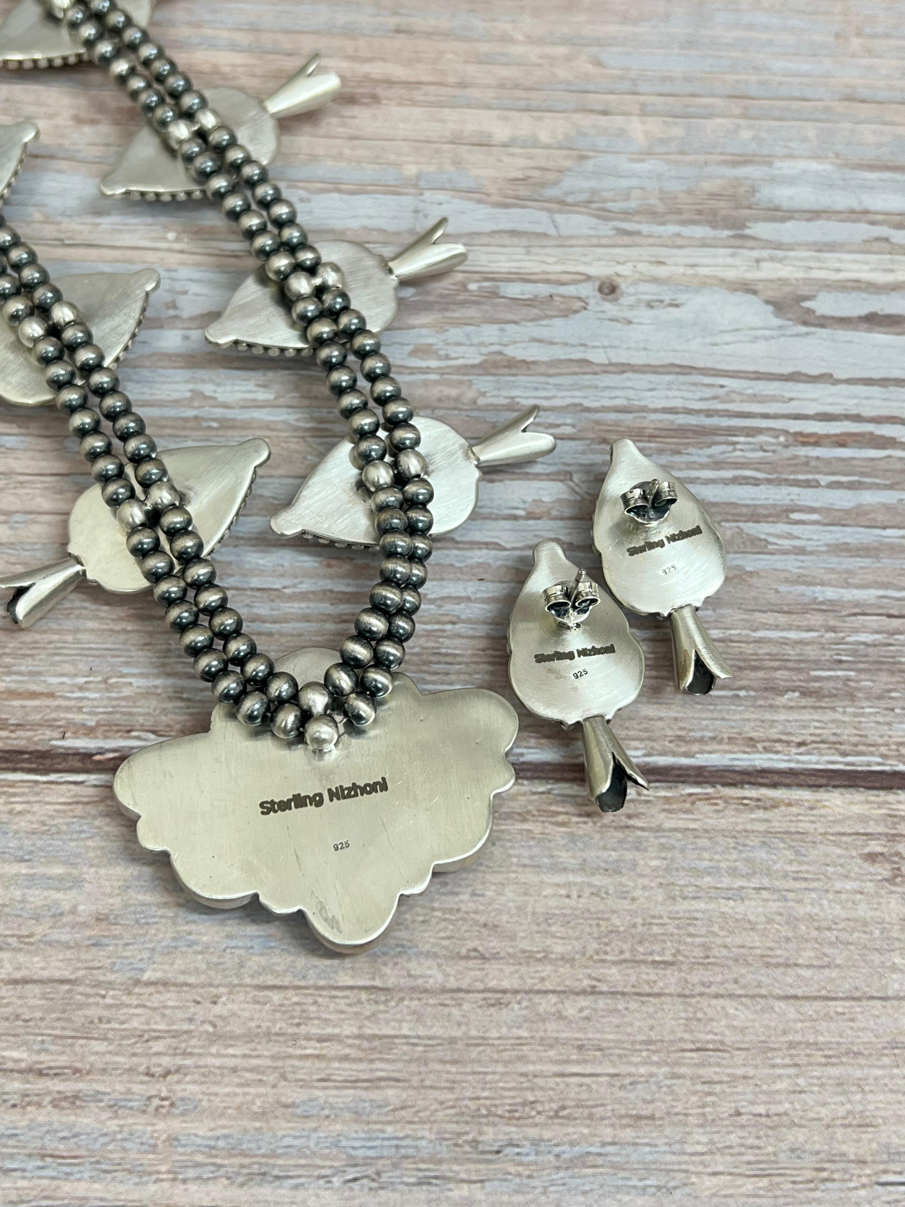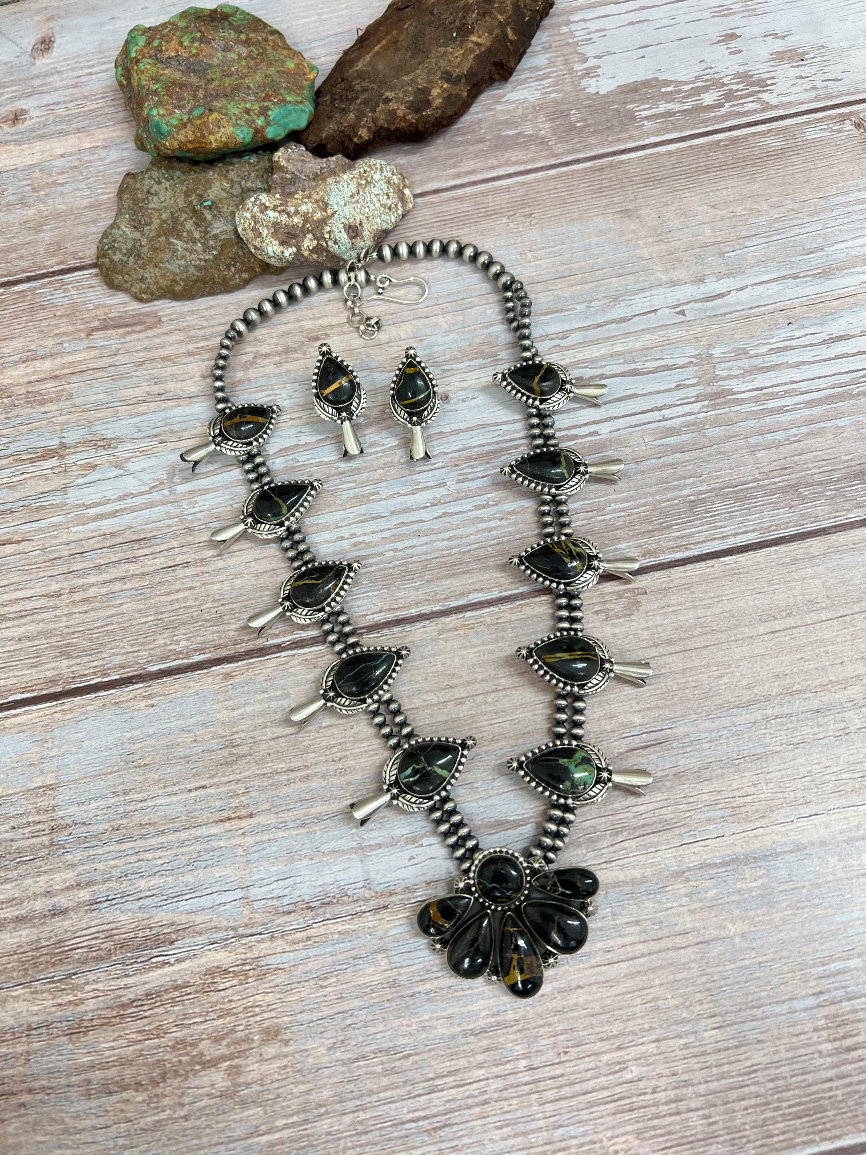 Handmade Sterling Silver Blackjack Turquoise Beaded Necklace Earrings Set with Signed Nizhoni