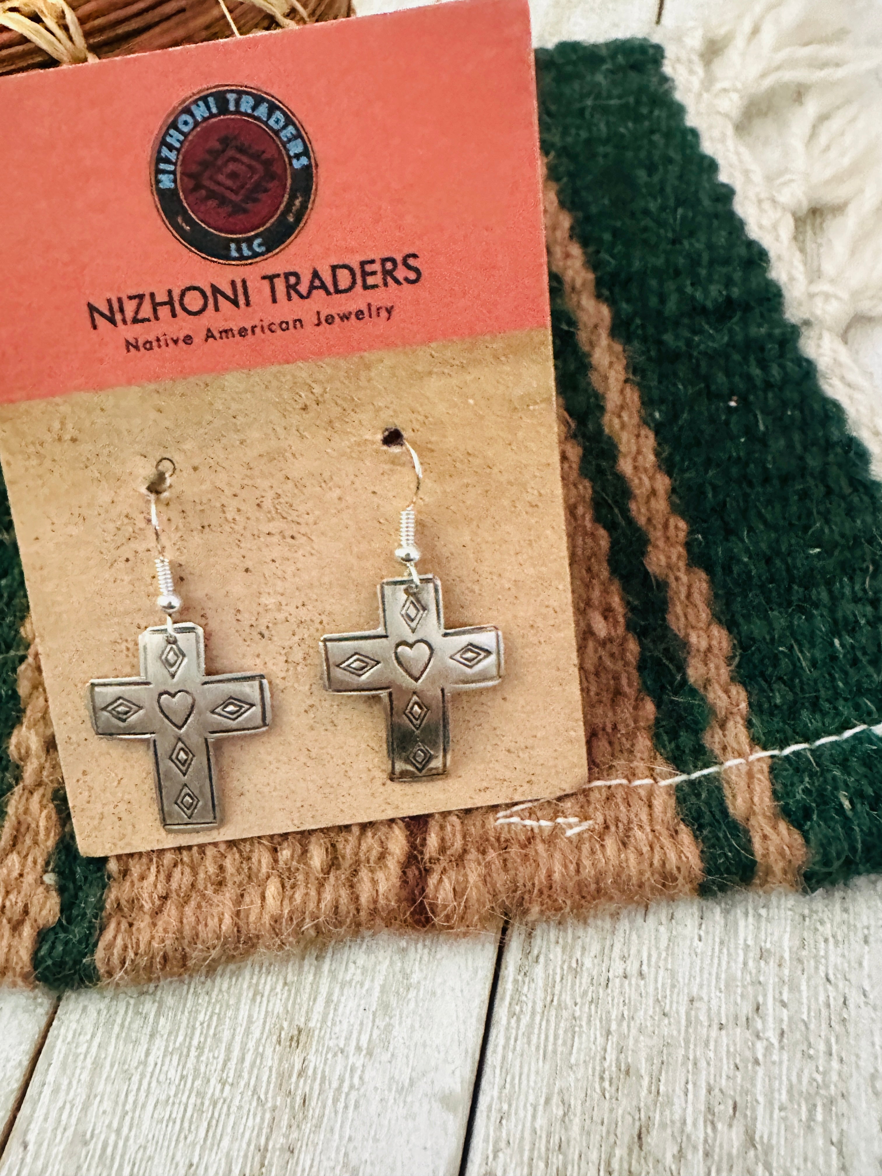 Beautiful Old Pawn Navajo Hand Stamped Sterling Silver Cross Dangle Earrings. Measuring 1 5/8 inches long and 7/8 of an inch wide. Great for everyday use. Stamped Sterling. Really pretty pair!