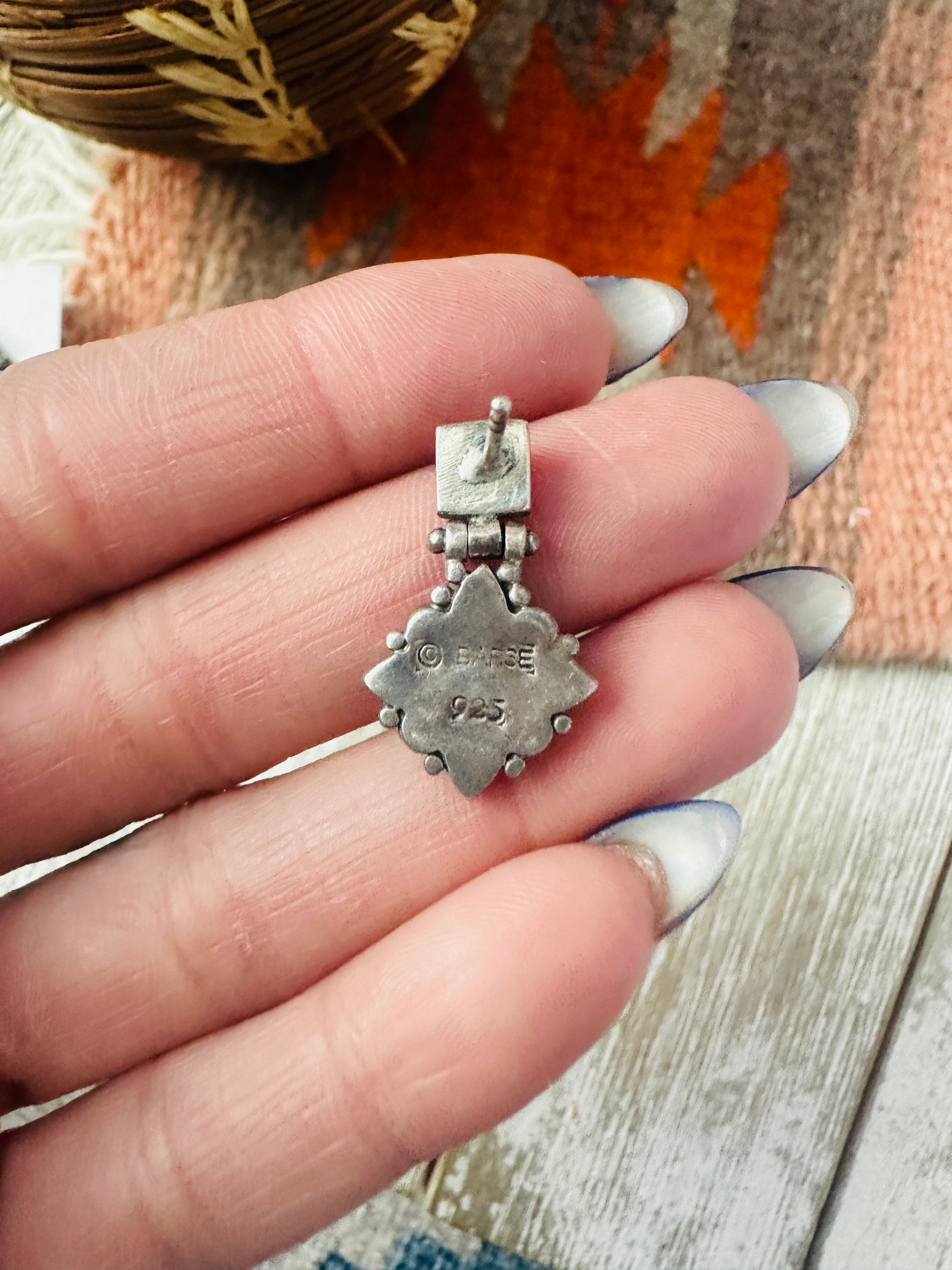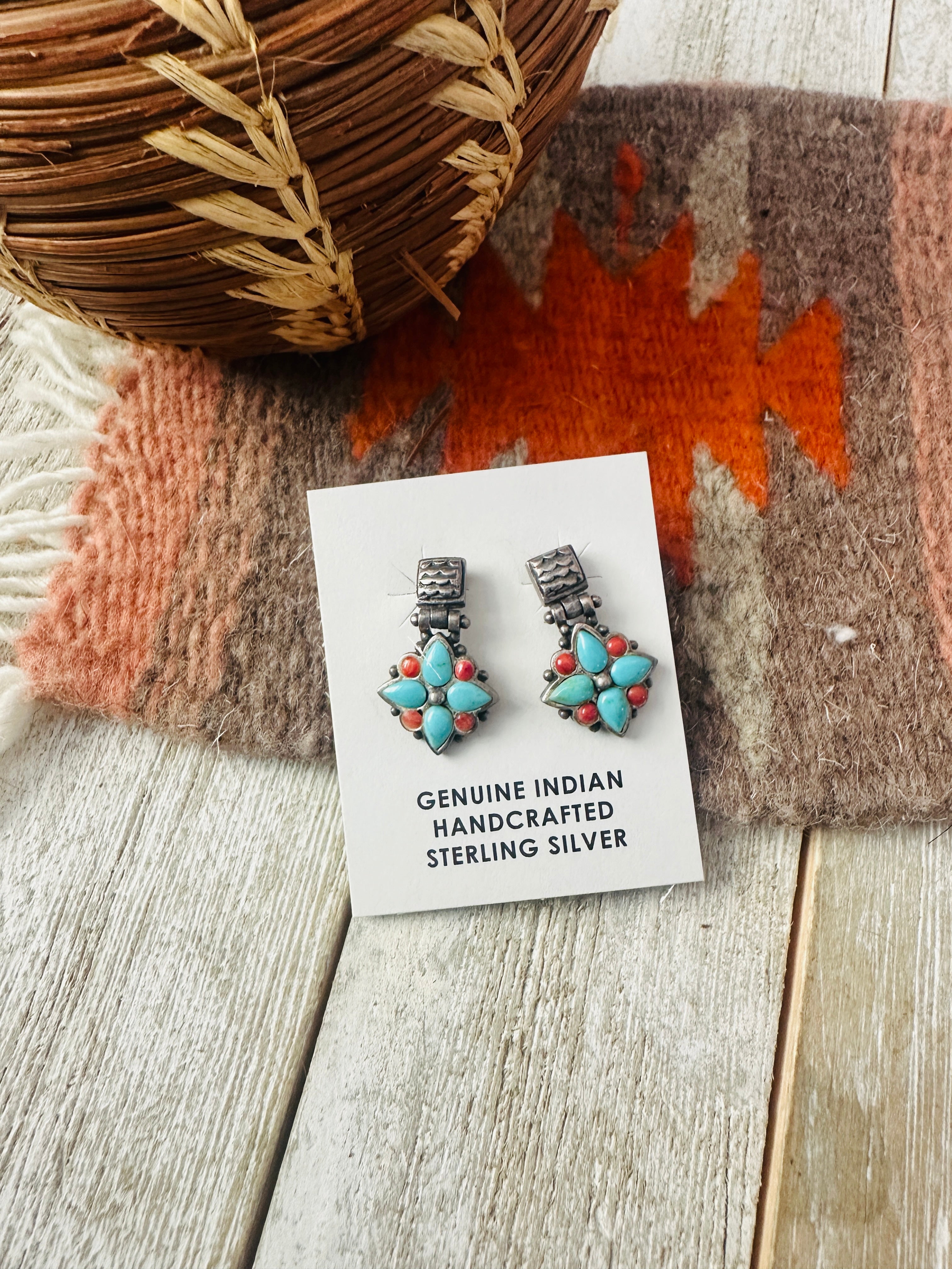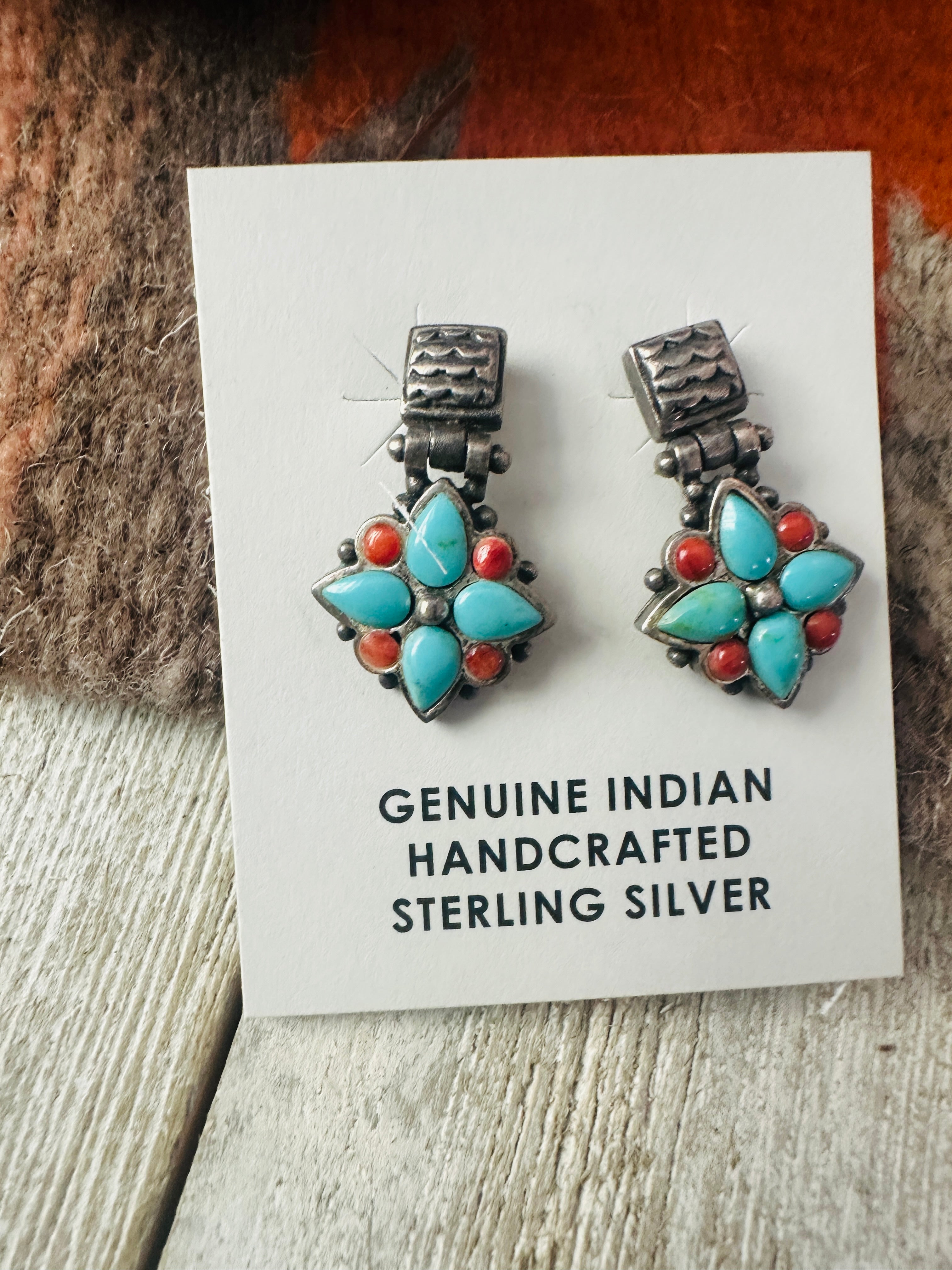 Old Pawn Navajo Sterling Silver, Turquoise & Coral Flower Dangle Earrings