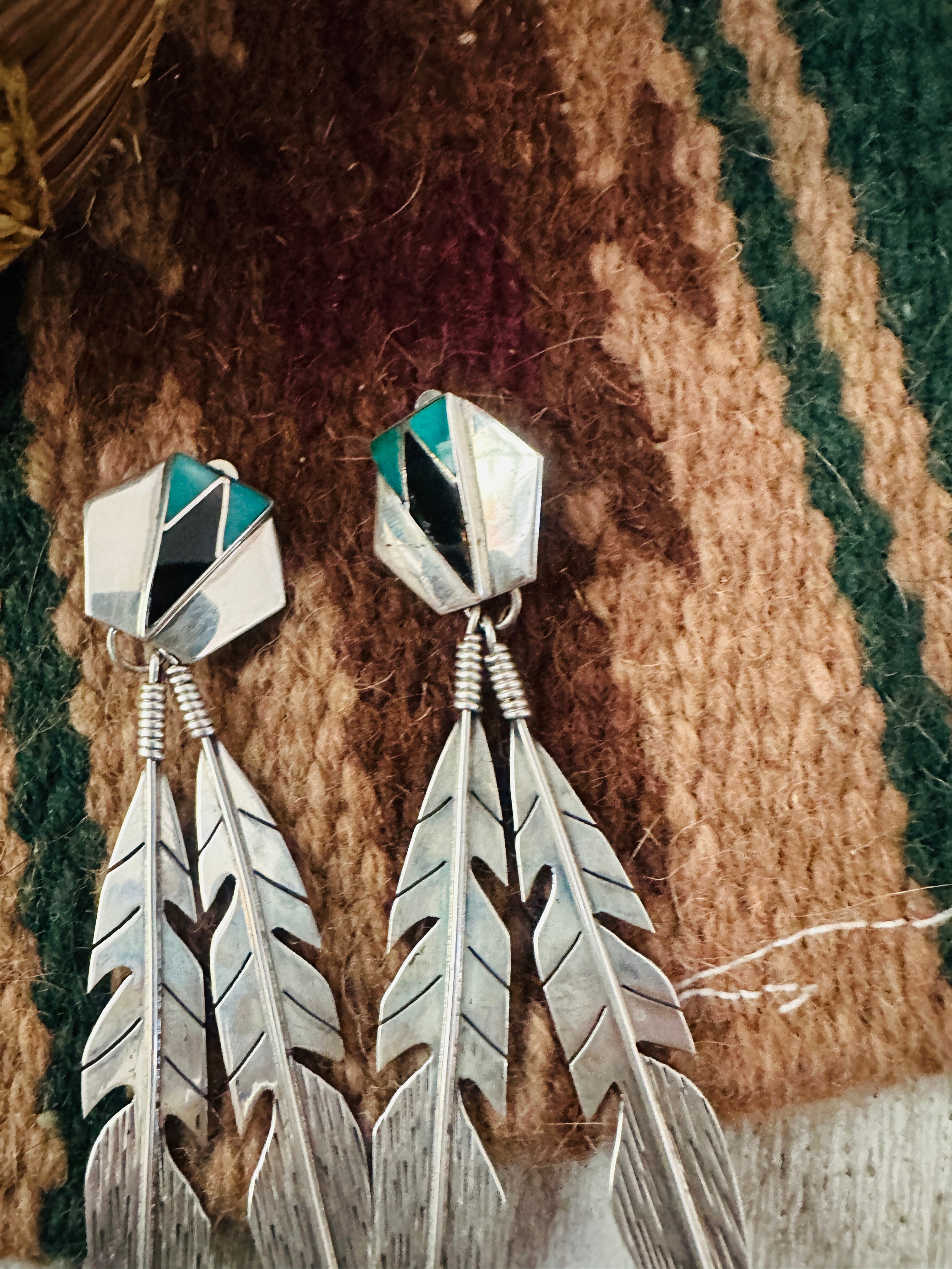 Gorgeous Old Pawn Navajo Sterling Silver, Turquoise and Onyx Inlay Feather Dangle Clip On Earrings. These beauties measure 3 1/4 inches long and 3/4 of an inch wide.
