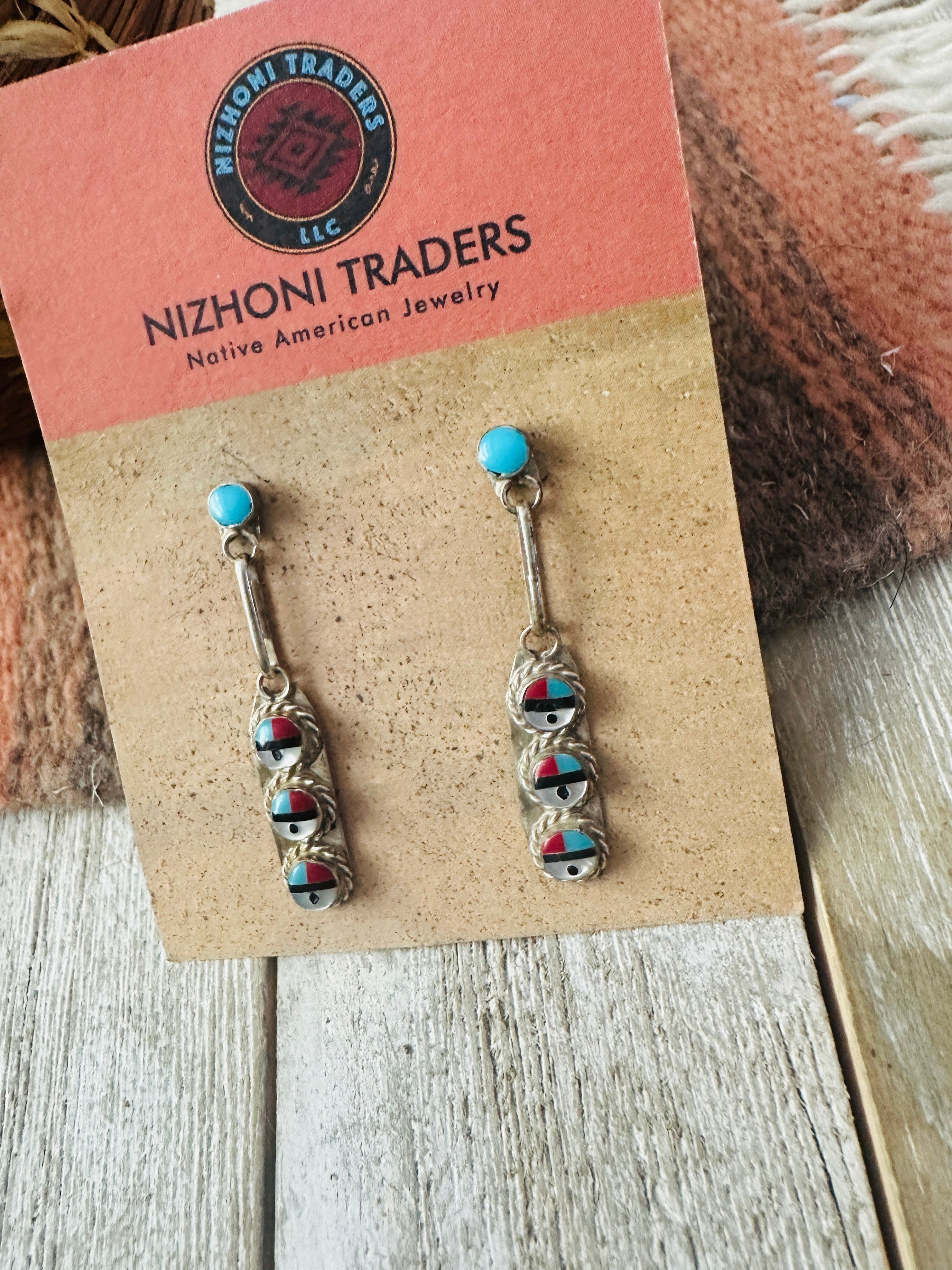 Beautiful Old Pawn Vintage Zuni Sterling Silver and Multi Stone Inlay Sun Face Dangle Earrings. Such amazing craftsmanship! These earrings measure 1 5/8 inches long and 1/4 of an inch wide.