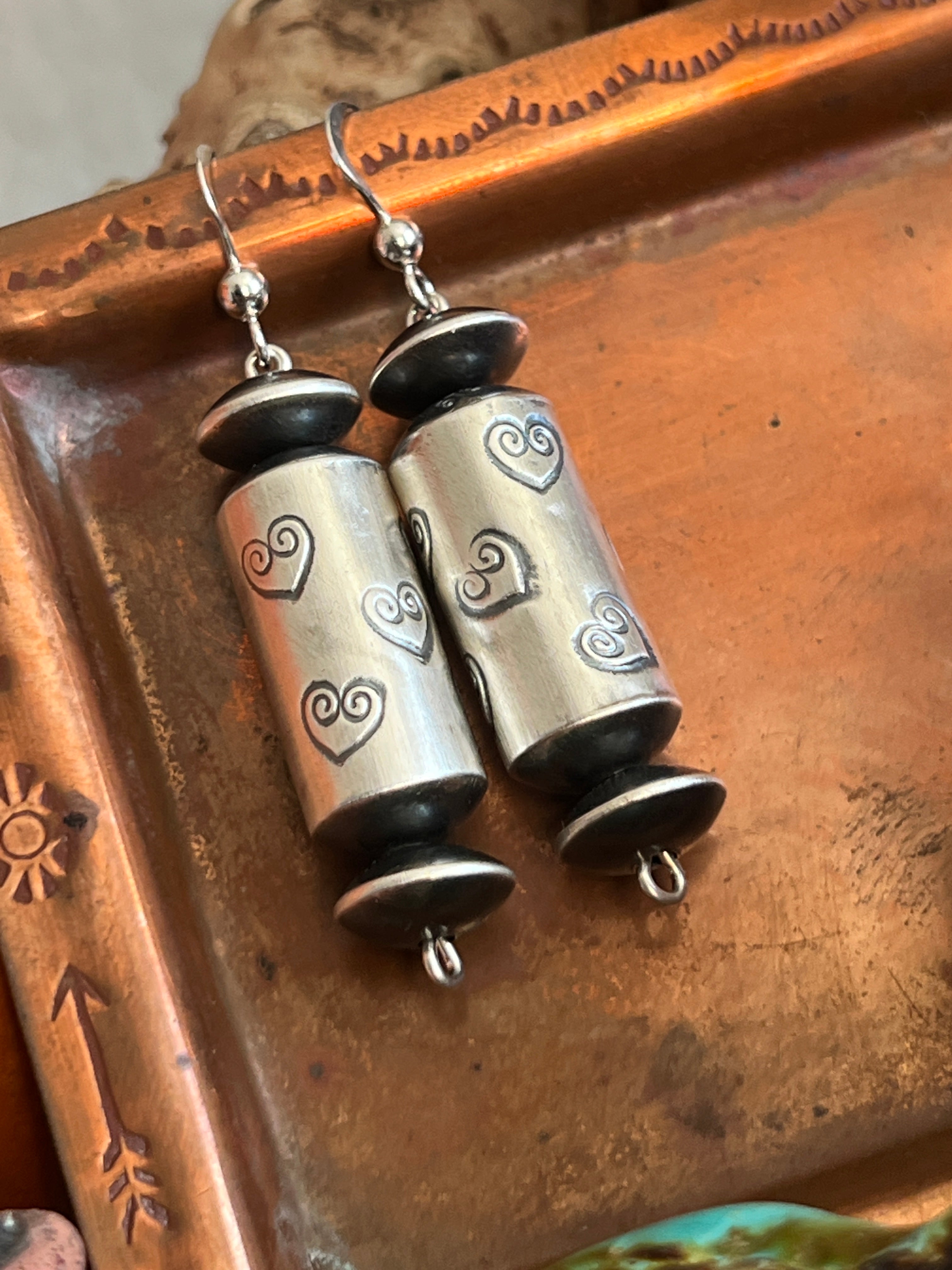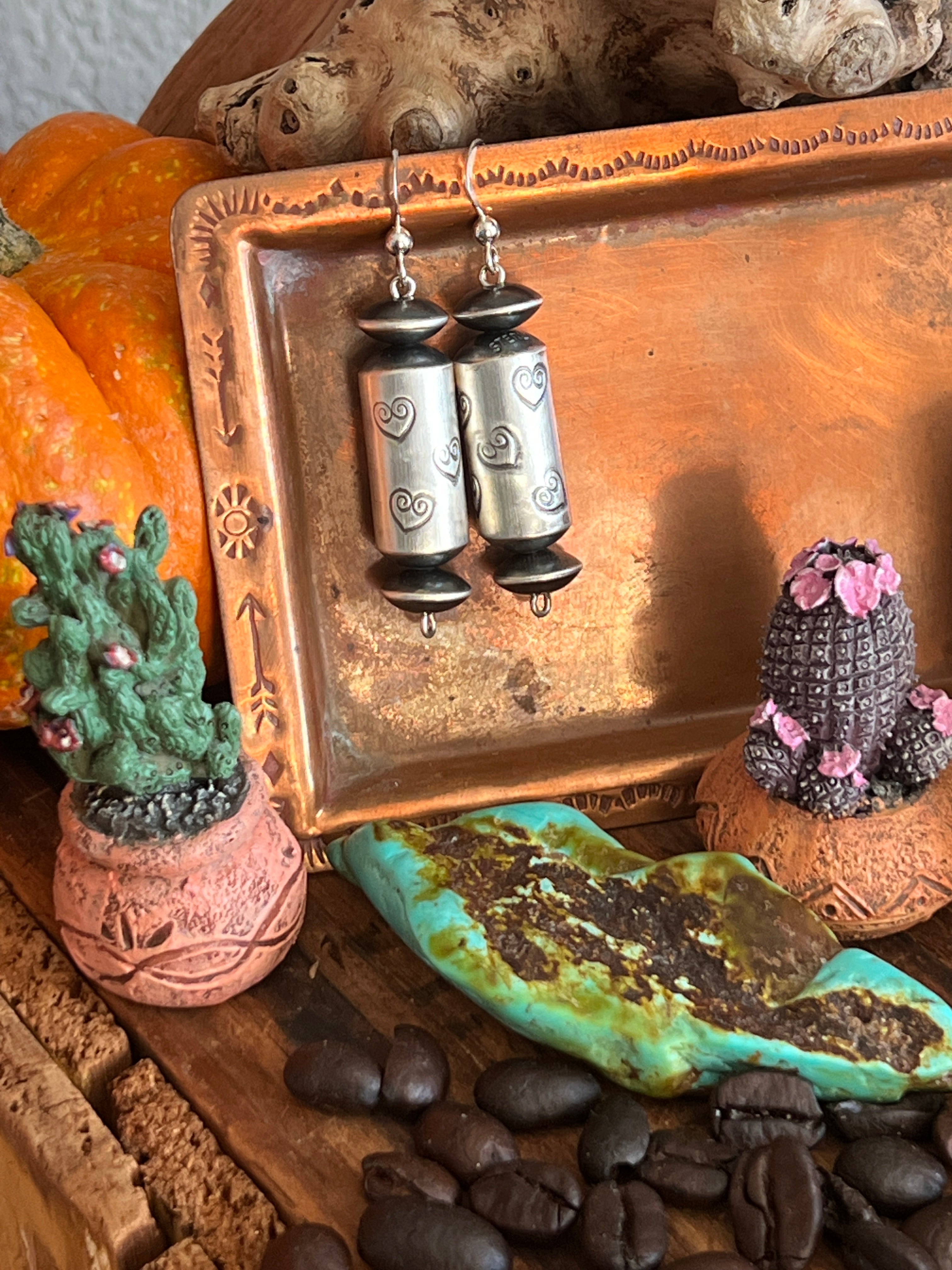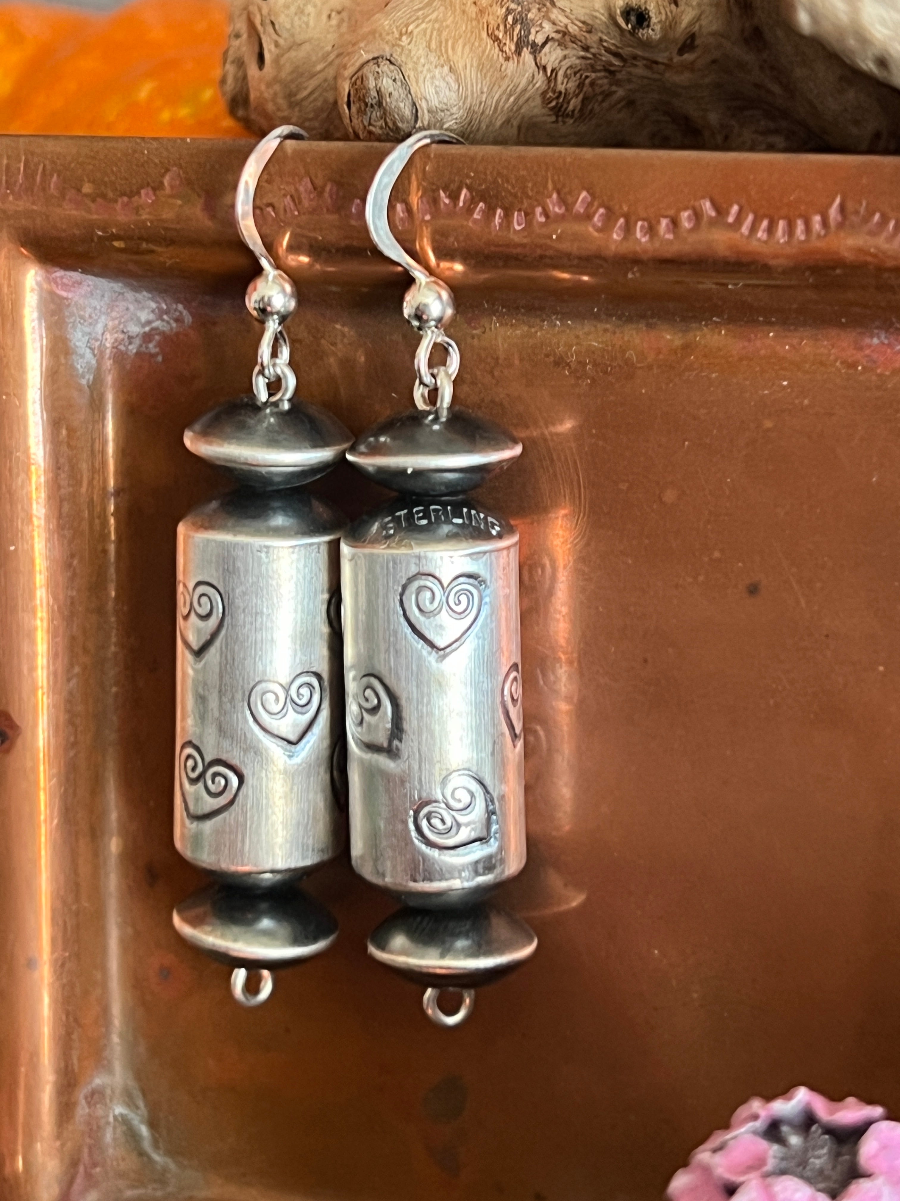Sterling Silver Handcrafted Heart Stamped Barrel Bead Drop Dangle Earrings by Preston Haley