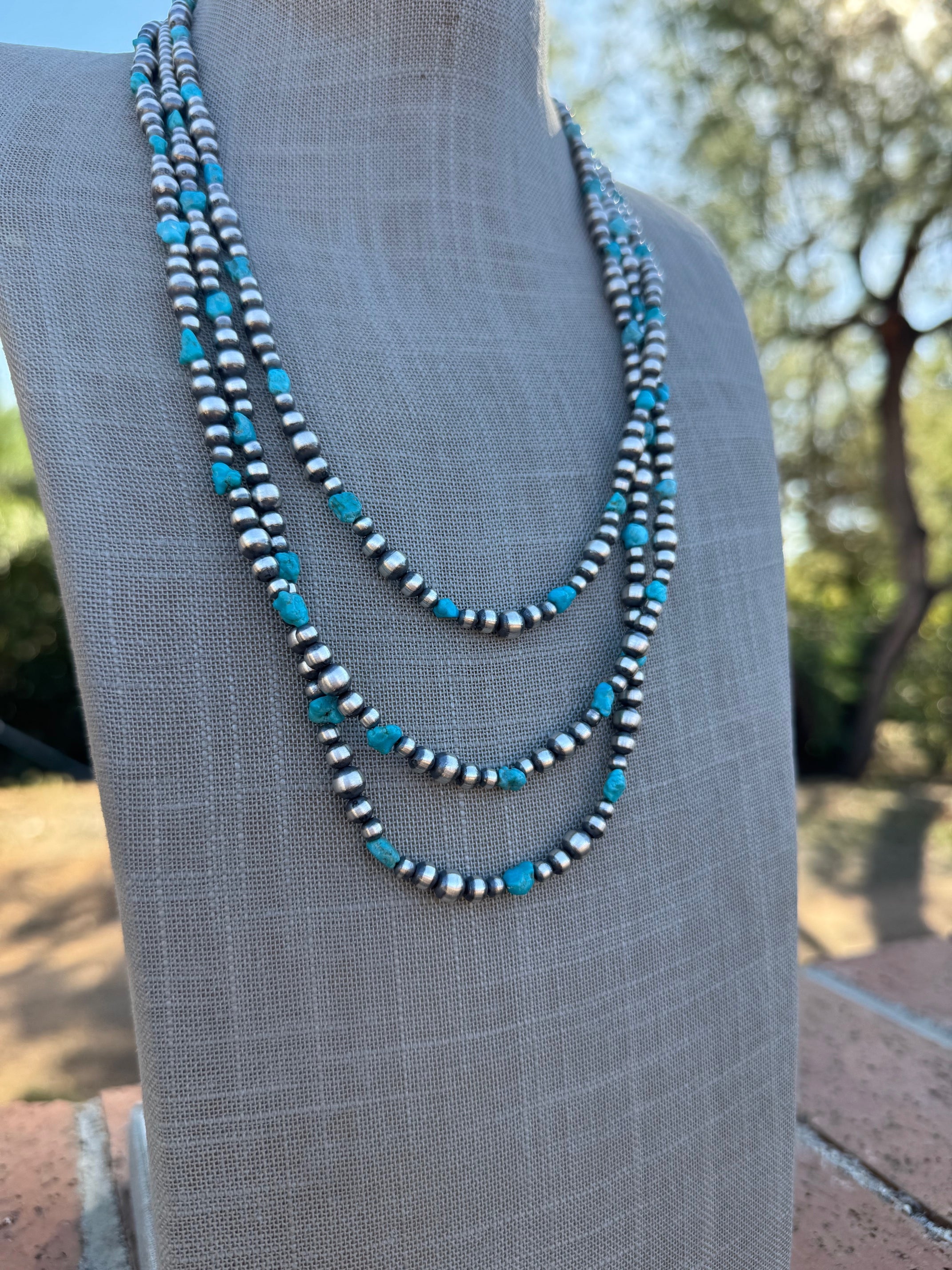 Handcrafted Kingman Turquoise & Sterling Silver Pearl 4-6mm Beaded Necklace 72"