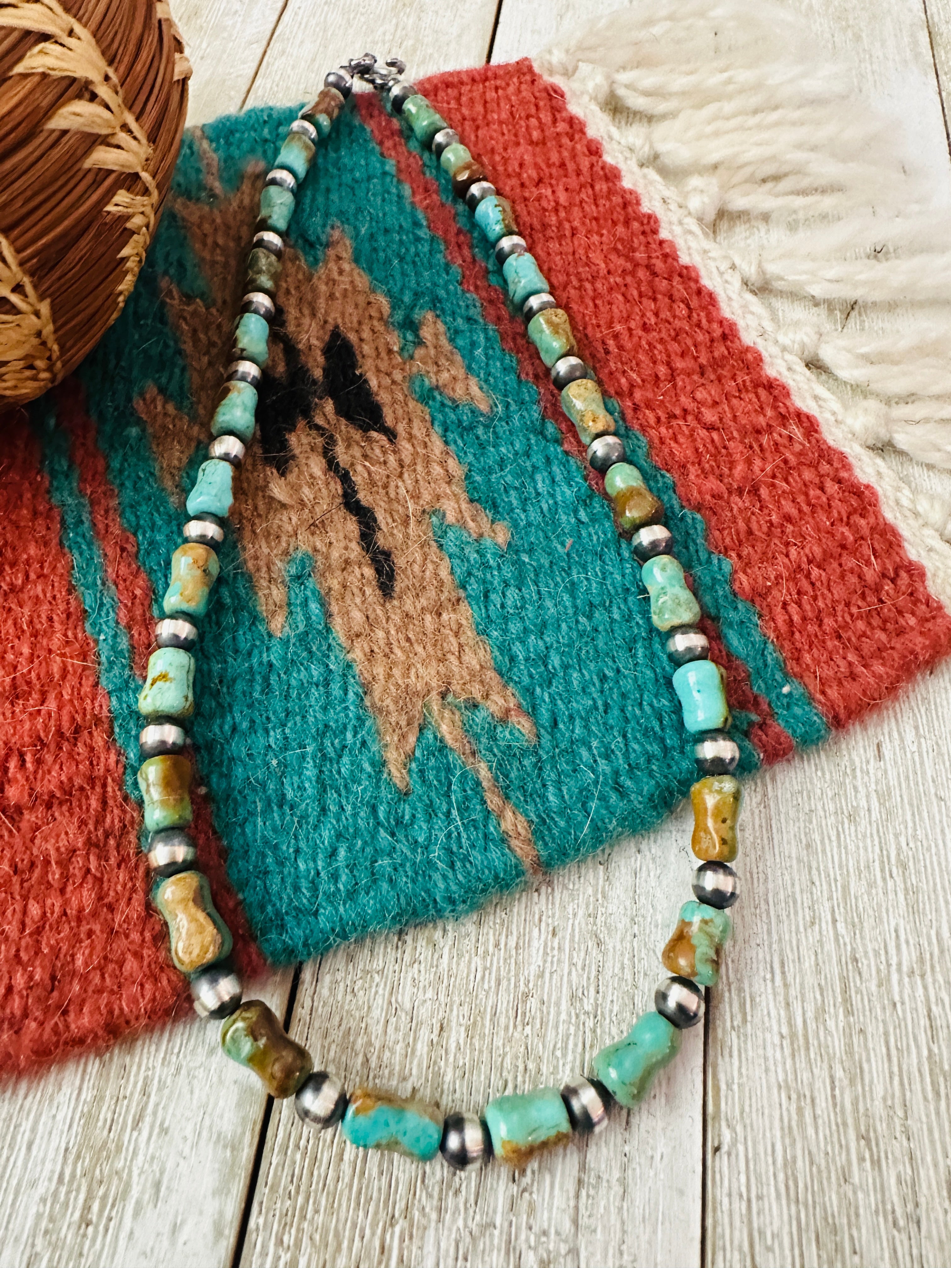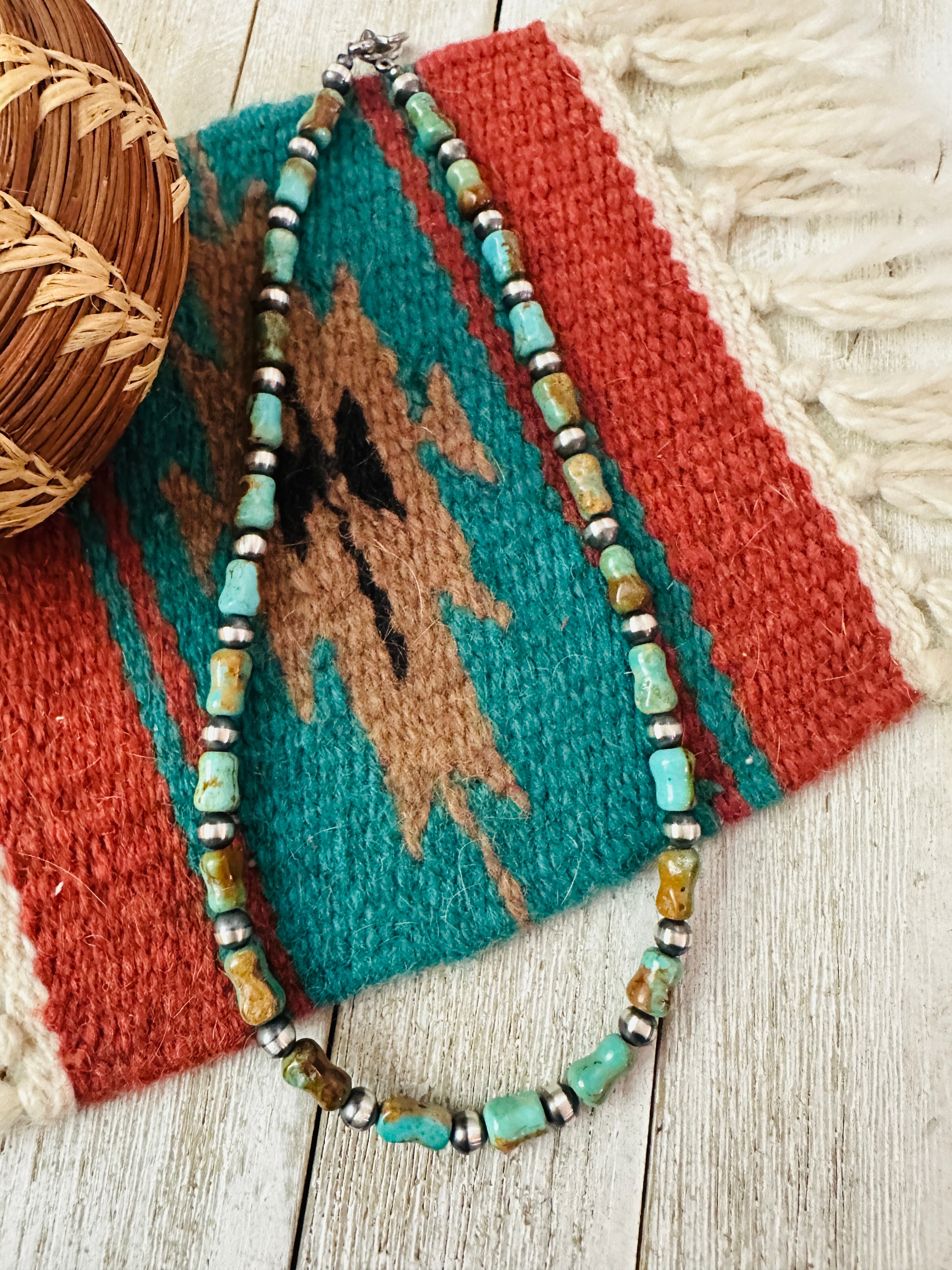 Handcrafted Kingman Turquoise & Sterling Silver Pearl 6mm Beaded Necklace 18"