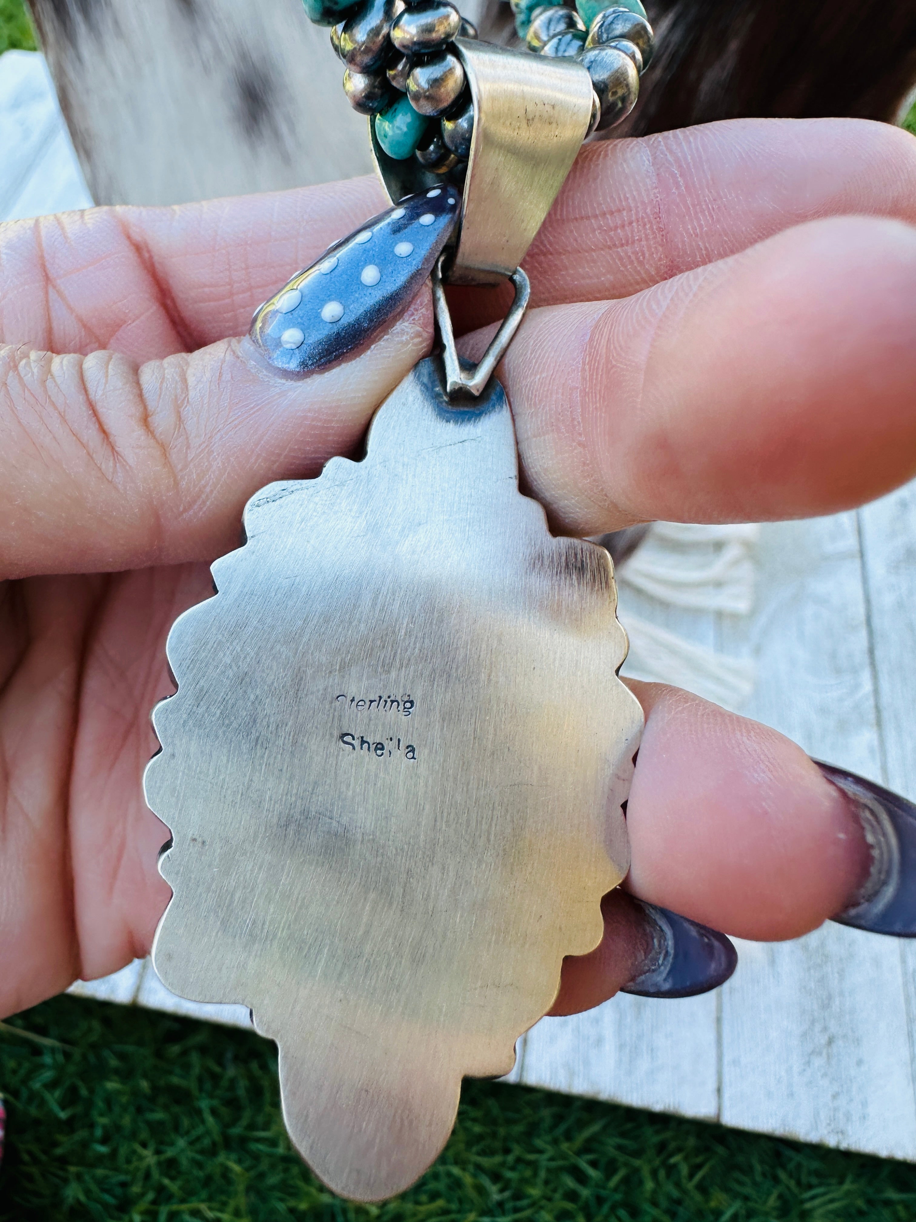 Beautiful Handcrafted Turquoise and Sterling Silver Pearl Beaded Necklace. Beads measure 18 inches long. Pendant measures 3 1/8 inches long and 1 3/8 inches wide. Signed by the artist Sheila Becenti and stamped Sterling. Such a cool piece!