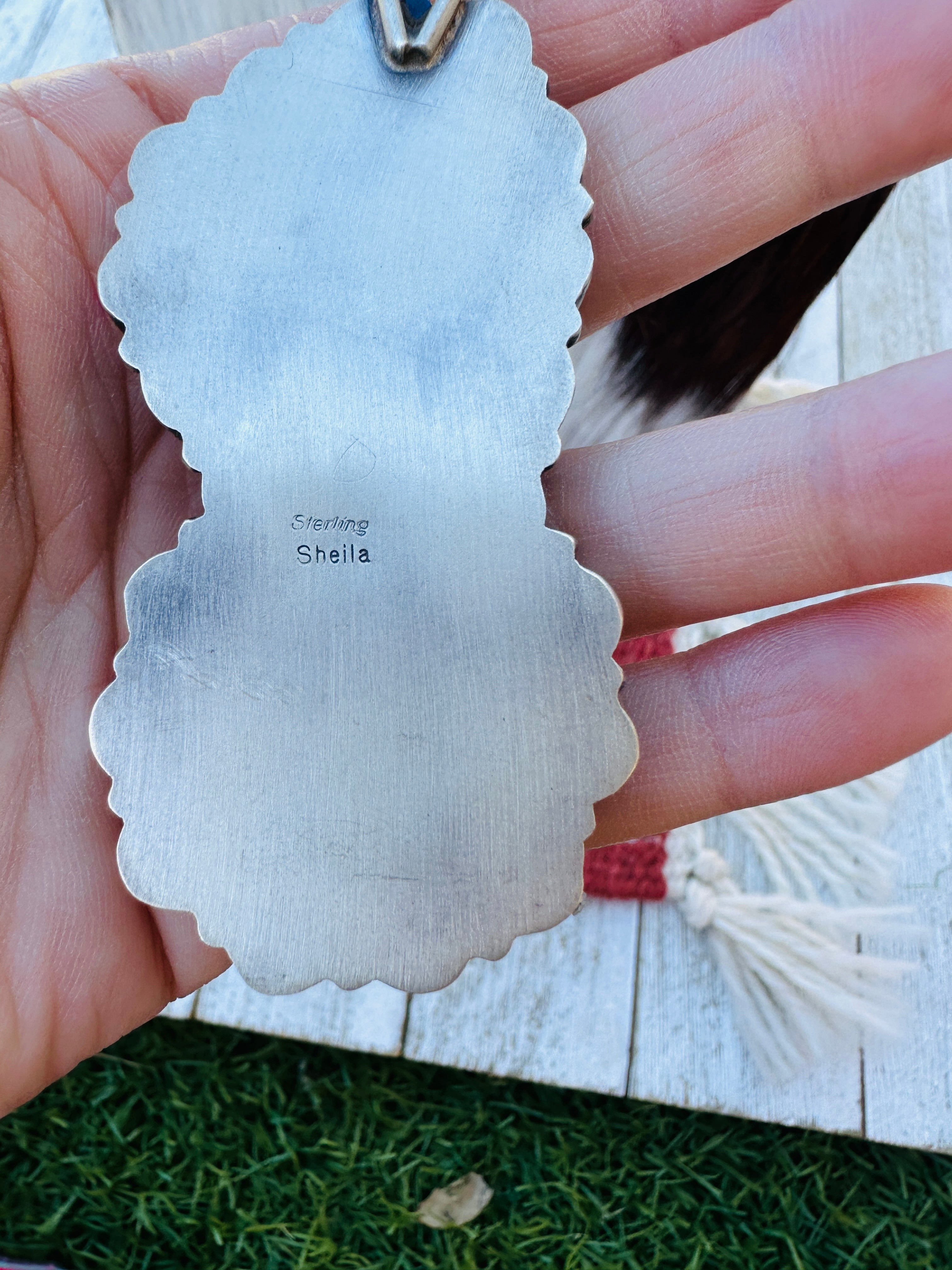 Beautiful Handcrafted Spiny Oyster Shell, Turquoise and Sterling Silver Pearl Beaded Necklace. Beads measure 18 inches long with 2 1/2 inch extender. Pendant measures 4 inches long and 1 1/2 inches wide. Signed by the artist Sheila Becenti and stamped Sterling. Such a cool piece!