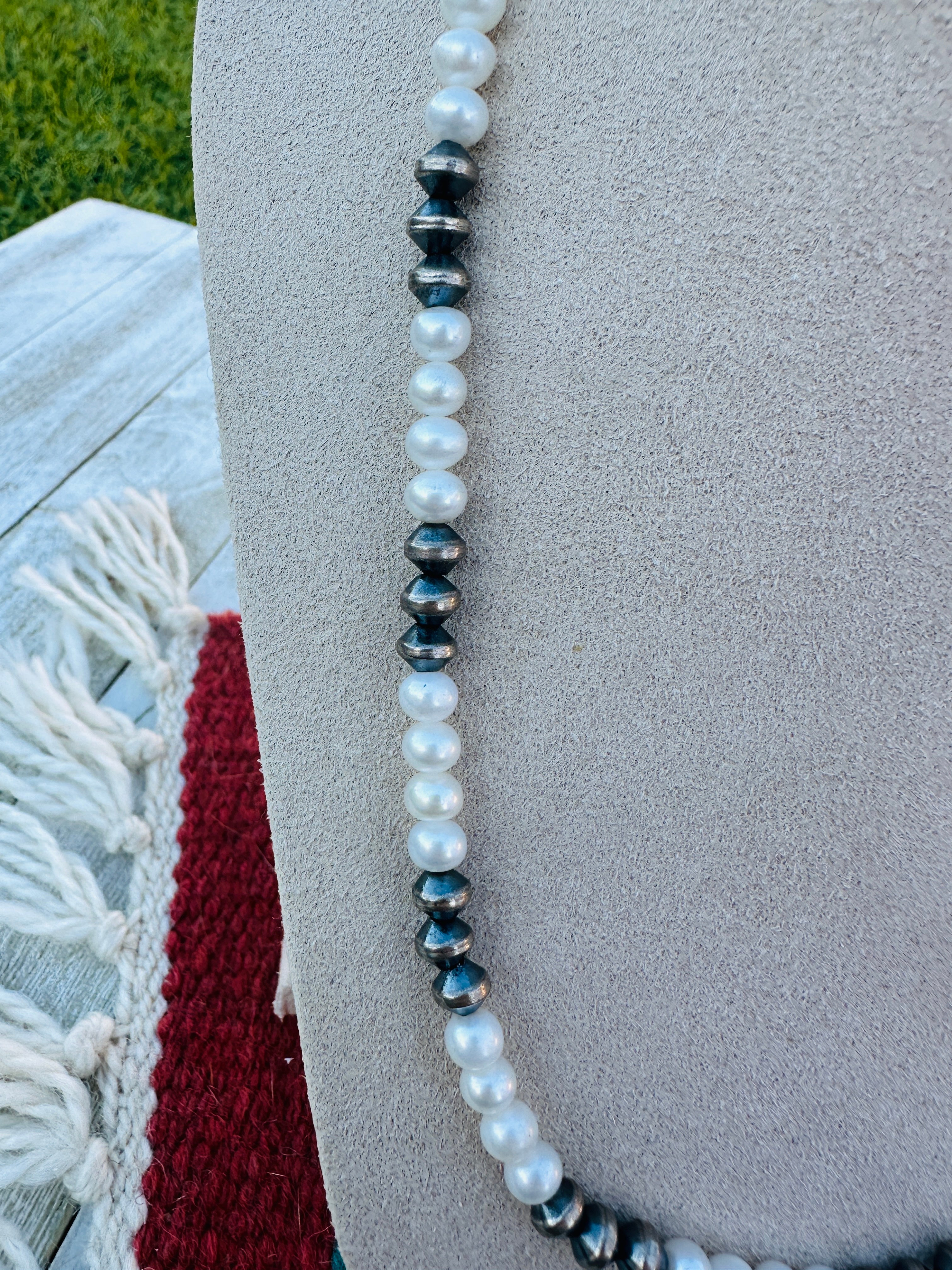 This is a beautiful Sterling Silver Pearl and Freshwater Pearl beaded necklace. Amazing craftsmanship! A lovely piece for every collection. Measures 18 inches long + 2” extender. Great piece for the layered look.