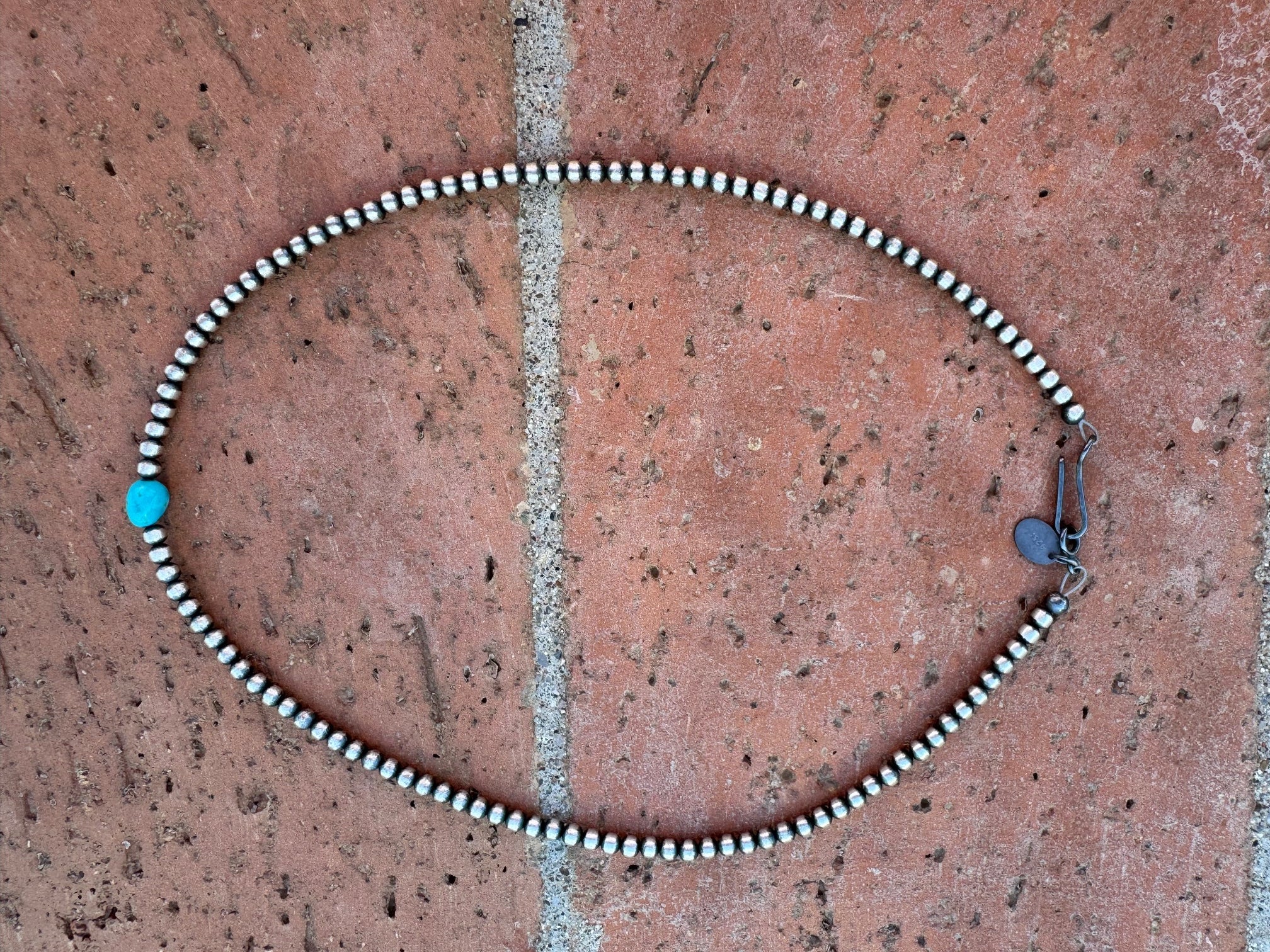 Beautiful Handcrafted Turquoise & 3mm Sterling Silver Pearl Beaded Necklace. Measures 14, 16, 18, and 20 inches long. Such a pretty piece! This listing is for 1 strand only, multiple strands is for photos only.