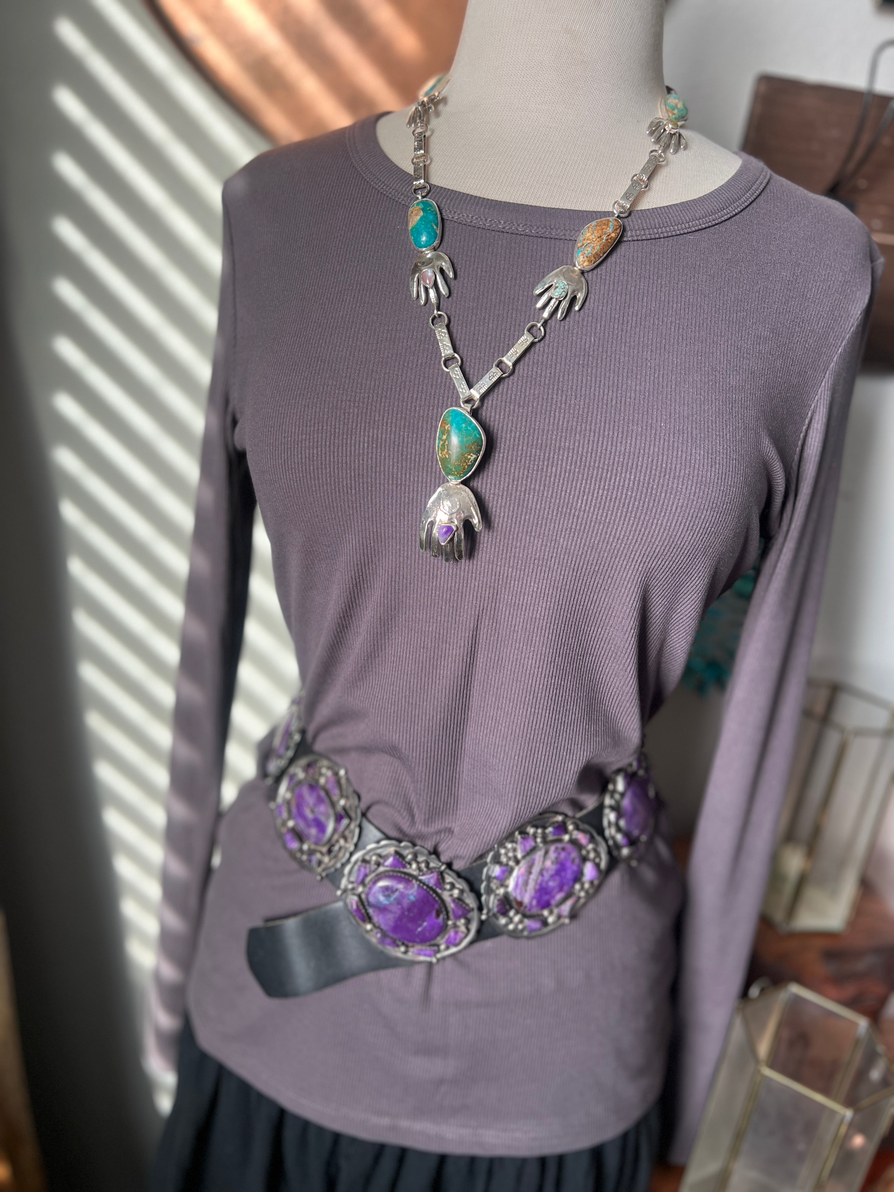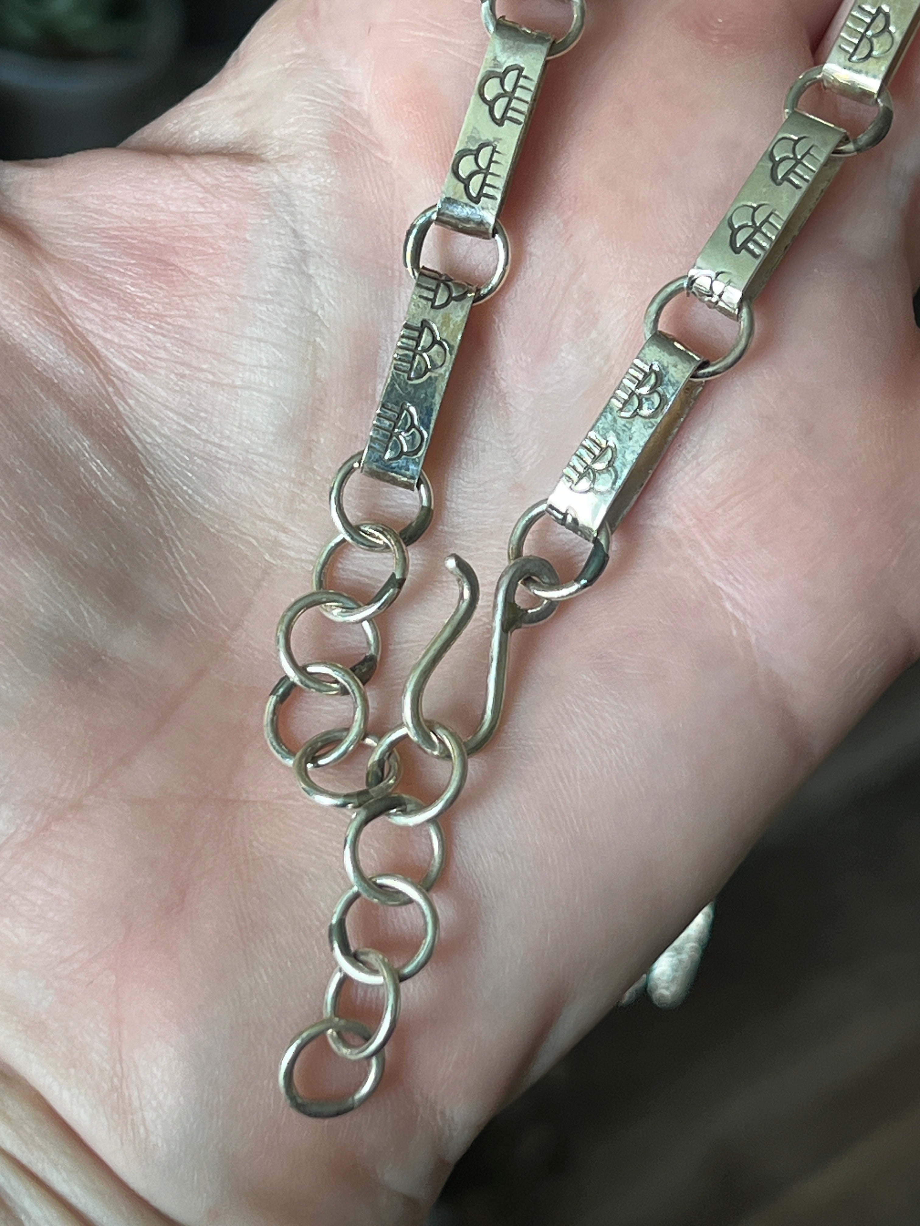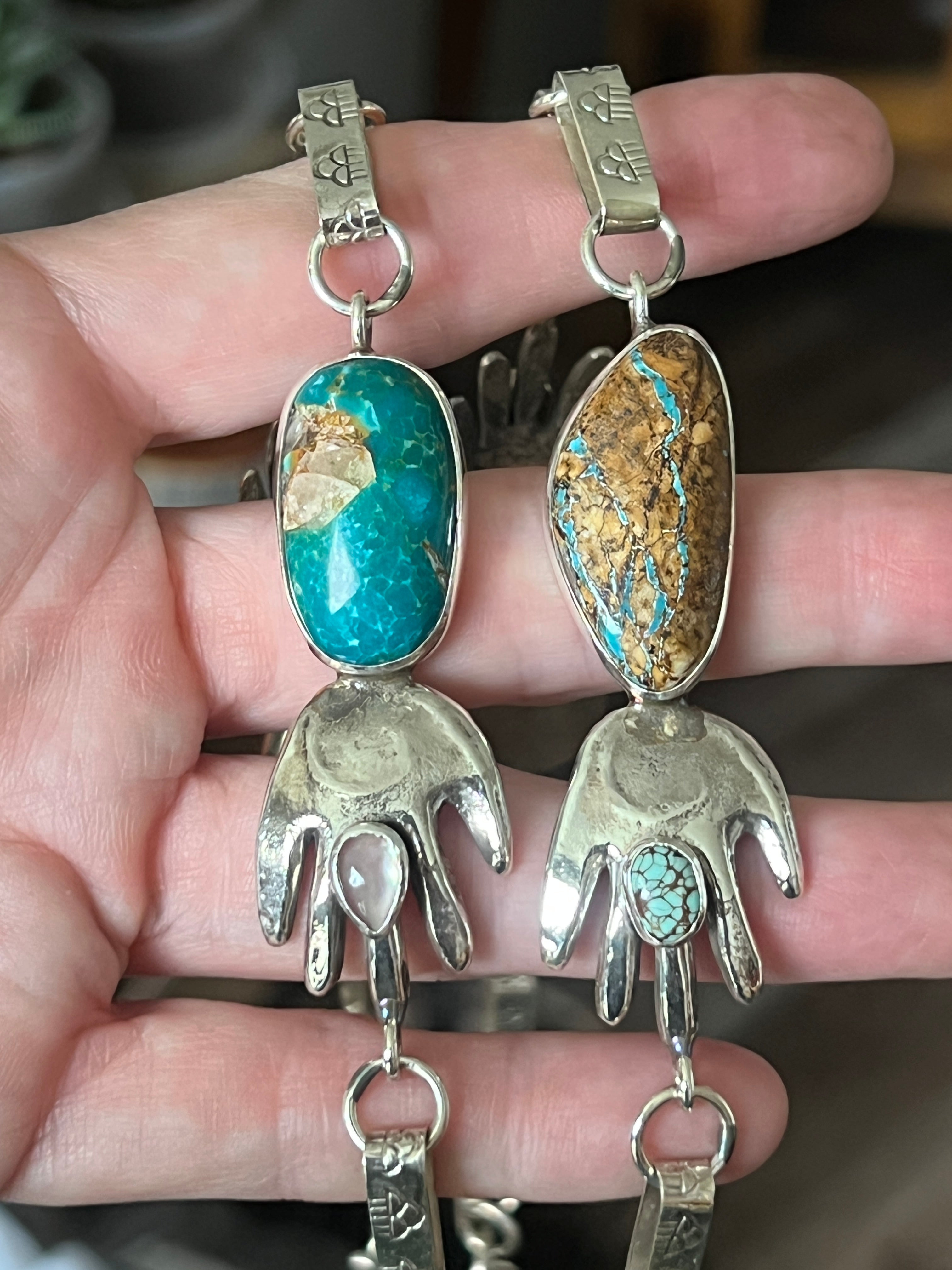 This gorgeous healing hand necklace features four tufa cast hand links stationed between monsoon stamped chain links with a larger removable hand pendant front and center. The necklace measures 24-1/2 inches plus an additional 2 inch extension chain for moderate adjustment. The side hand pieces are each 2-1/2 inches long while the removable center pendant measures 3 inches long. Even better? Each hand shows off its own gemstone ring. This beauty definitely belongs in your collection. Made by New Mexico artist, Jay Leon Coriz.