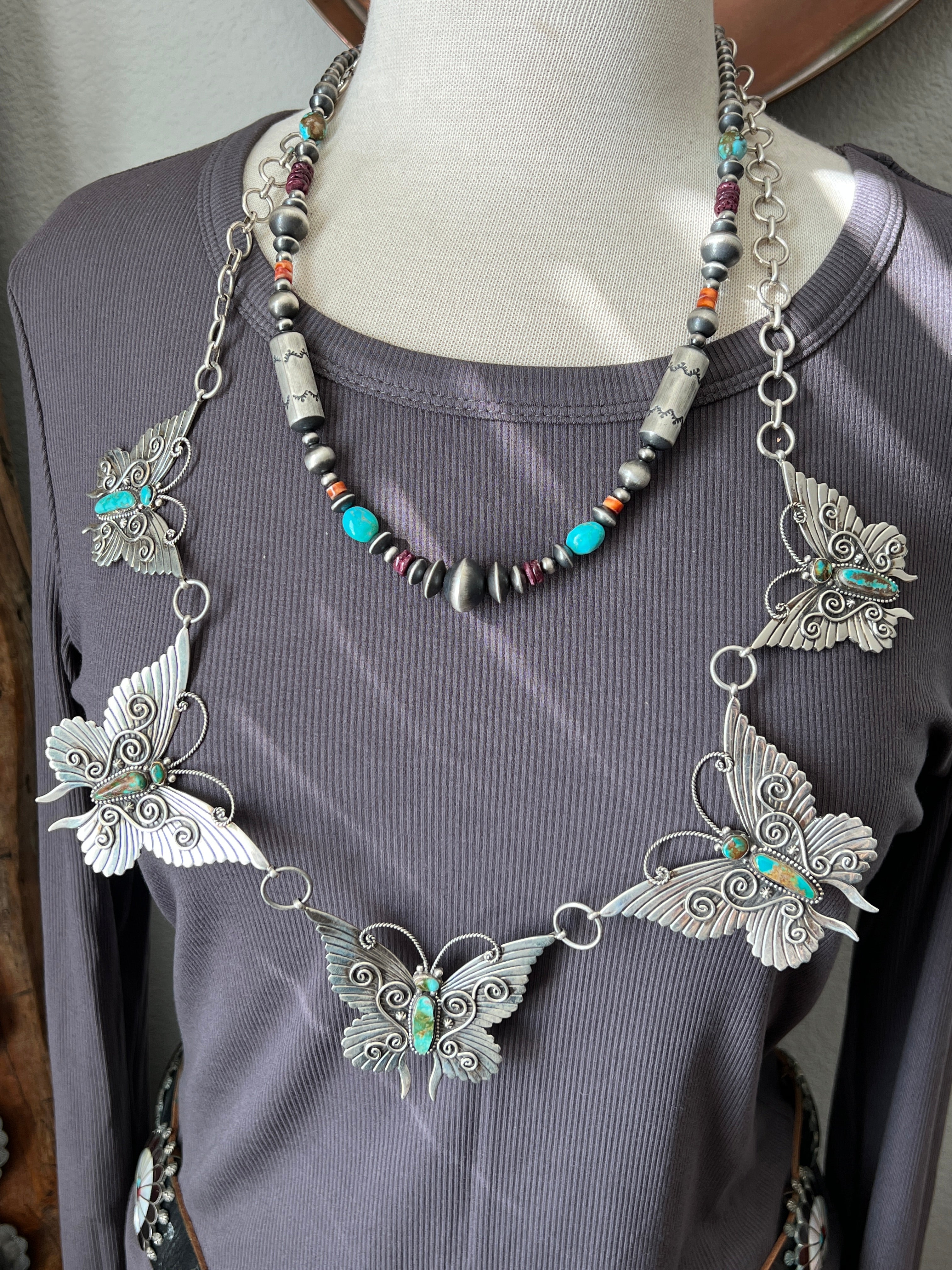 Navajo Sterling Silver, Kingman Turquoise and Spiny Oyster Shell Handcrafted Electric Rainbow Beaded Necklace by Rose Martin, 26 + 1-1/2 inch