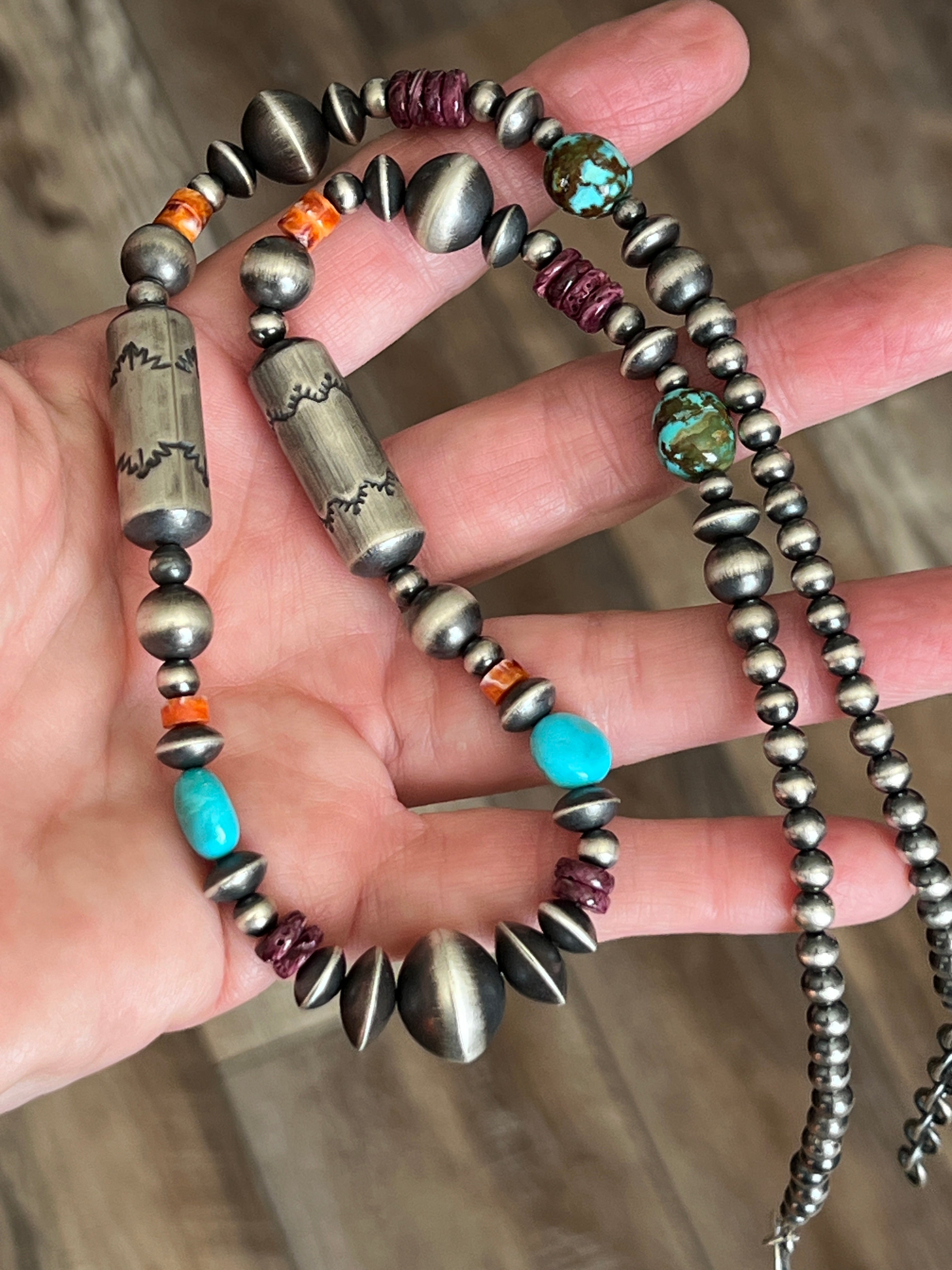 Rose Martin is a Navajo artist known for her gorgeous handmade beads as well as the way she assembles them into heirloom quality necklaces. This single strand beauty includes Rose’s handmade beads, Kingman Turquoise and orange/purple spiny oyster spacers. The larger beads gives way to 5mm machine blown rounds to finish off the strand which keeps the necklace laying nicely and facilitates better layering. The necklace measures 26 inches long plus an additional 1.5 inch extension chain to adjust the length slightly as needed. Bead sizes vary from 4mm to 15mm wide and the stamped barrels are over an inch in length. This listing is for one necklace as seen in the single item photos.
