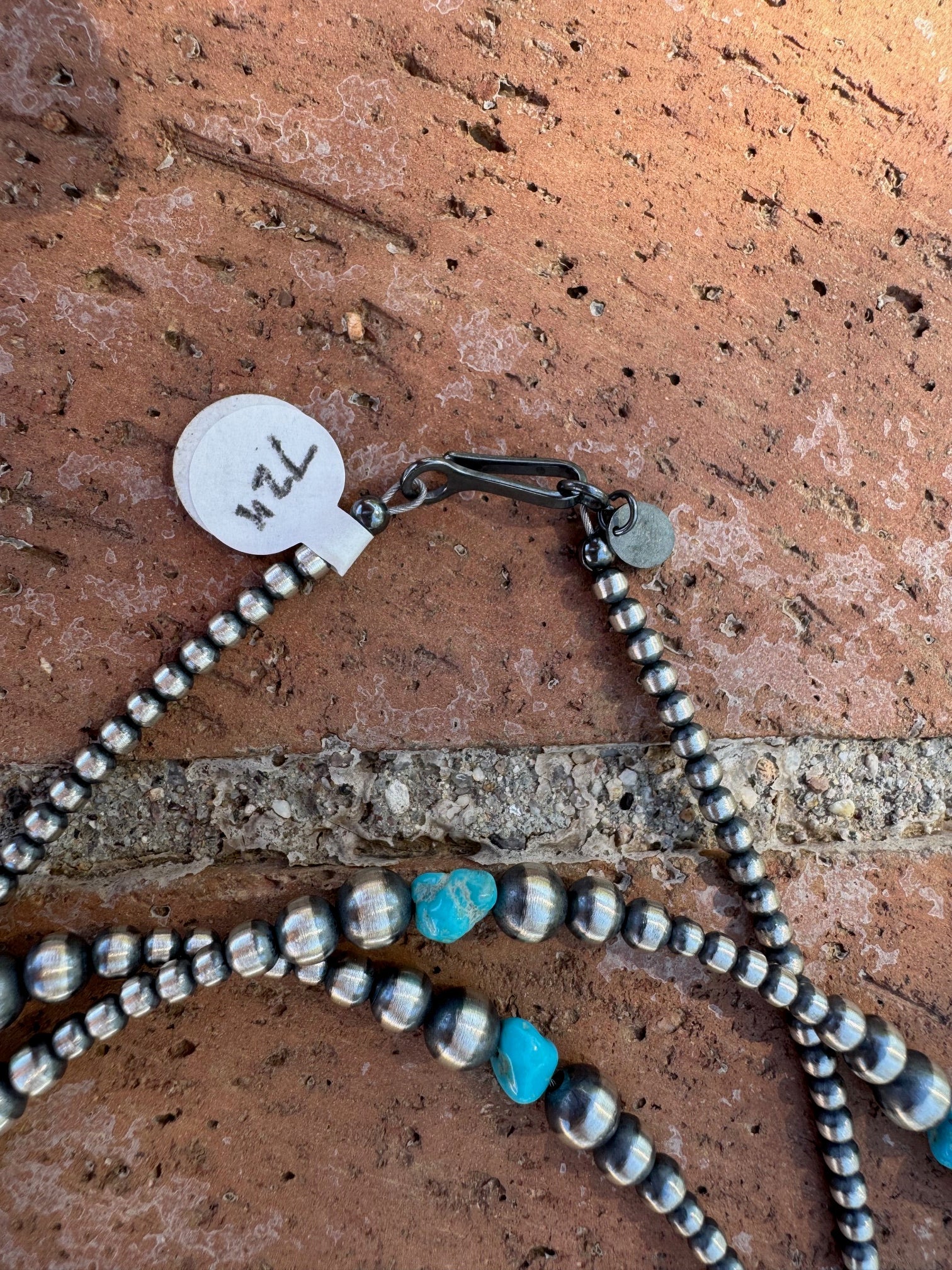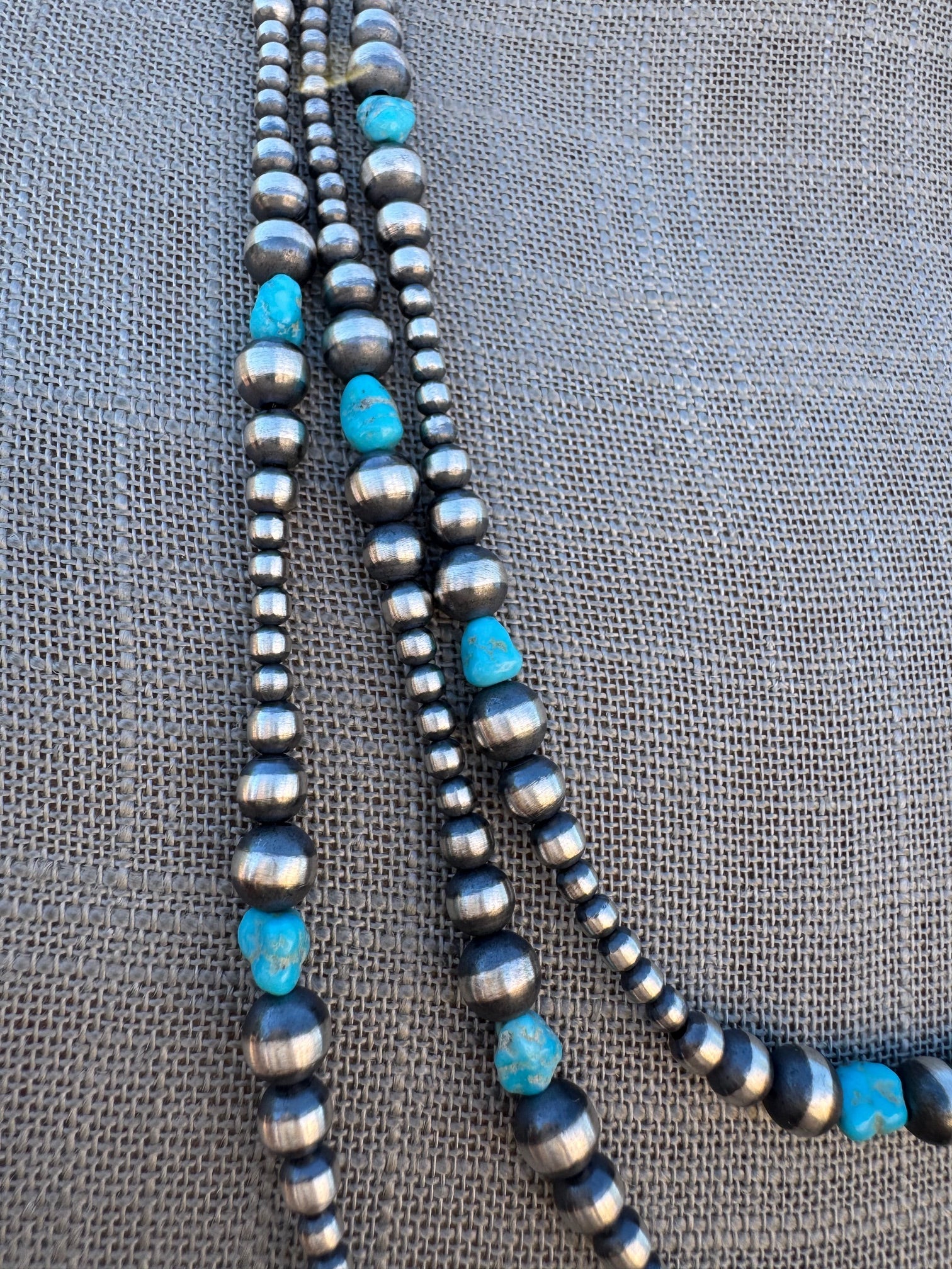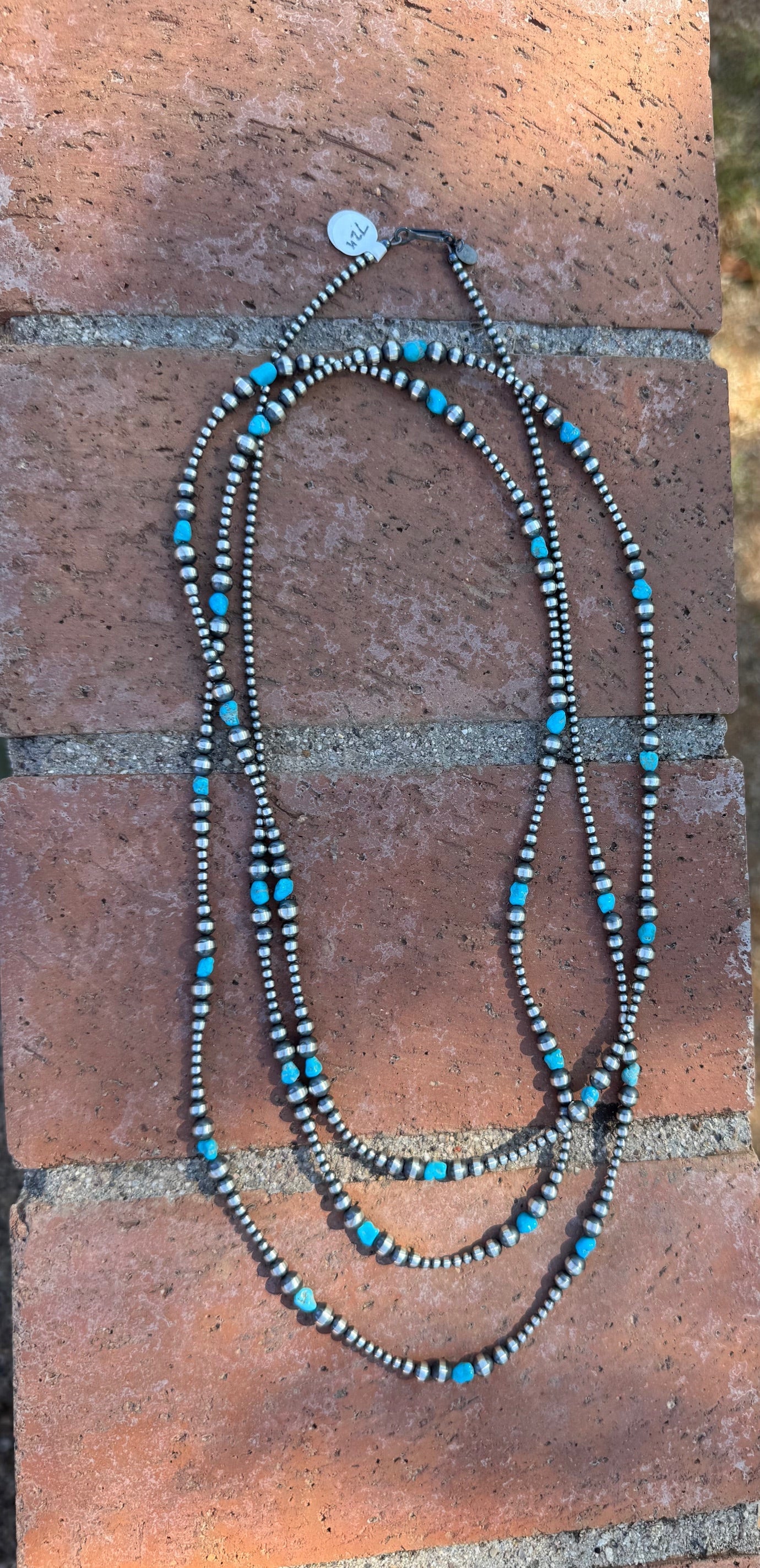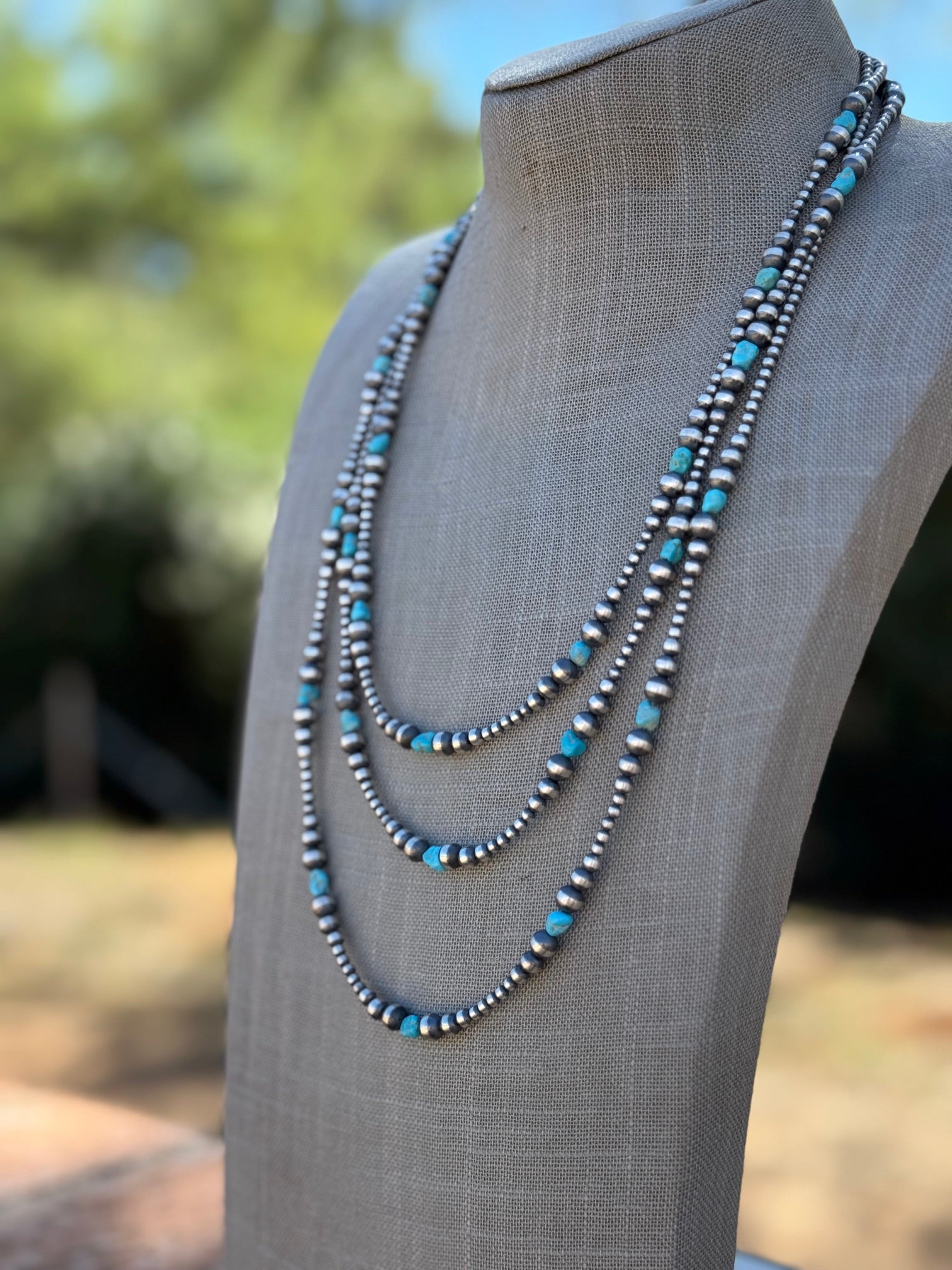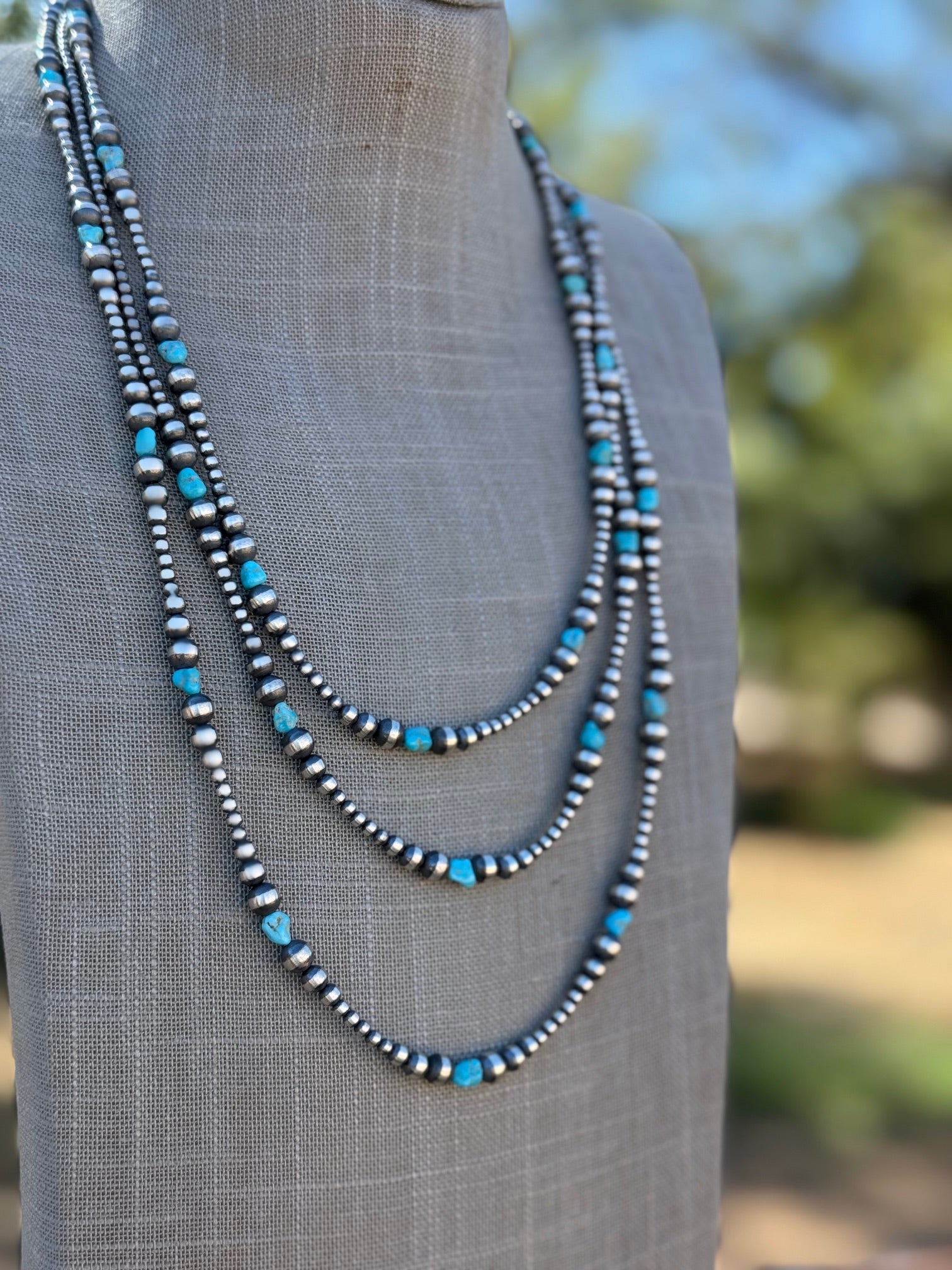 Beautiful Handcrafted Kingman Turquoise & Sterling Silver Pearl Beaded 3-6mm Necklace. Measures 72 inches long. Such beautiful stones. LISTING IS FOR ONE STRAND ONLY, MULTIPLES ARE SHOWN FOR DISPLAY ONLY.