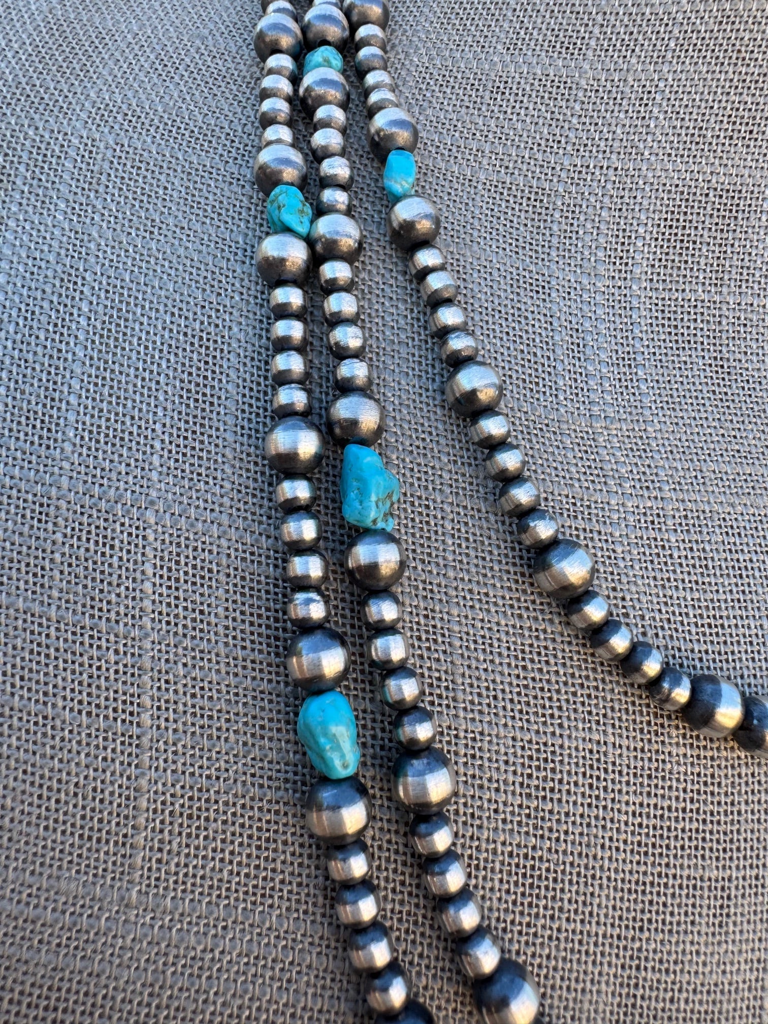 Beautiful Handcrafted Kingman Turquoise & Sterling Silver Pearl Beaded 4-6mm Necklace. Measures 24 inches long. Such beautiful stones. LISTING IS FOR ONE STRAND ONLY, MULTIPLES ARE SHOWN FOR DISPLAY ONLY.