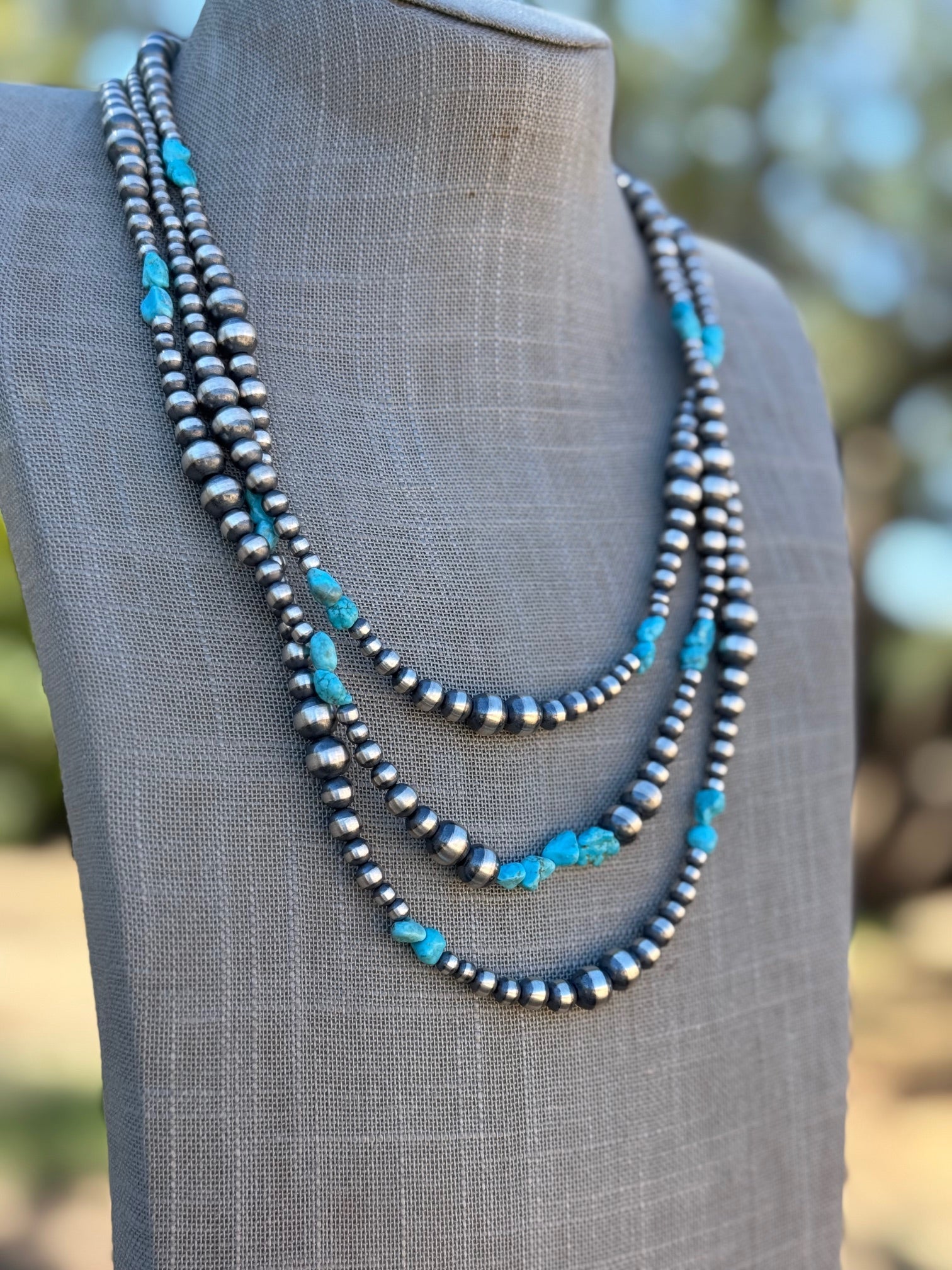 Beautiful Handcrafted Kingman Turquoise & Sterling Silver Pearl Beaded 4-8mm Necklace. Measures 72 inches long. Such beautiful stones. LISTING IS FOR ONE STRAND ONLY, MULTIPLES ARE SHOWN FOR DISPLAY ONLY.