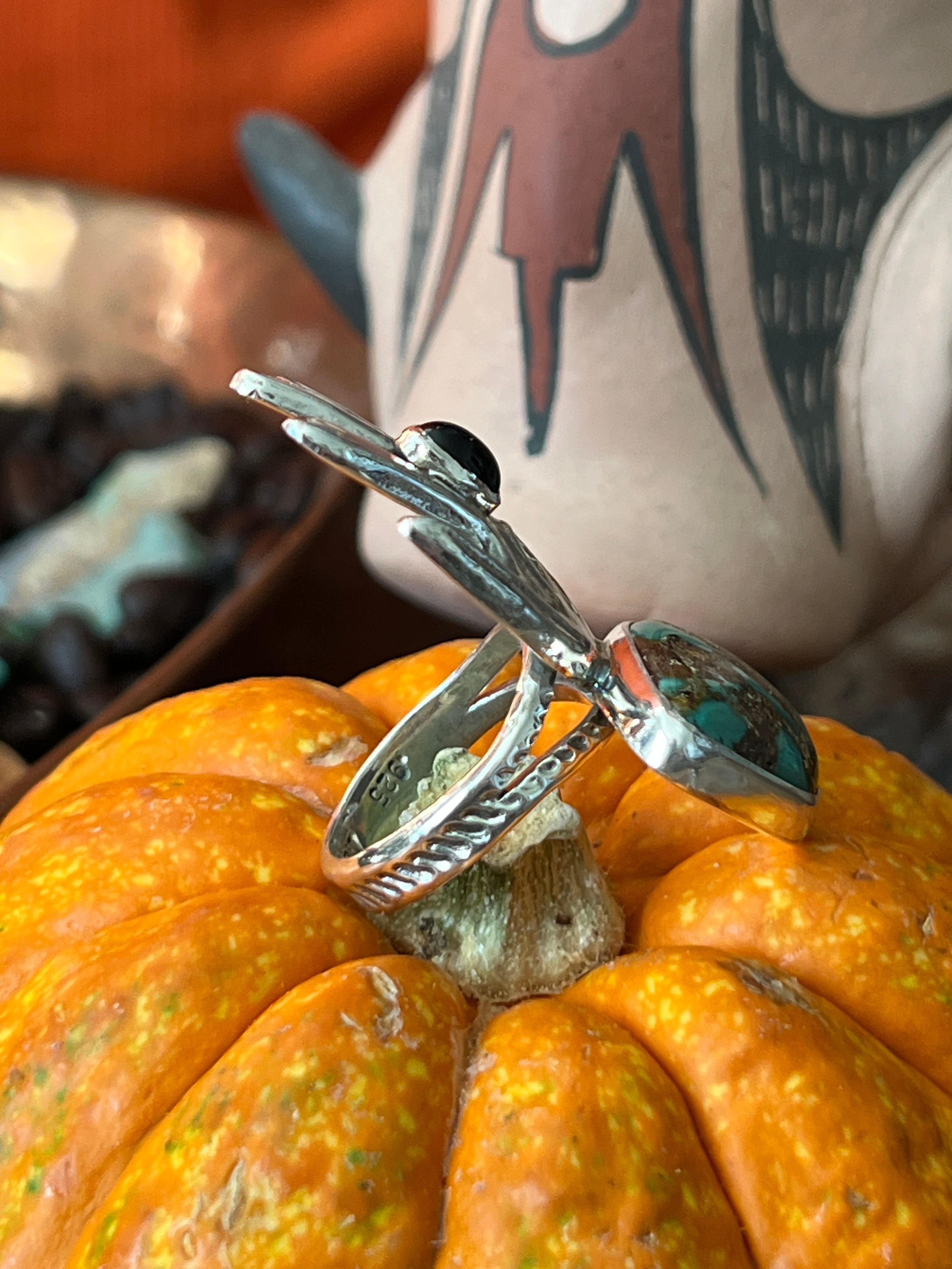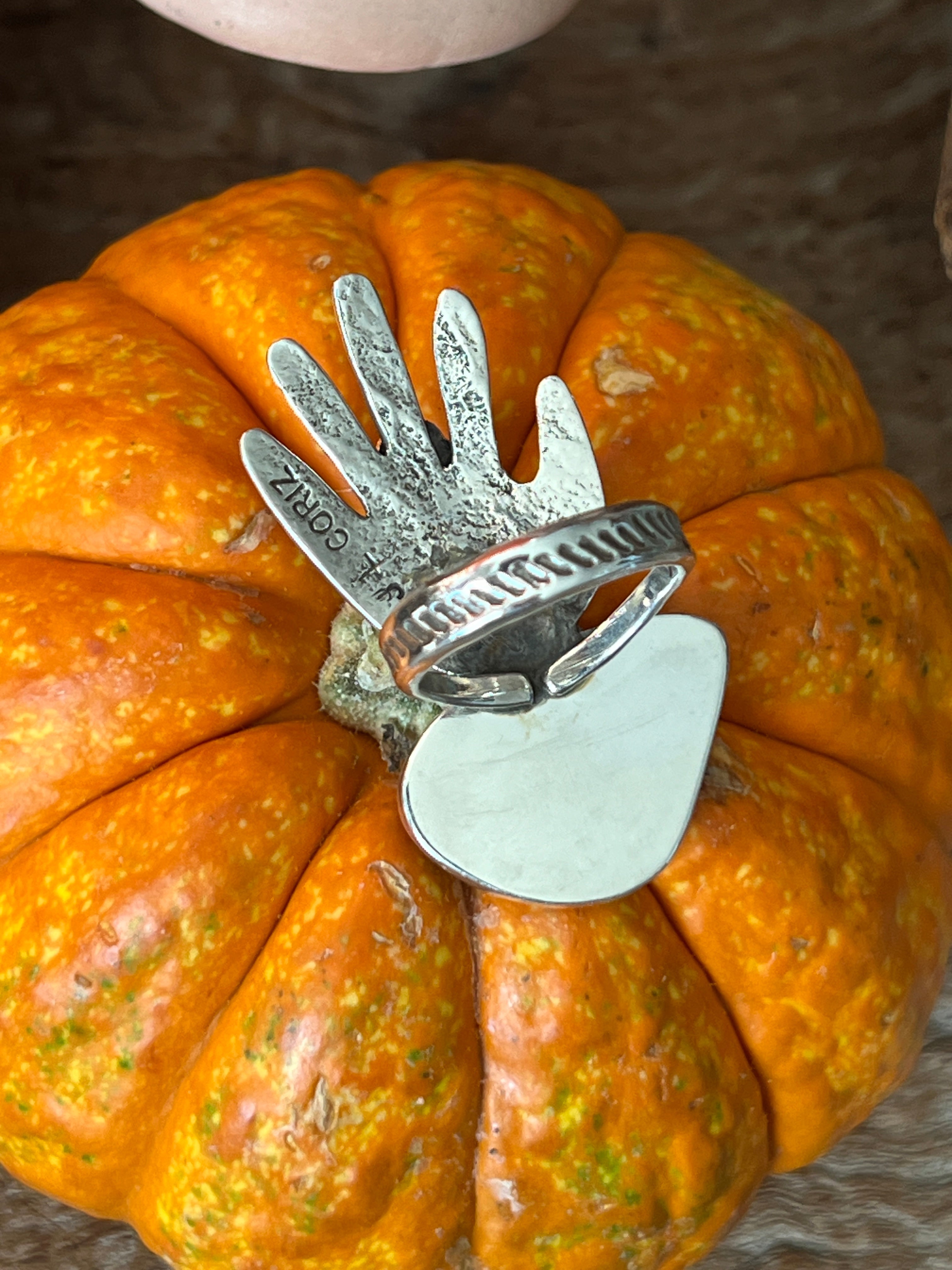 Handcrafted Sterling Silver, Turquoise and Black Onyx Hand Ring by Jay Coriz, Size 8