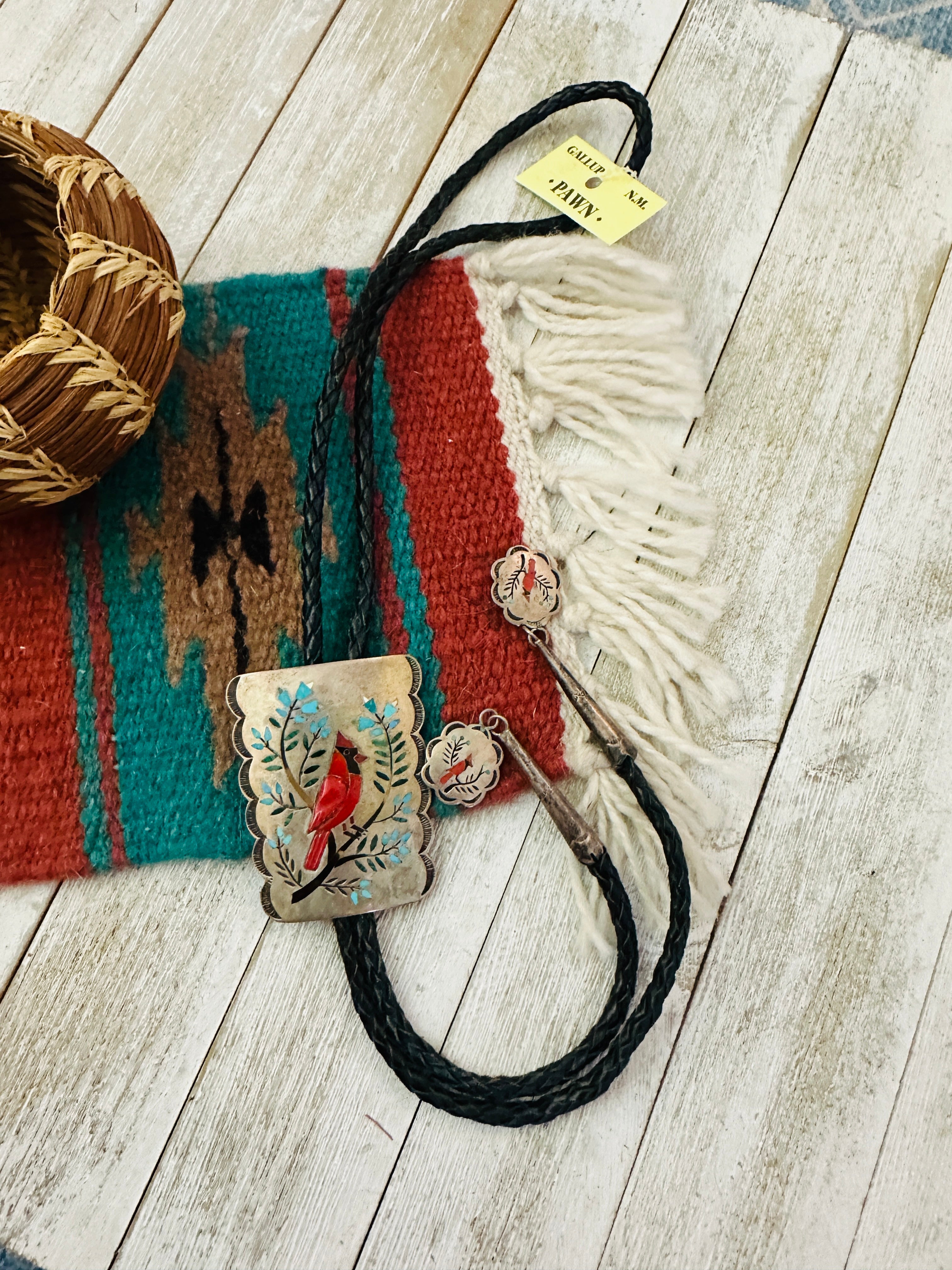 Handcrafted Vintage Old Pawn Sterling Silver & Multi Stone Inlay Cardinal Bolo Tie