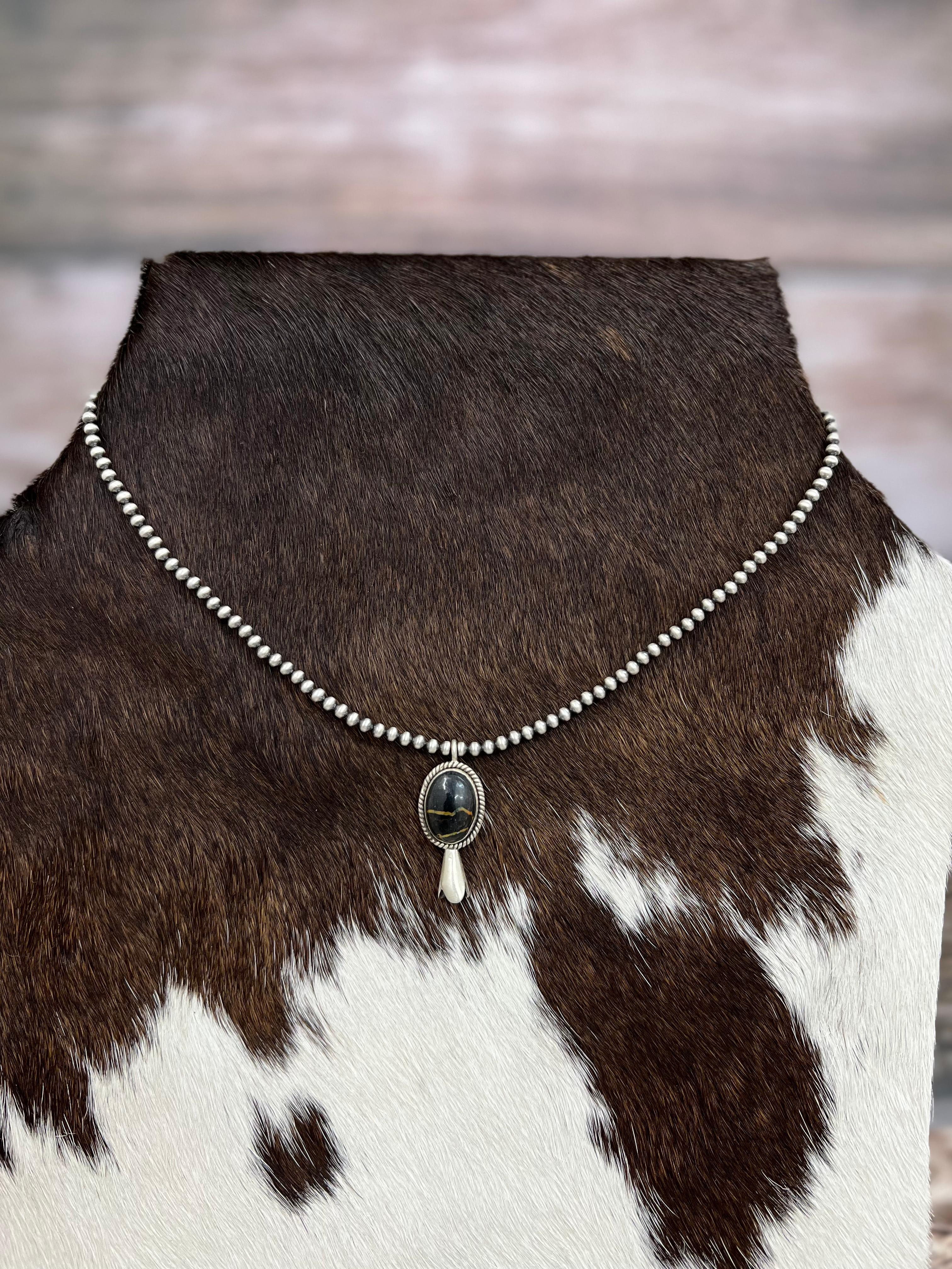 Such gorgeous craftsmanship! Sterling Silver Beaded Blackjack Turquoise Necklace Measures Length 16+2" Extension, Width 3/8" with bead size 3MM.