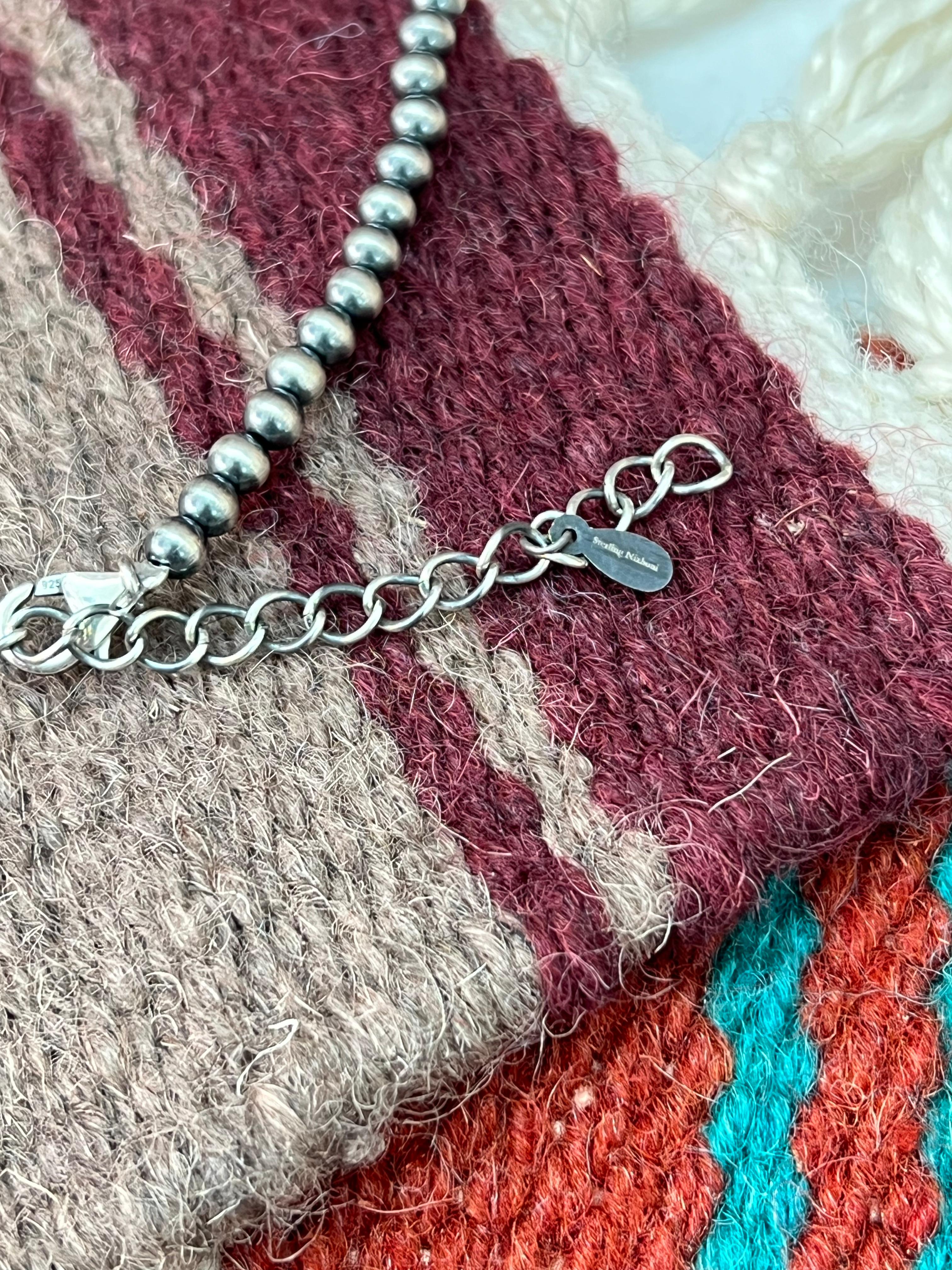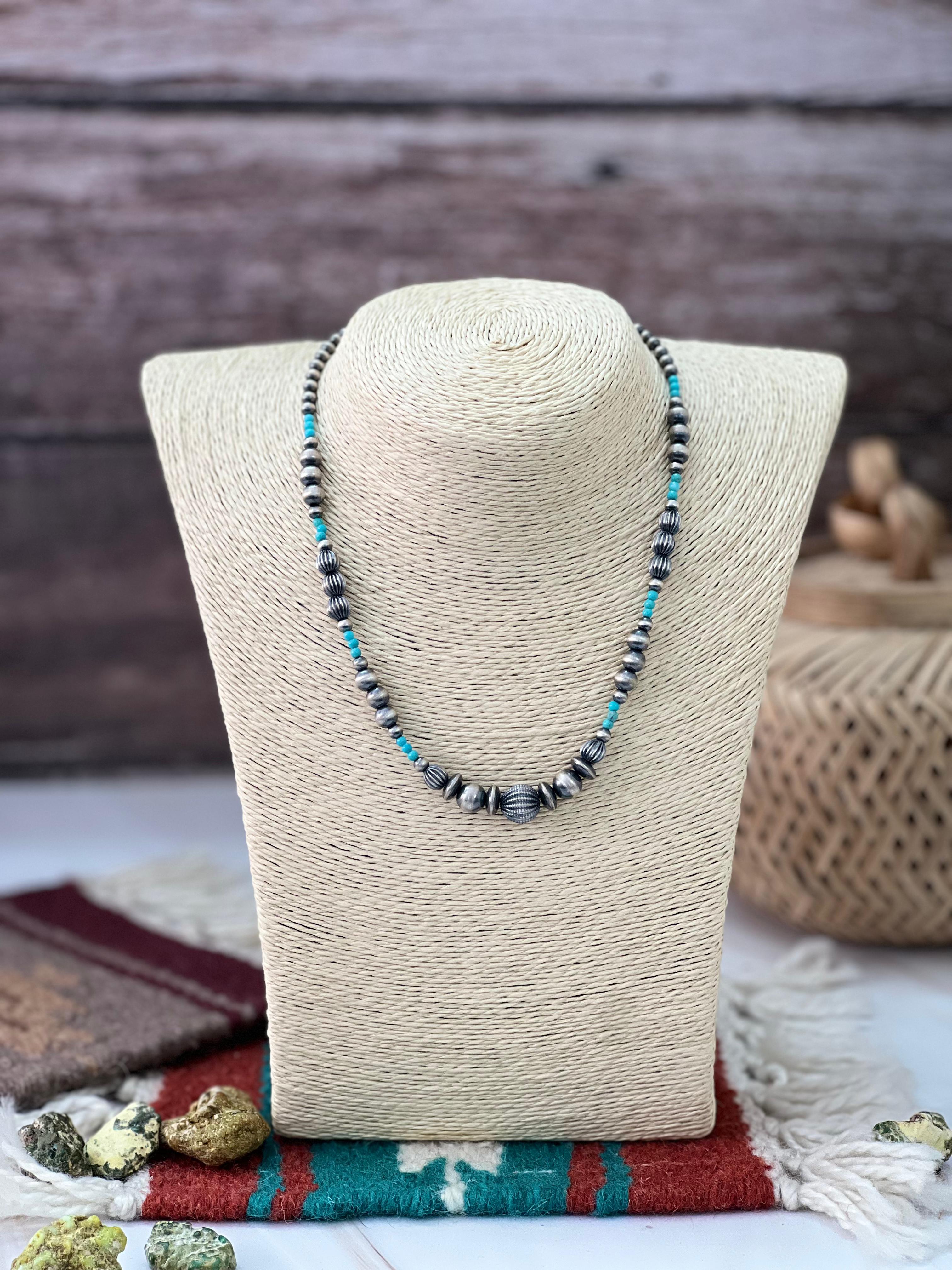 Handmade Sterling Silver Beaded Kingman Turquoise Necklace with Signed Nizhoni