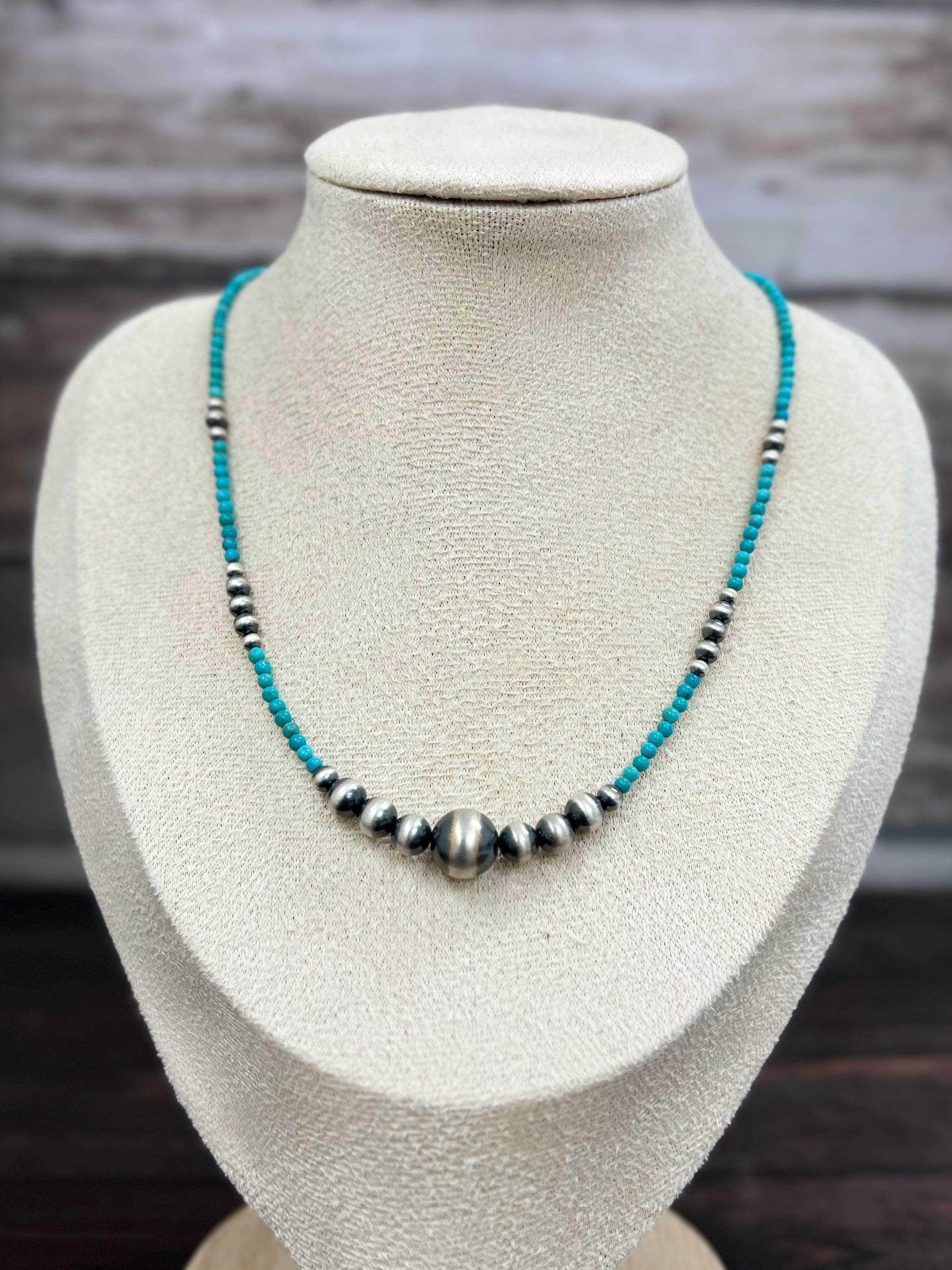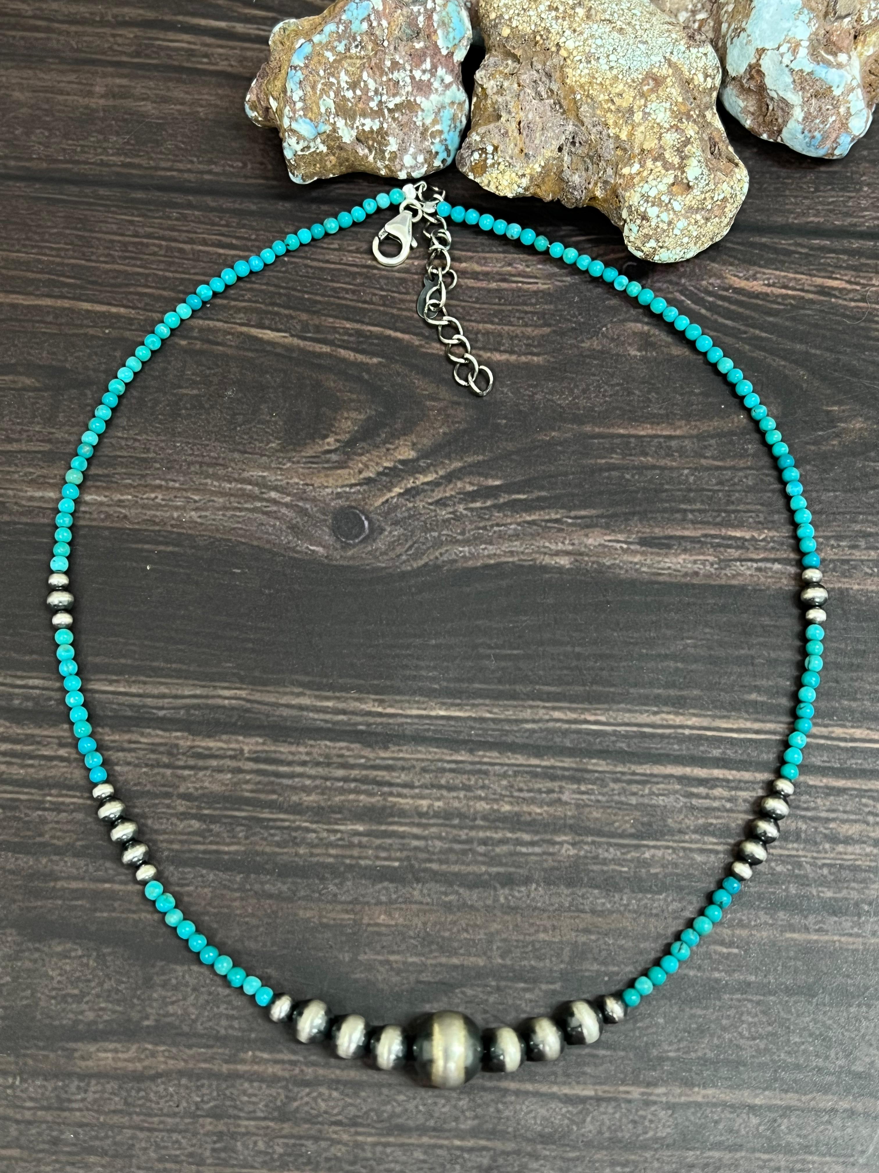 Handmade Sterling Silver Kingman Turquoise Beaded Necklace with Signed Nizhoni