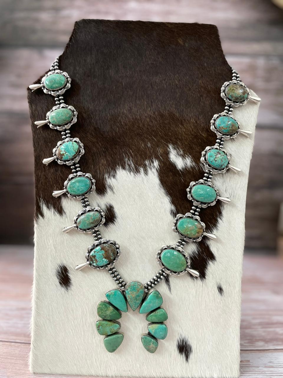 Handmade Sterling Silver Mantis Turquoise Beaded Squash Blossom Naja Necklace with Signed Nizhoni