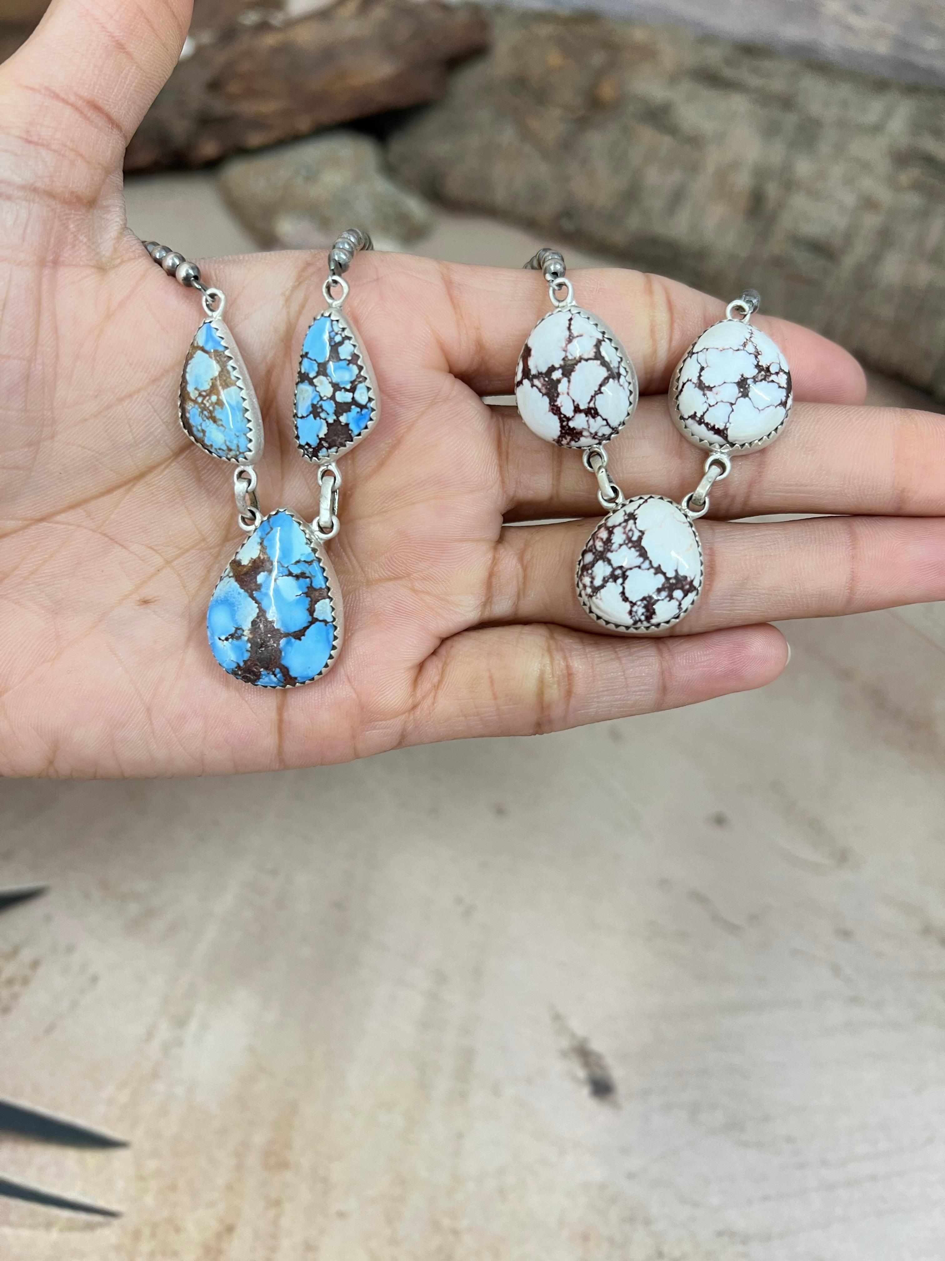 Such gorgeous craftsmanship! Sterling Silver Dahlia Rose, White Buffalo, Wild Horse, Golden Hills, Royston Necklace measures Length 16+2" Extension, Width 6/8", Bead Size 3MM.