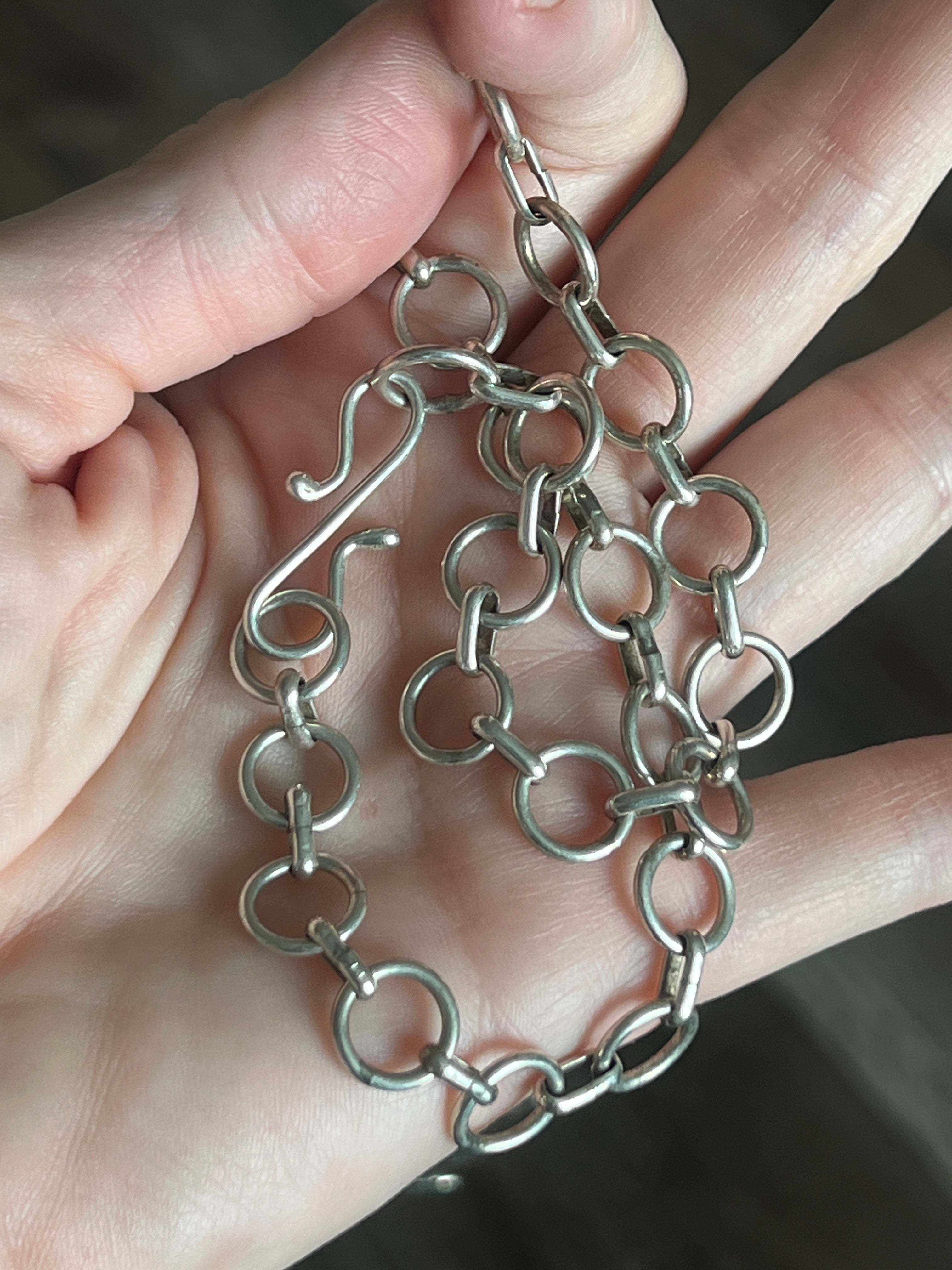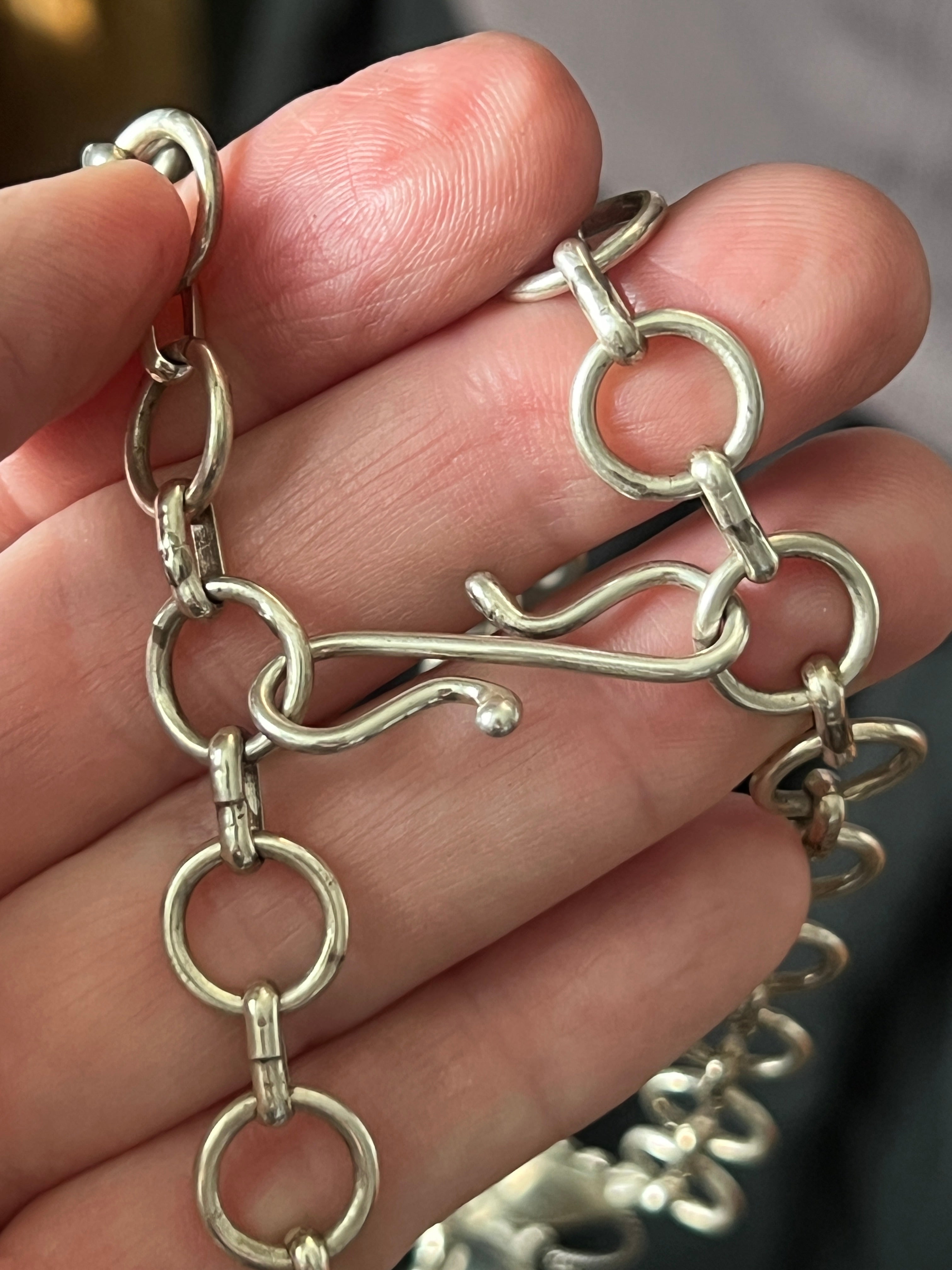 This necklace is probably the first we’ve seen quite like it. The size of the butterflies and how they are linked causes it to lay in a square fashion, but the true upside here is the versatility. End to end, it measures 33 inches but the S hook can be removed to clasp the chain as short as you need. This is the interesting part, because it could be worn long or short…OR, and hear us out…as a belt…or even a hat adornment. The three larger butterfly pieces each measure 2-1/2 inches tall and 3 inches wide while the smaller end butterflies measure 2 inches tall and 2-1/4 inches wide. Each butterfly is intricately adorned with wire and carved wing lines with two rich pieces of turquoise. This beauty definitely belongs in your collection - the possibilities are many, which you will be able to see in the photos. Stamped LC for New Mexico artist, Lee Charley.