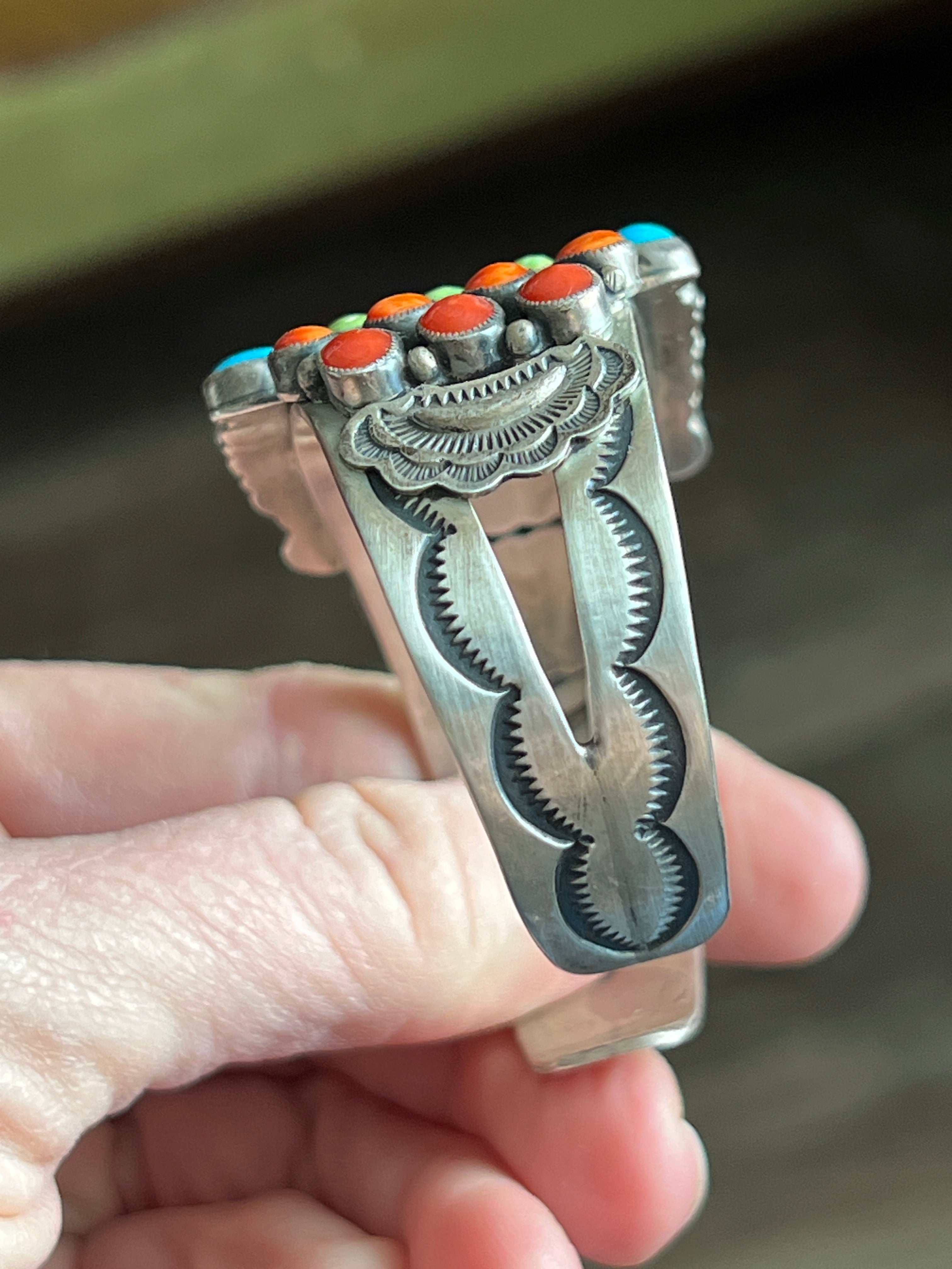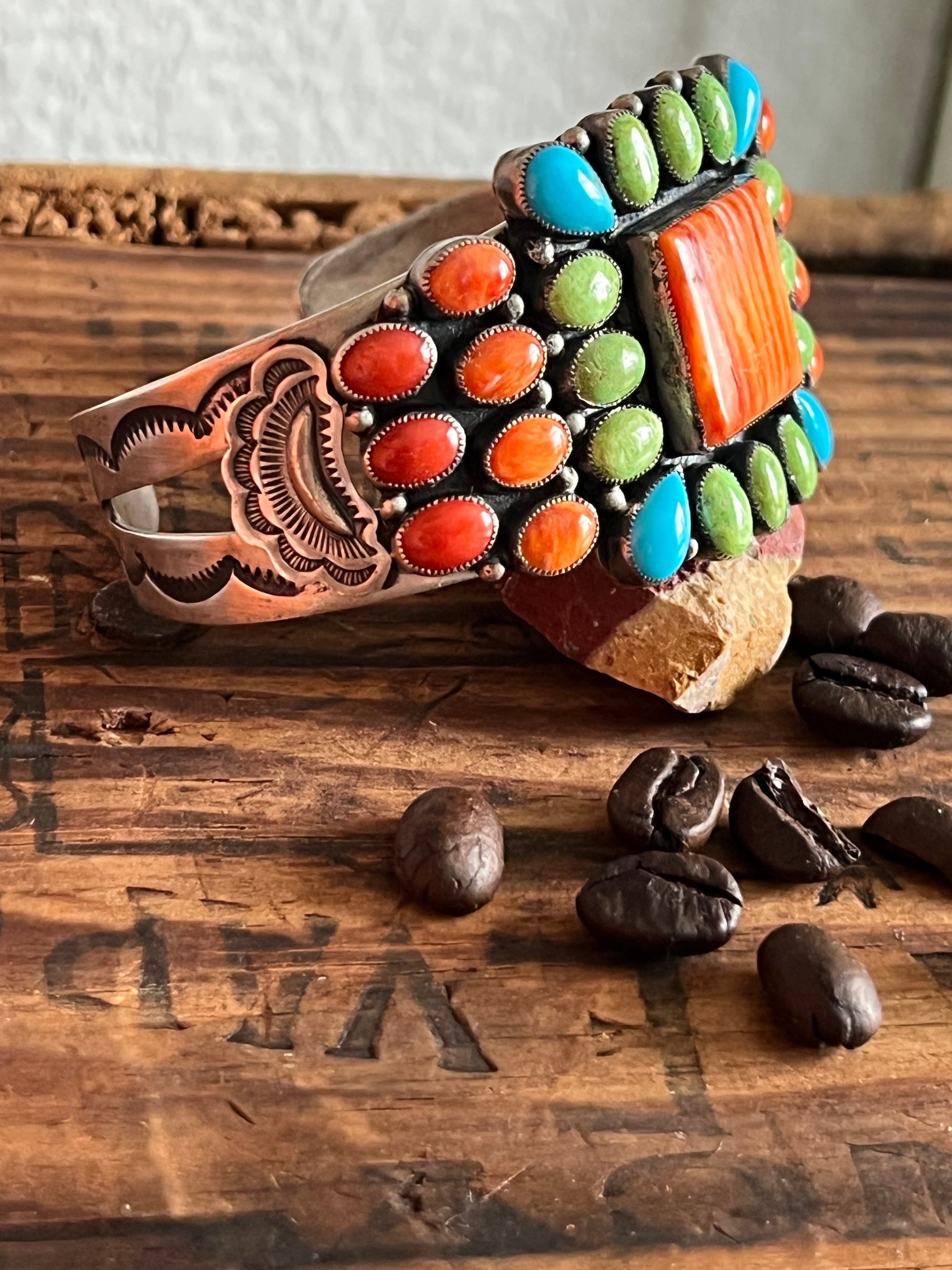 Old Pawn Don Lucas Split Stamped Sterling Silver and Multi Stone Cluster Cuff
