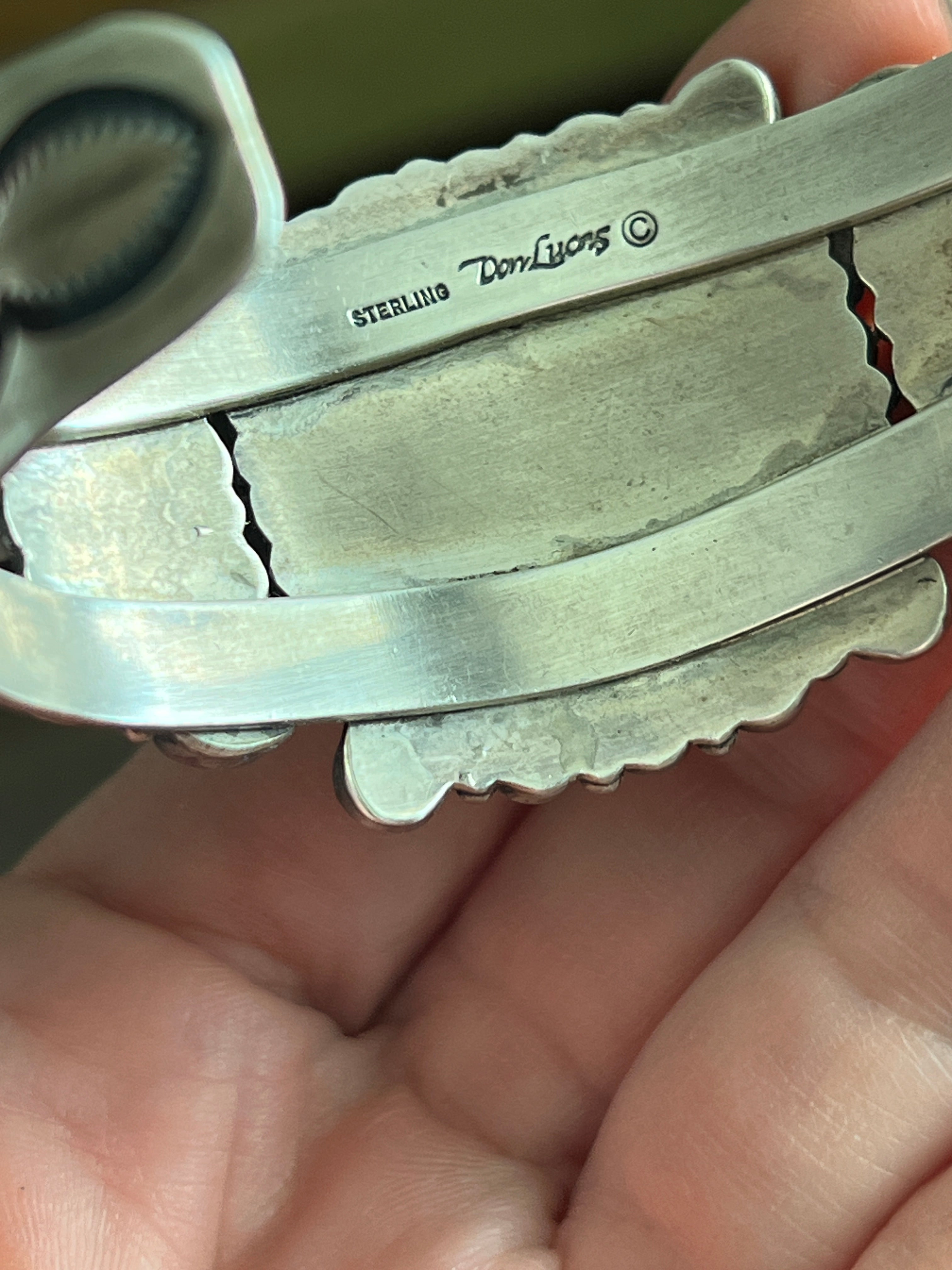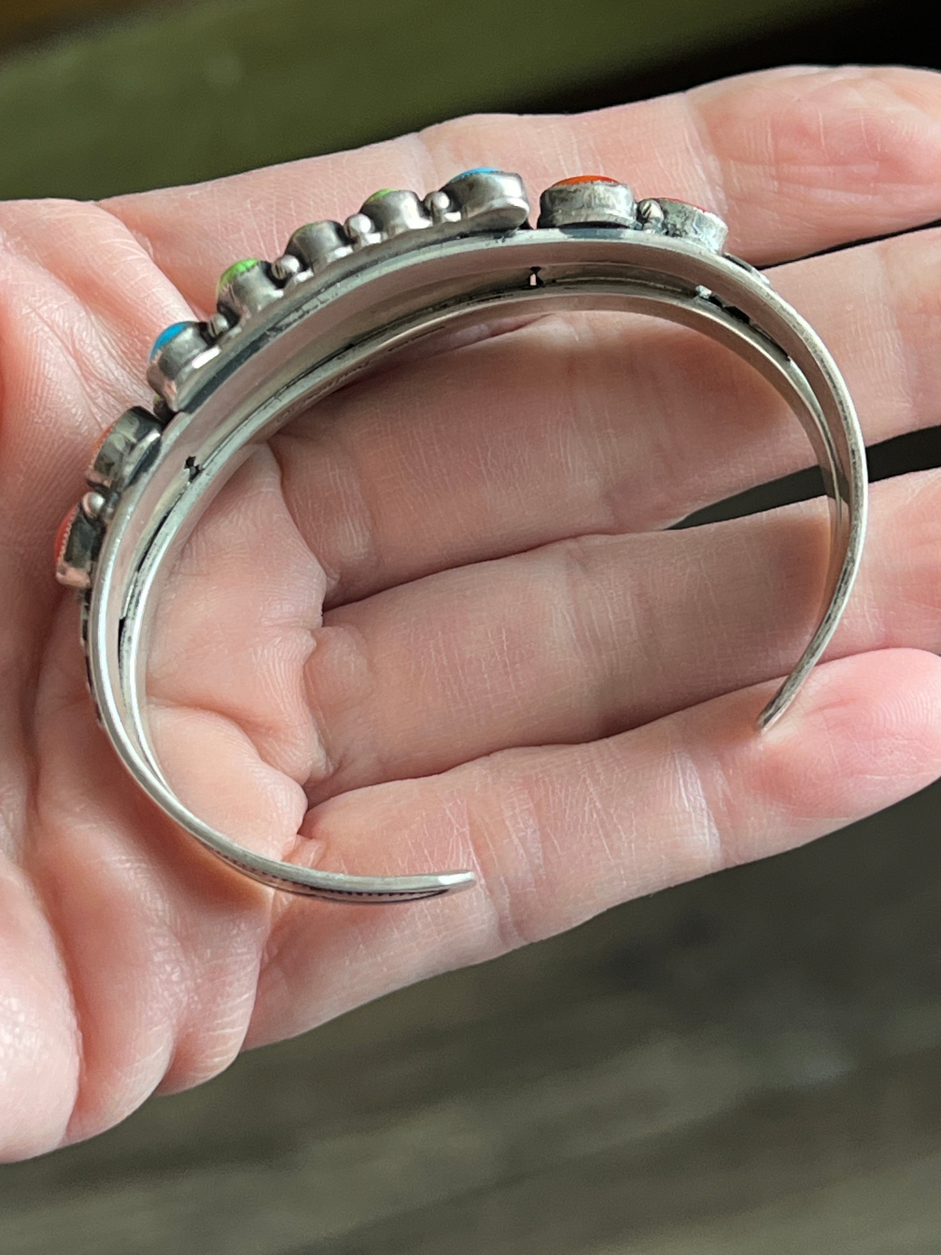 This stunning old pawn cluster cuff was designed by acclaimed southwest jewelry artist, Don Lucas. The width t starts at 1/2 inch and gradually increases to 1-3/8 inches in the middle. It features expertly set pieces of Sleeping Beauty Turquoise, Gaspeite, Orange Spiny Oyster Shell and Mediterranean Coral. The inside measures 5-1/2 inches + 1 inches for a total inner circumference of 6-1/2 inches. It is seen in the photos fitting a 6-1/4 inch wrist with some movement. It is stamped sterling and displays the copy written Don Lucas shop mark. This listing is for one cuff - the piece photographed is the one you will receive.