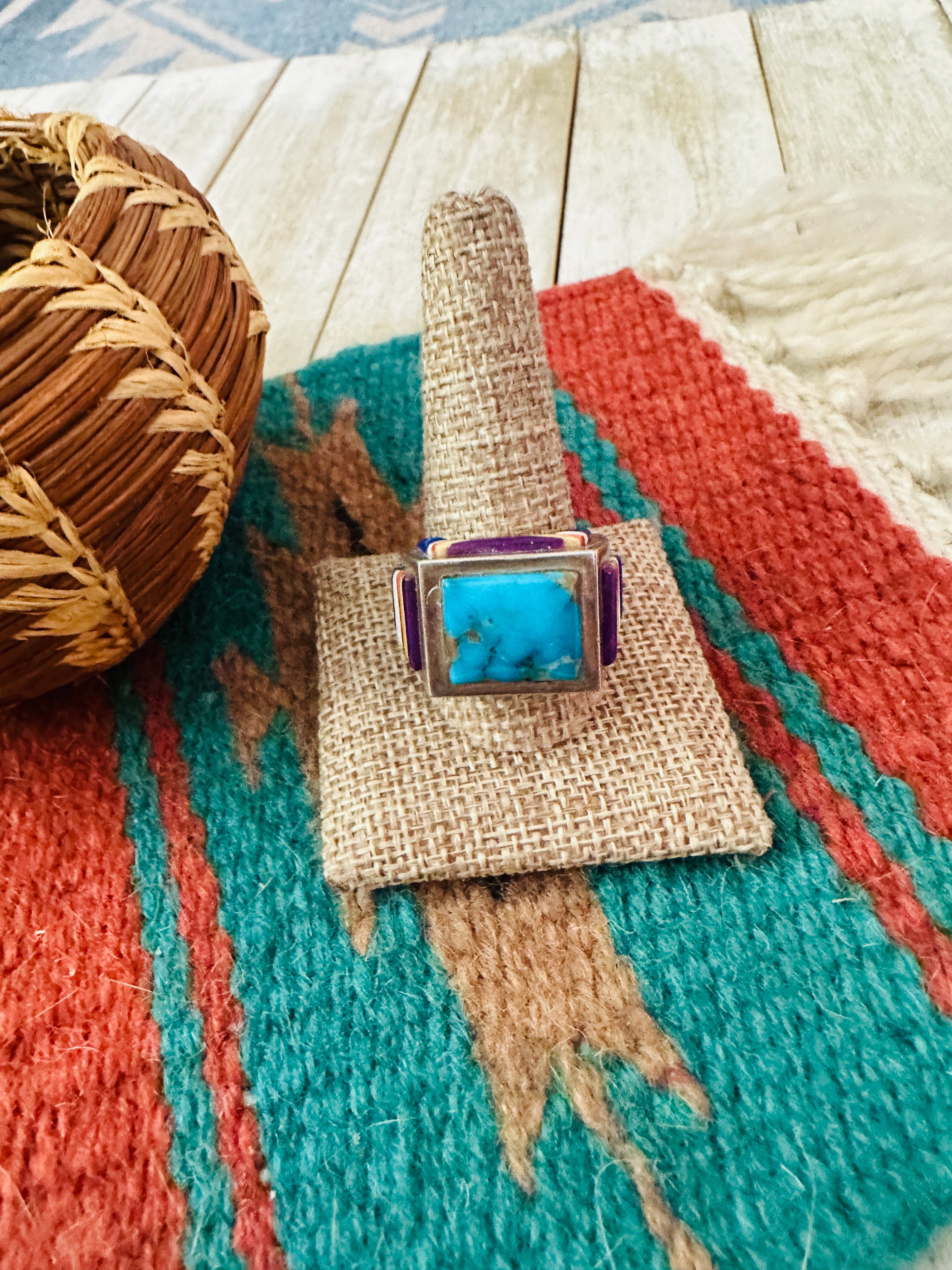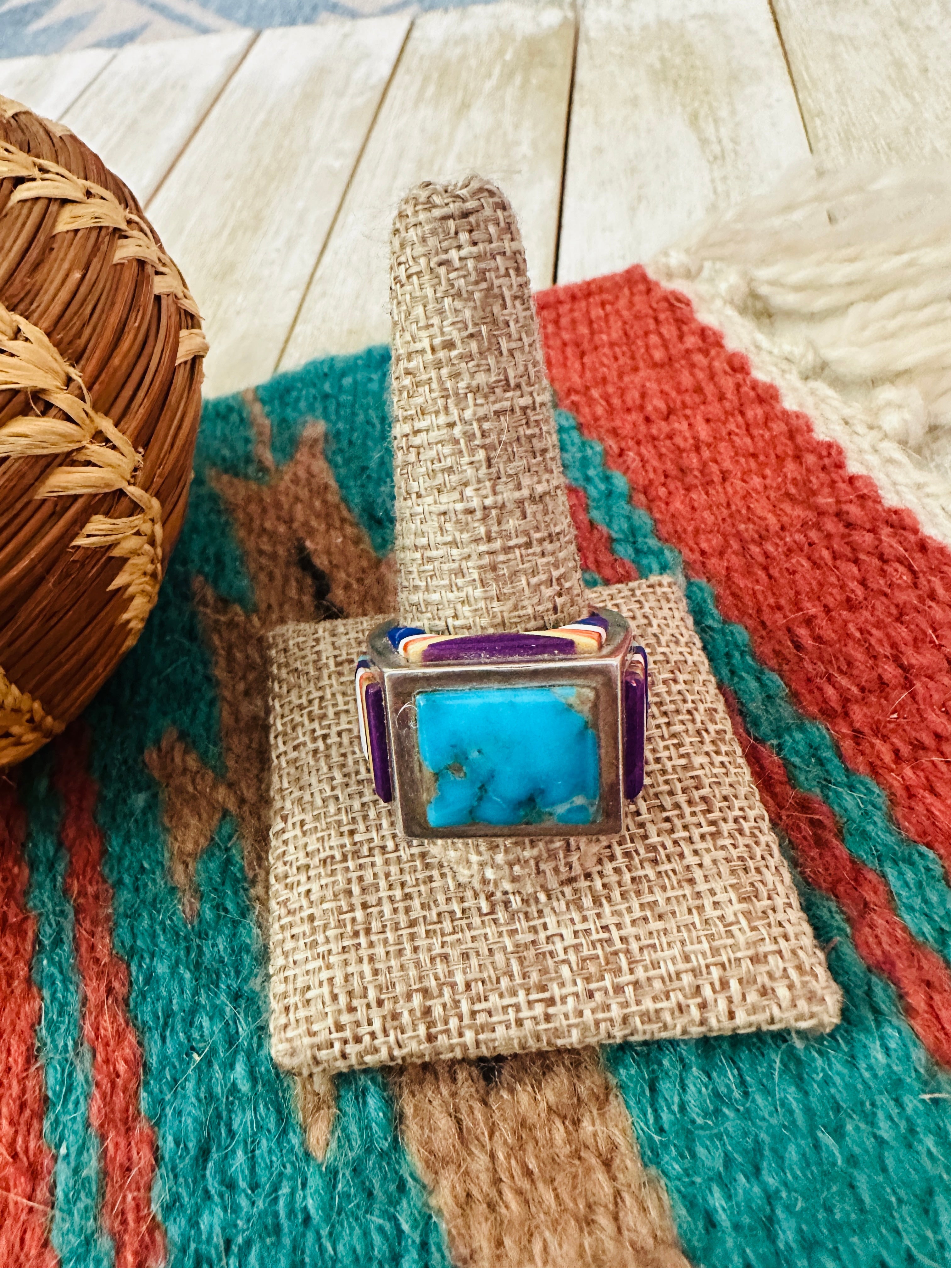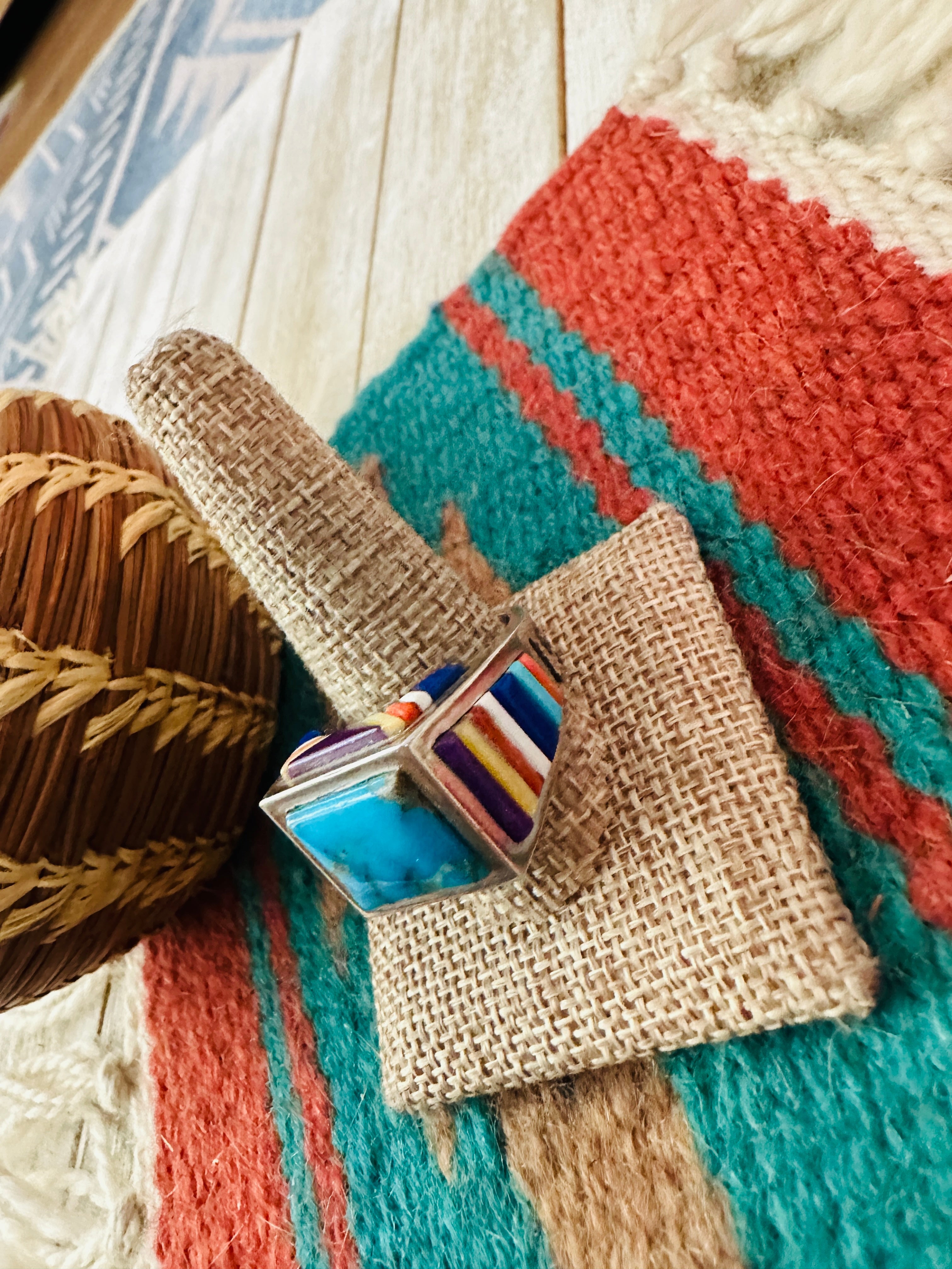 Old Pawn Handcrafted Multi Stone & Sterling Silver Inlay Ring Size 10.75