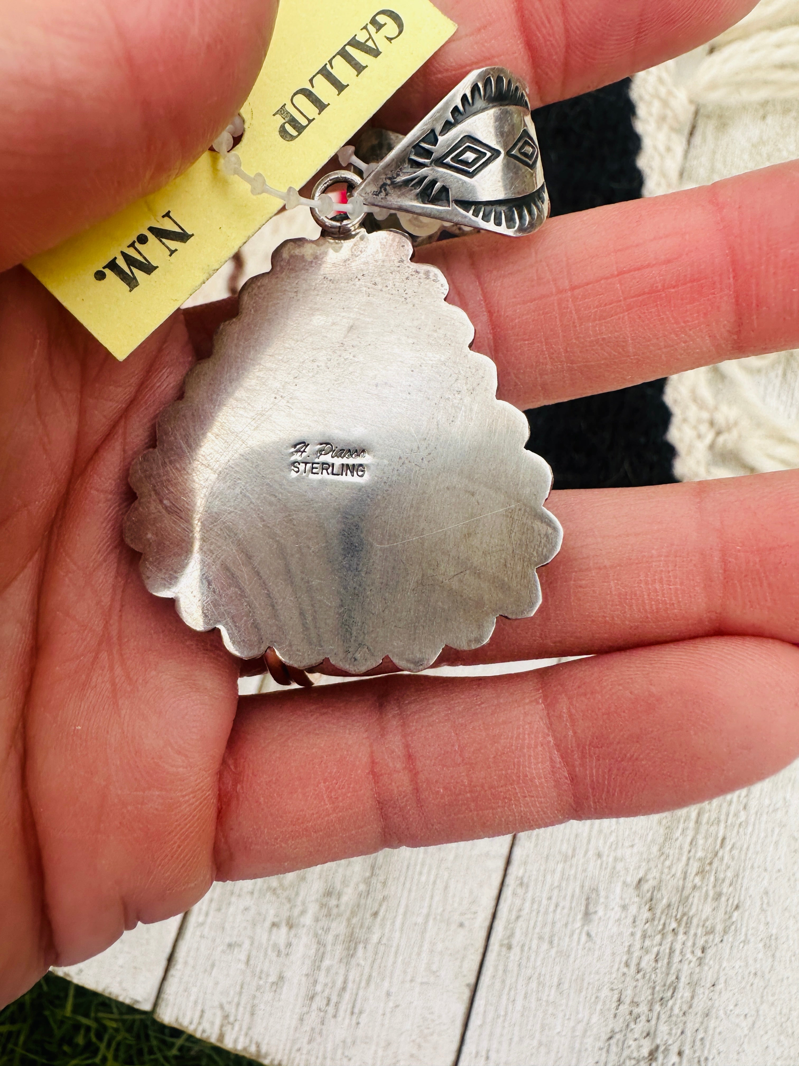 Beautiful Old Pawn Handcrafted Kingman Turquoise and Sterling Silver Pendant. This pendant measures 2 3/8 inches long and 1 1/2 inches wide. Bale measures just under 5/8 of an inch across. Signed by the artist Happy Piasso and stamped Sterling. Such a cool piece!