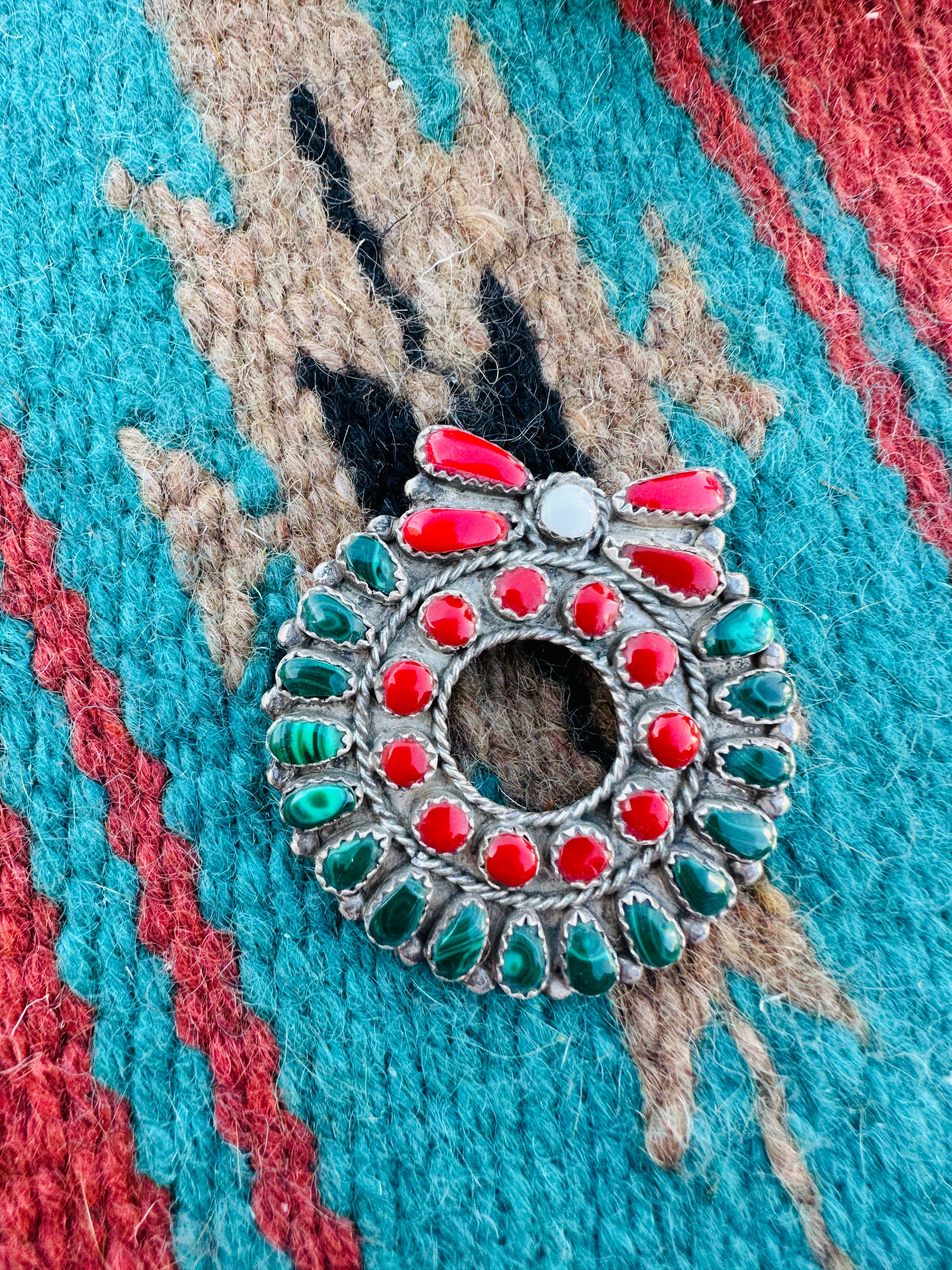 Beautiful Old Pawn Handcrafted Malachite, Coral and Sterling Silver Wreath Brooch. This brooch measures 1 7/8 inches long and 1 3/4 inches wide. Such a cool piece!