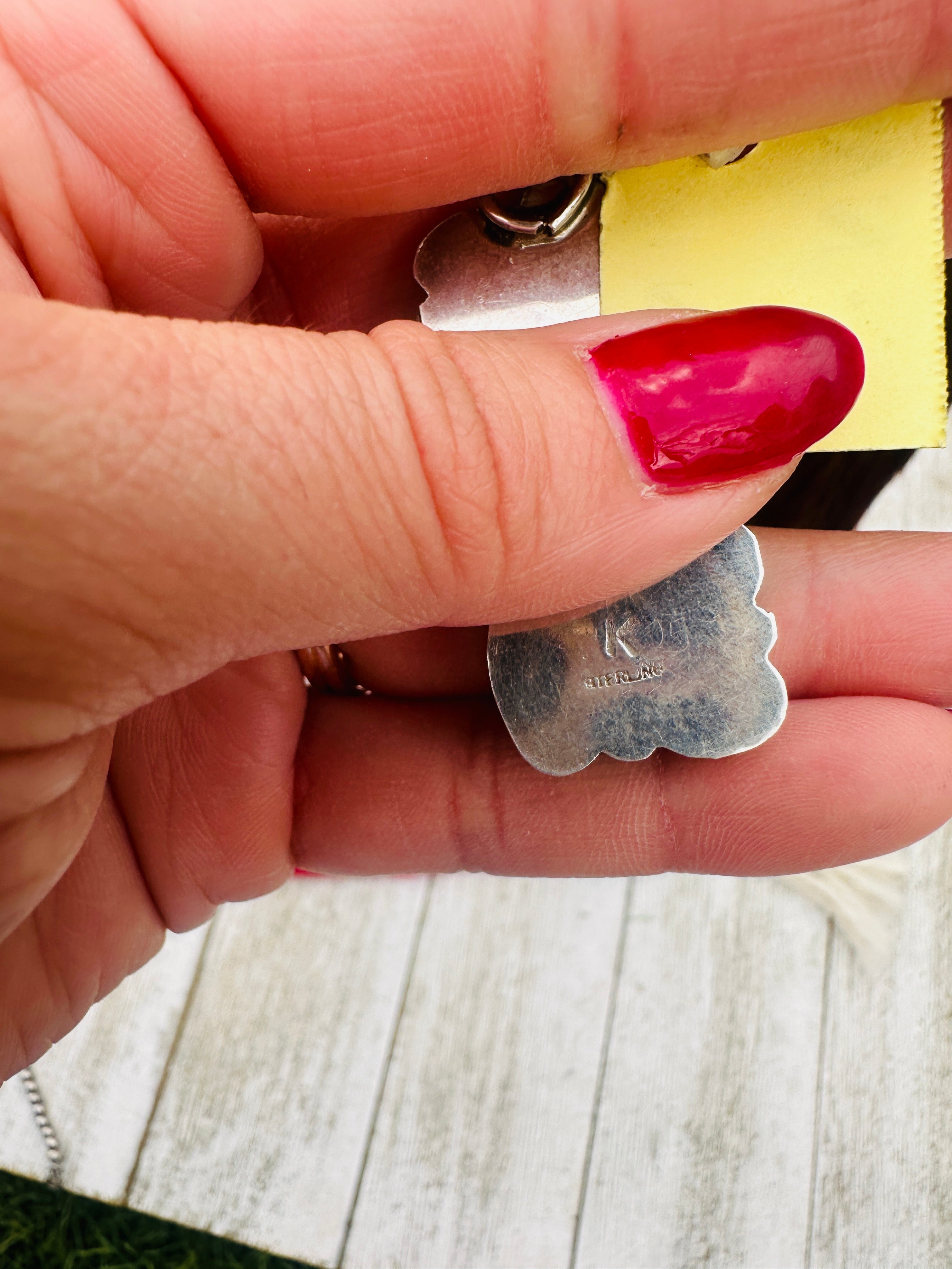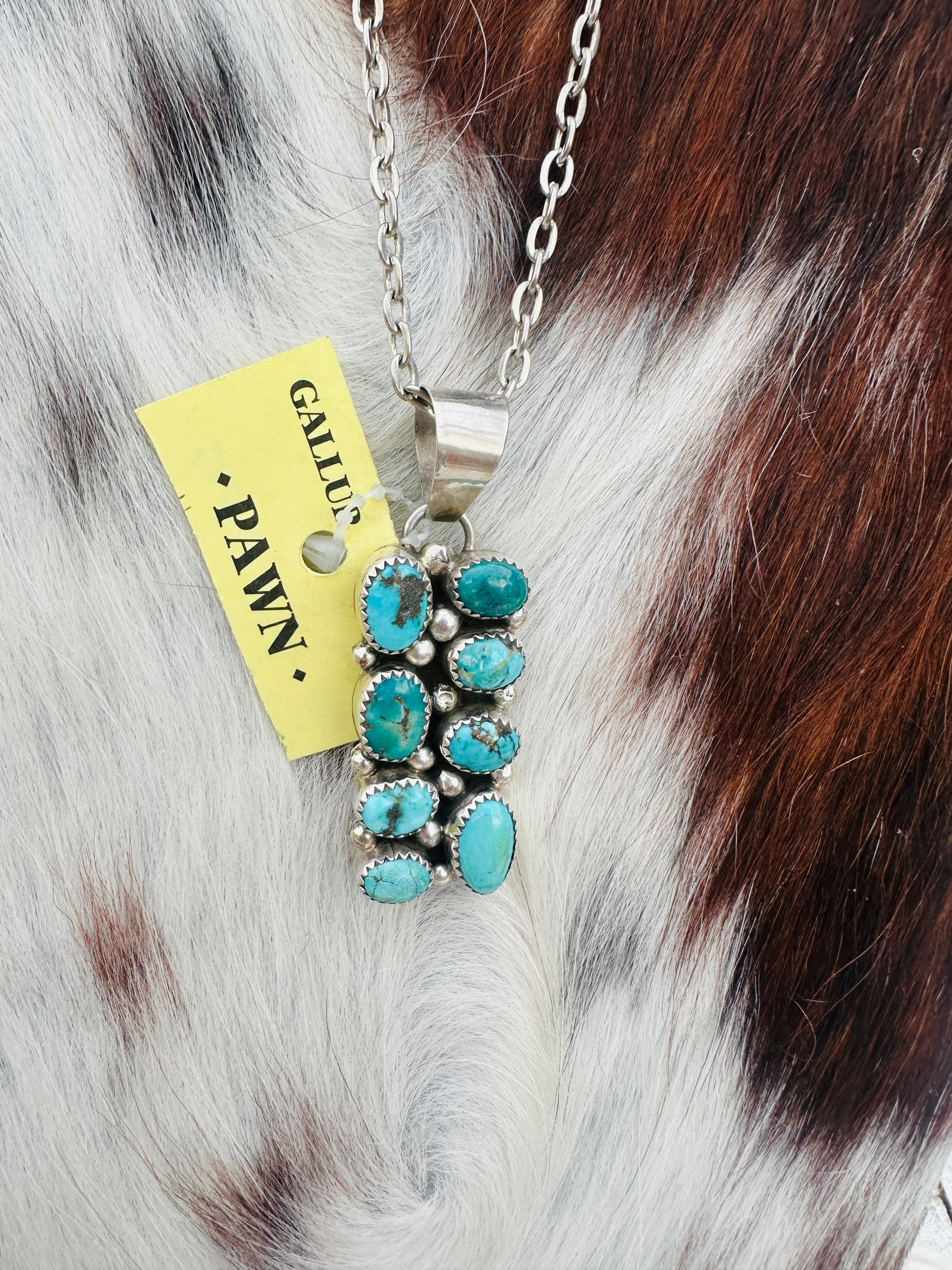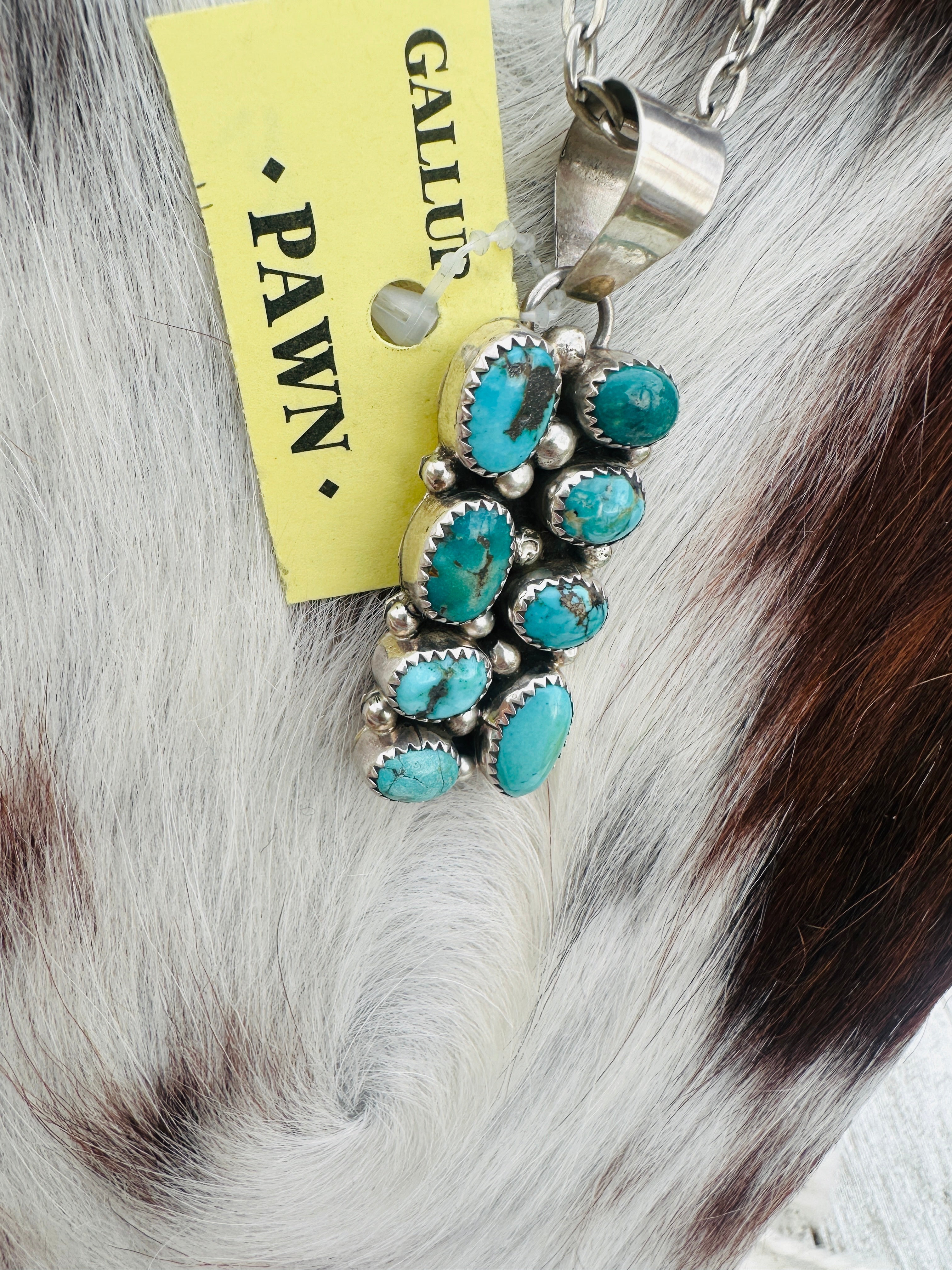 Beautiful Old Pawn Handcrafted Turquoise and Sterling Silver Cluster Necklace. Sterling chain measures 18 inches long. Pendant measures 2 1/4 inches long and 3/4 of an inch wide. Signed by the artist and stamped Sterling. Such a cool piece!