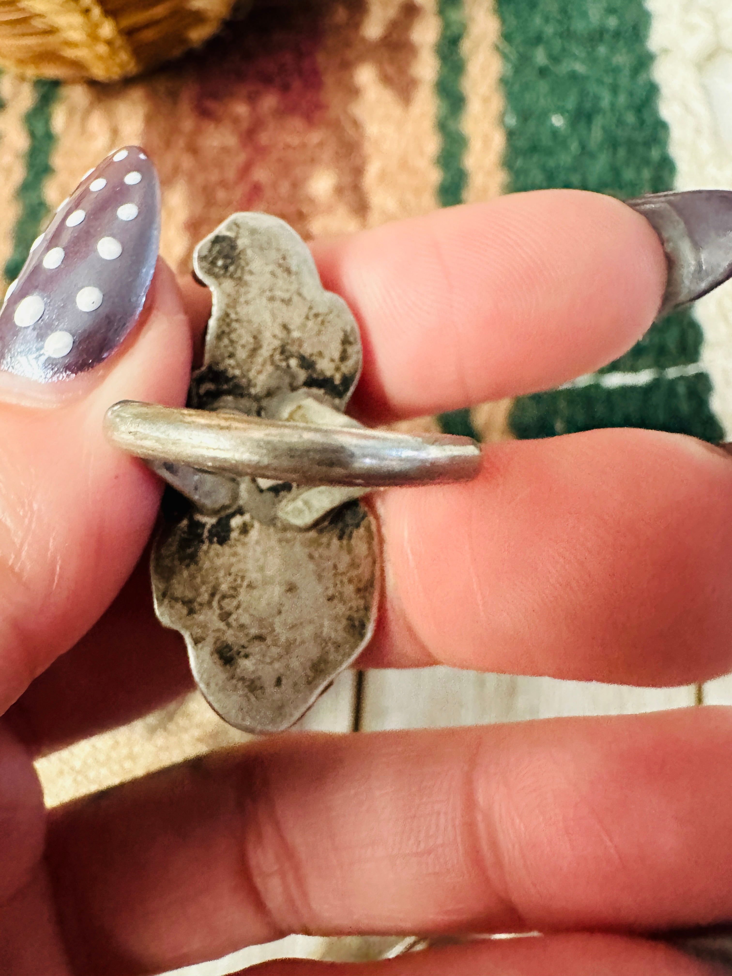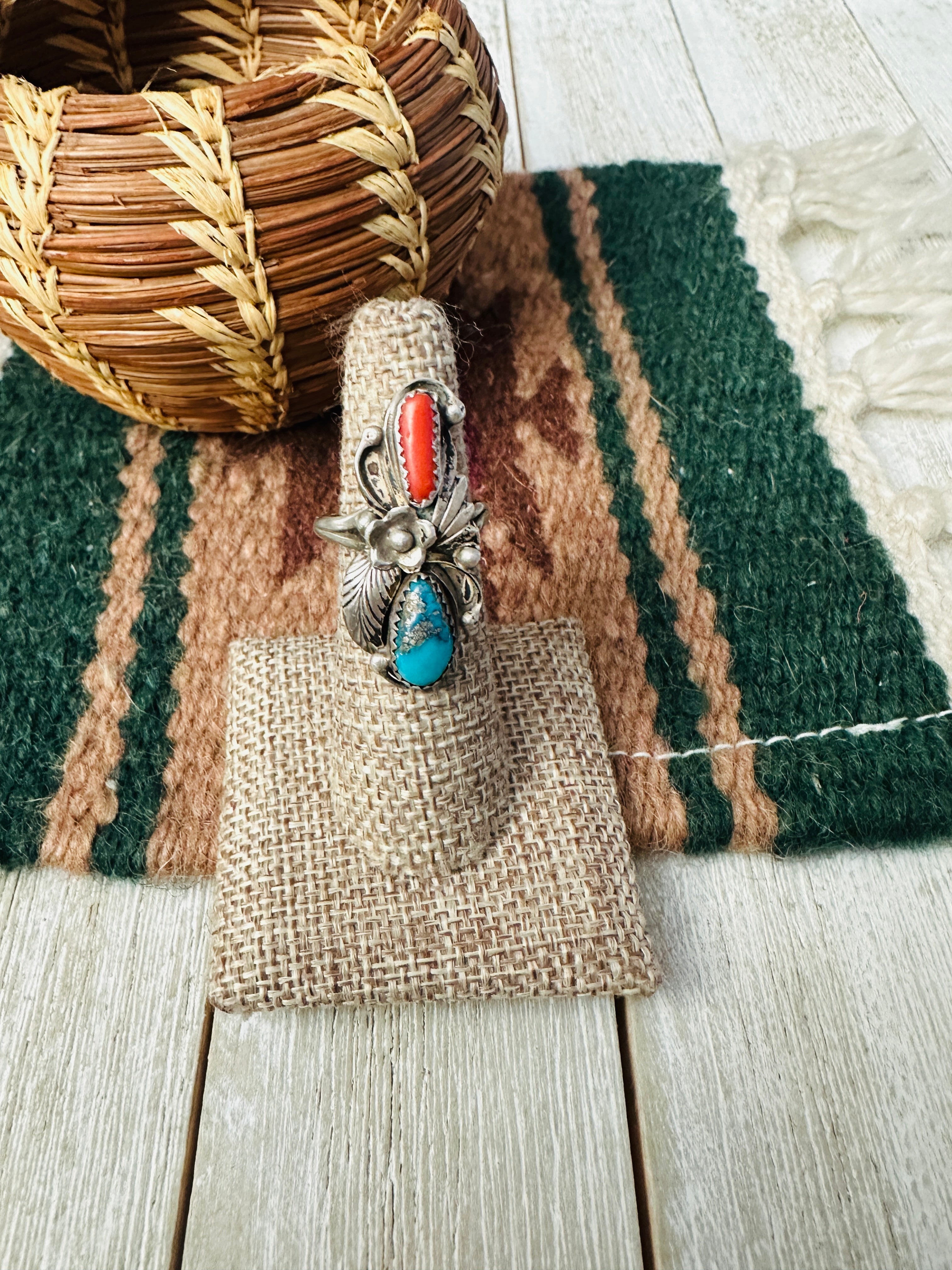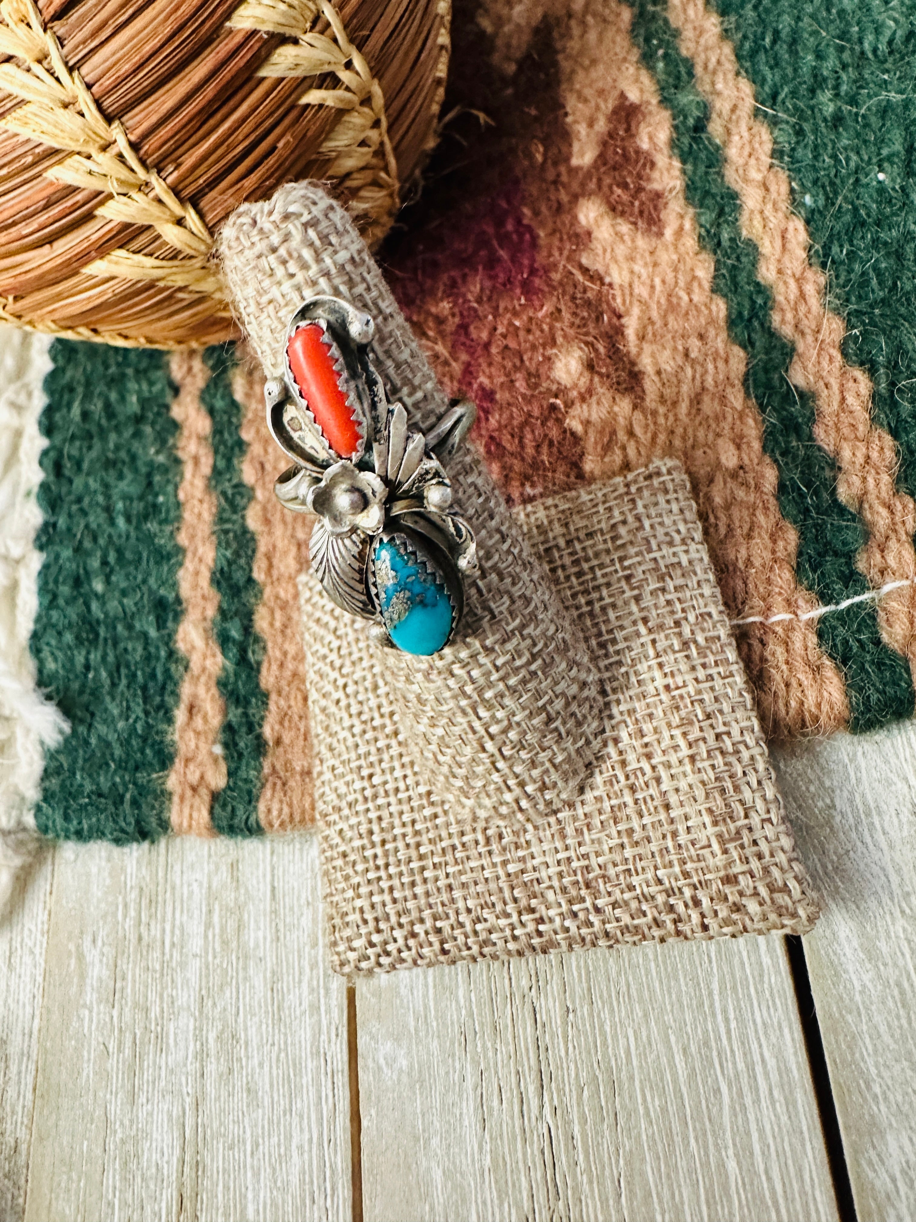 Old Pawn Handcrafted Turquoise, Coral & Sterling Silver Ring Size 6.5