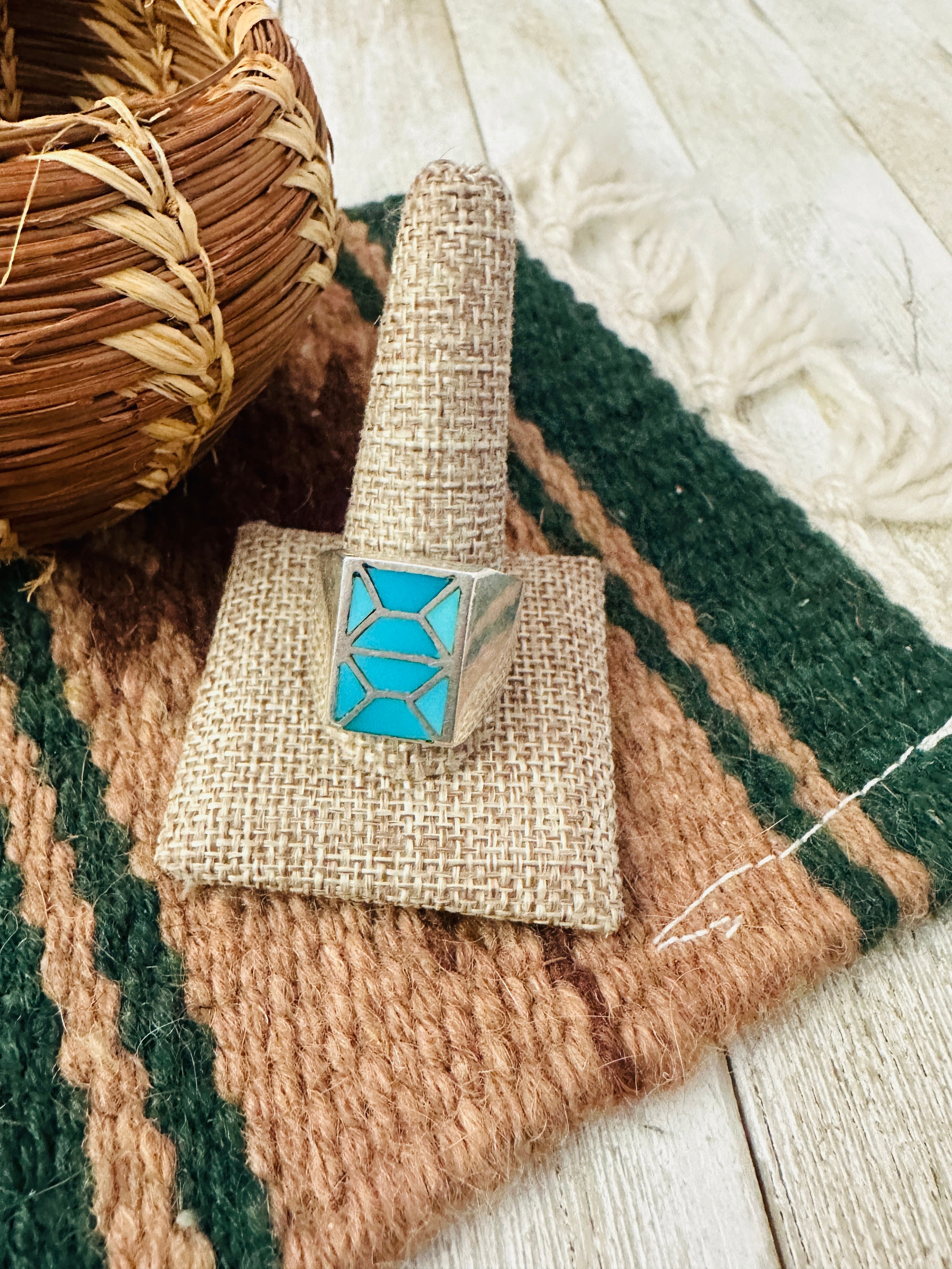 Old Pawn Handcrafted Turquoise & Sterling Silver Inlay Ring Size 12.75
