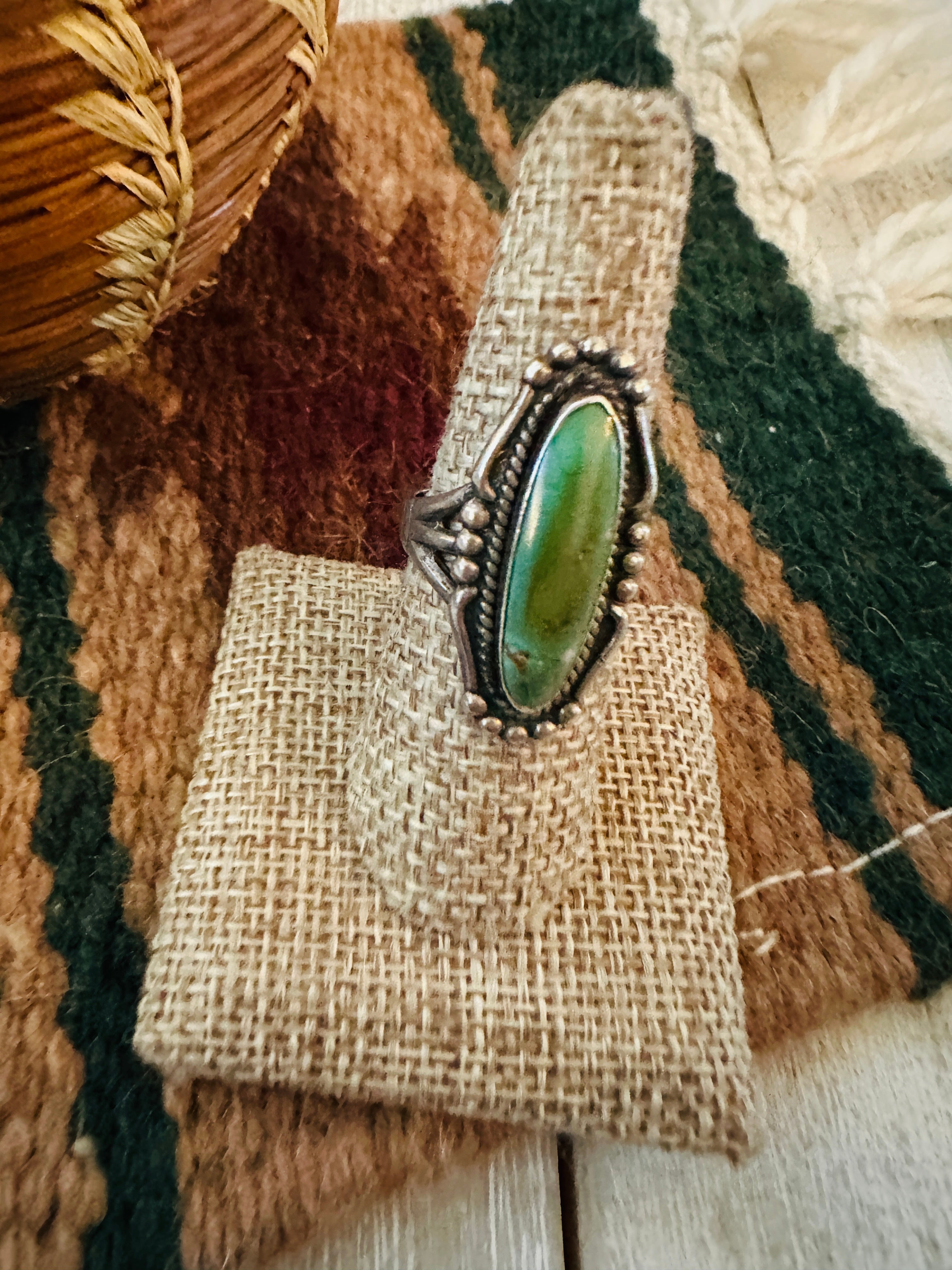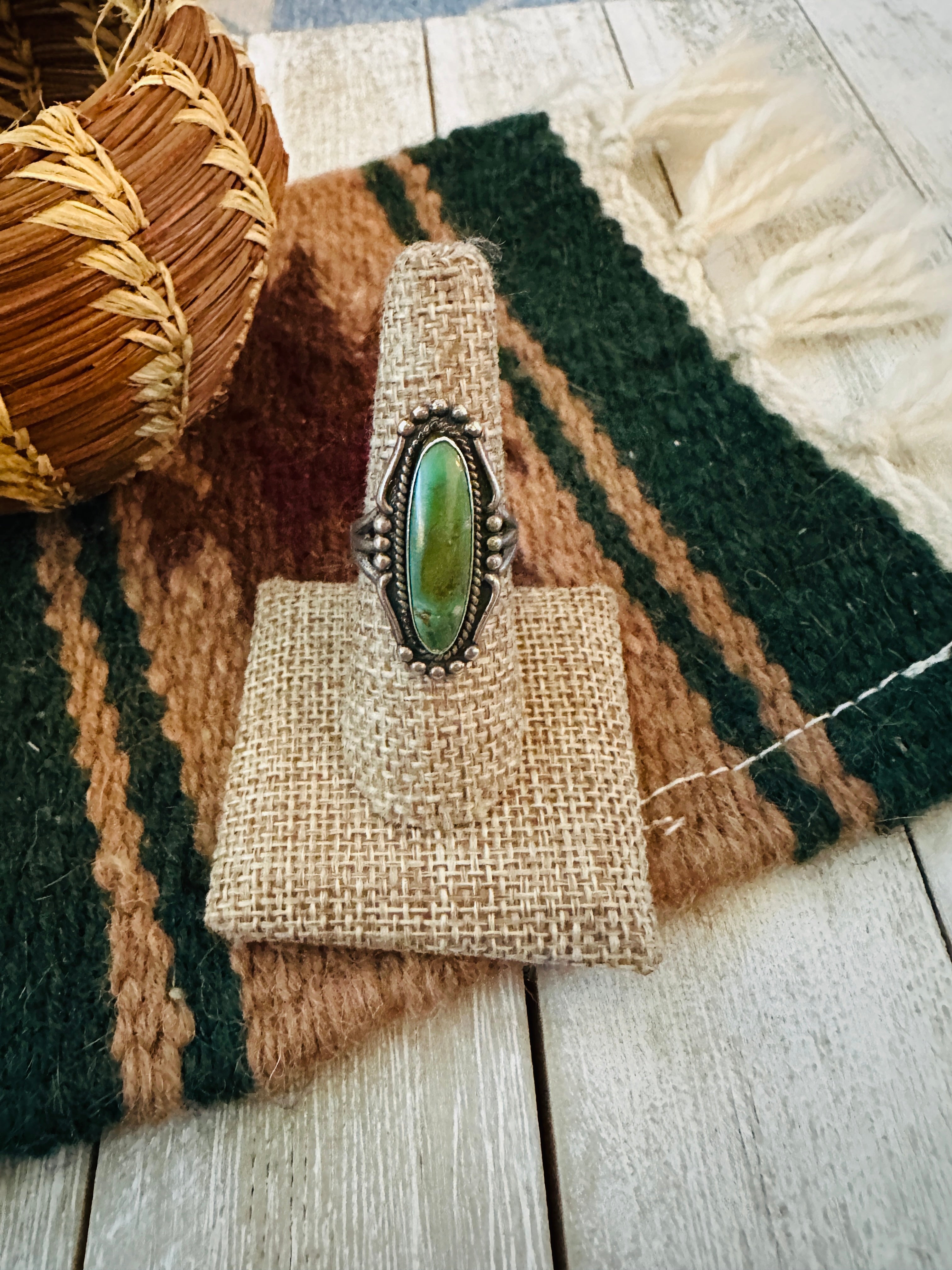 Beautiful Old Pawn Handcrafted Sterling Silver and Turquoise Ring. Size 7.75. Measures 1 1/4 inches long and 5/8 of an inch wide.