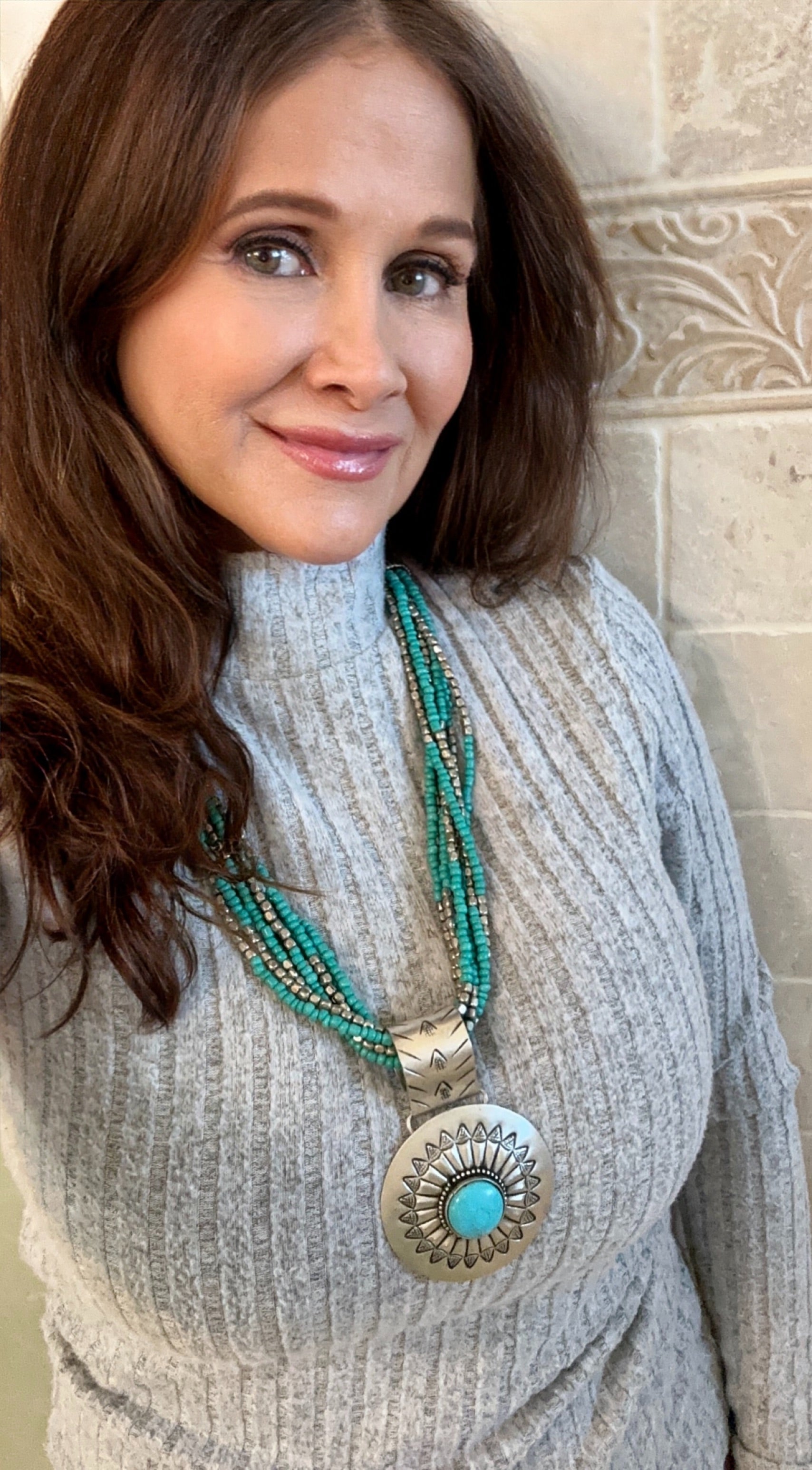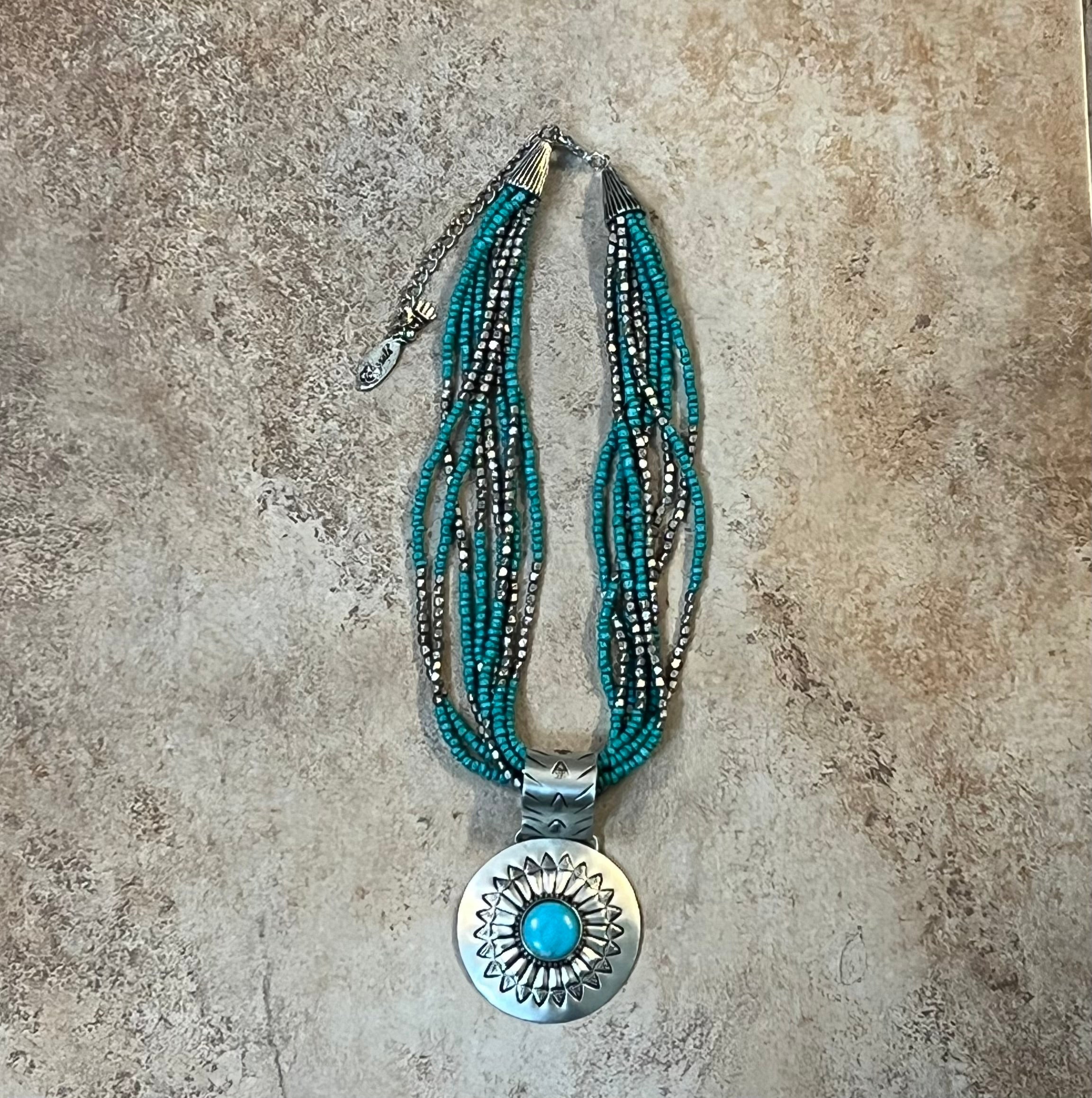 The combination of turquoise beads and the intricate pendant creates a perfect balance of earthy and sophisticated style, making it an eye-catching accessory for adding a touch of nature-inspired beauty to any outfit.