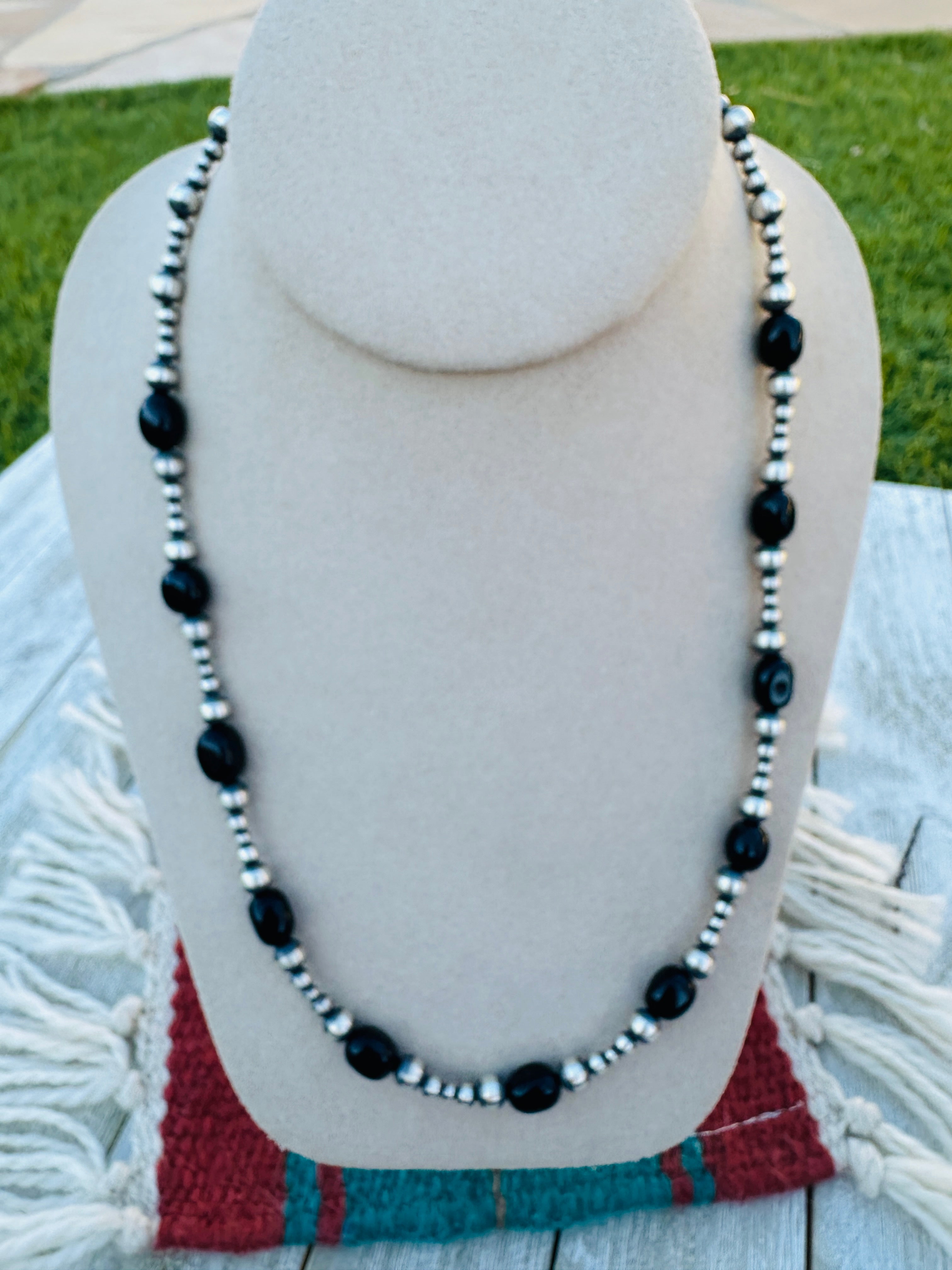 Beautiful Sterling Silver Pearl & Onyx Hand Strung Beaded Necklace. Measures 20 inches long. Perfect by itself or with your favorite pendant. Great for any collection!