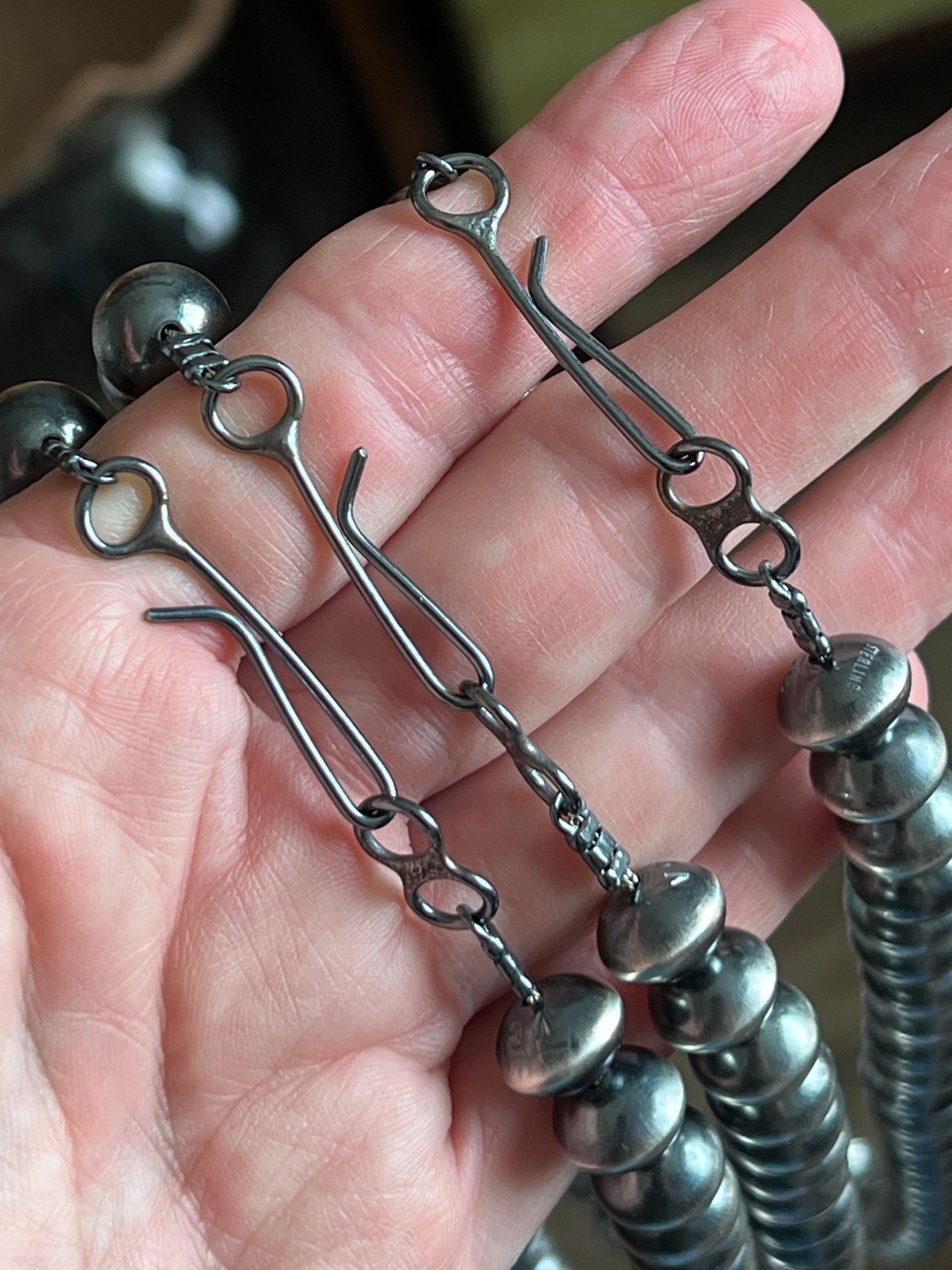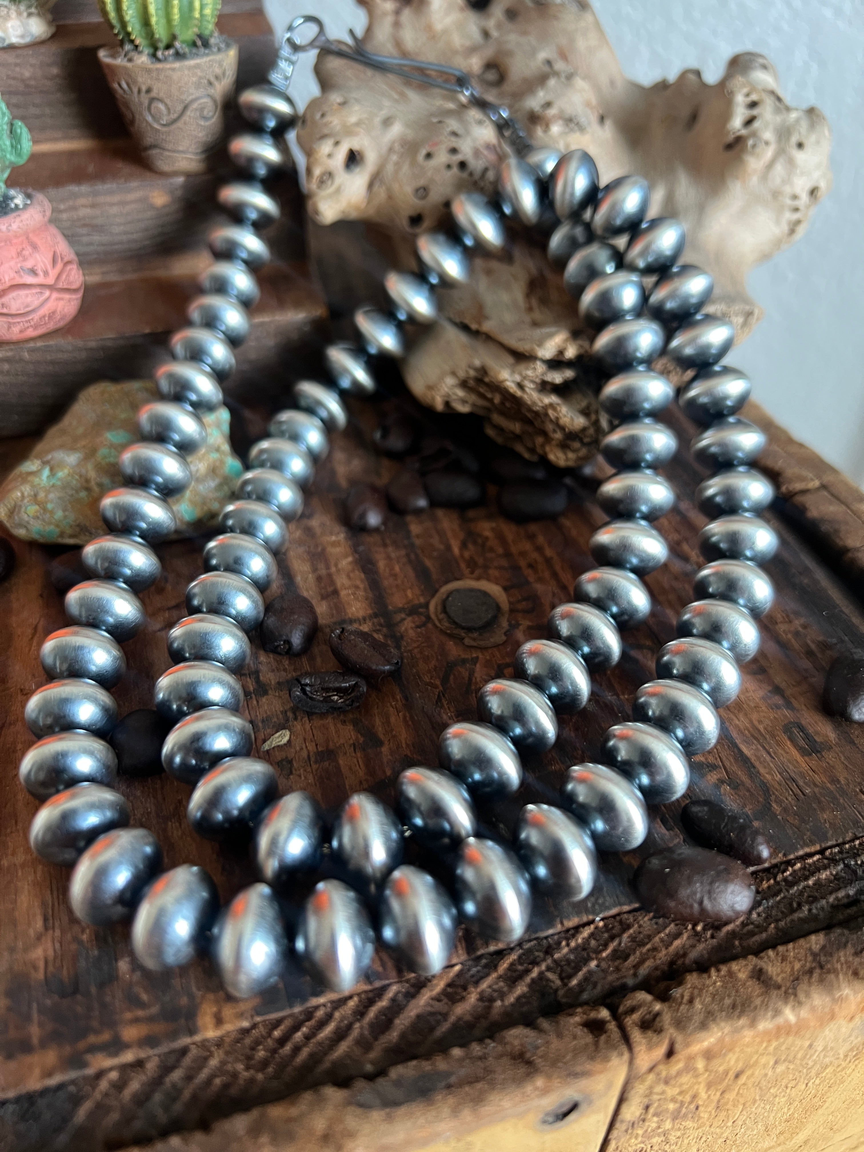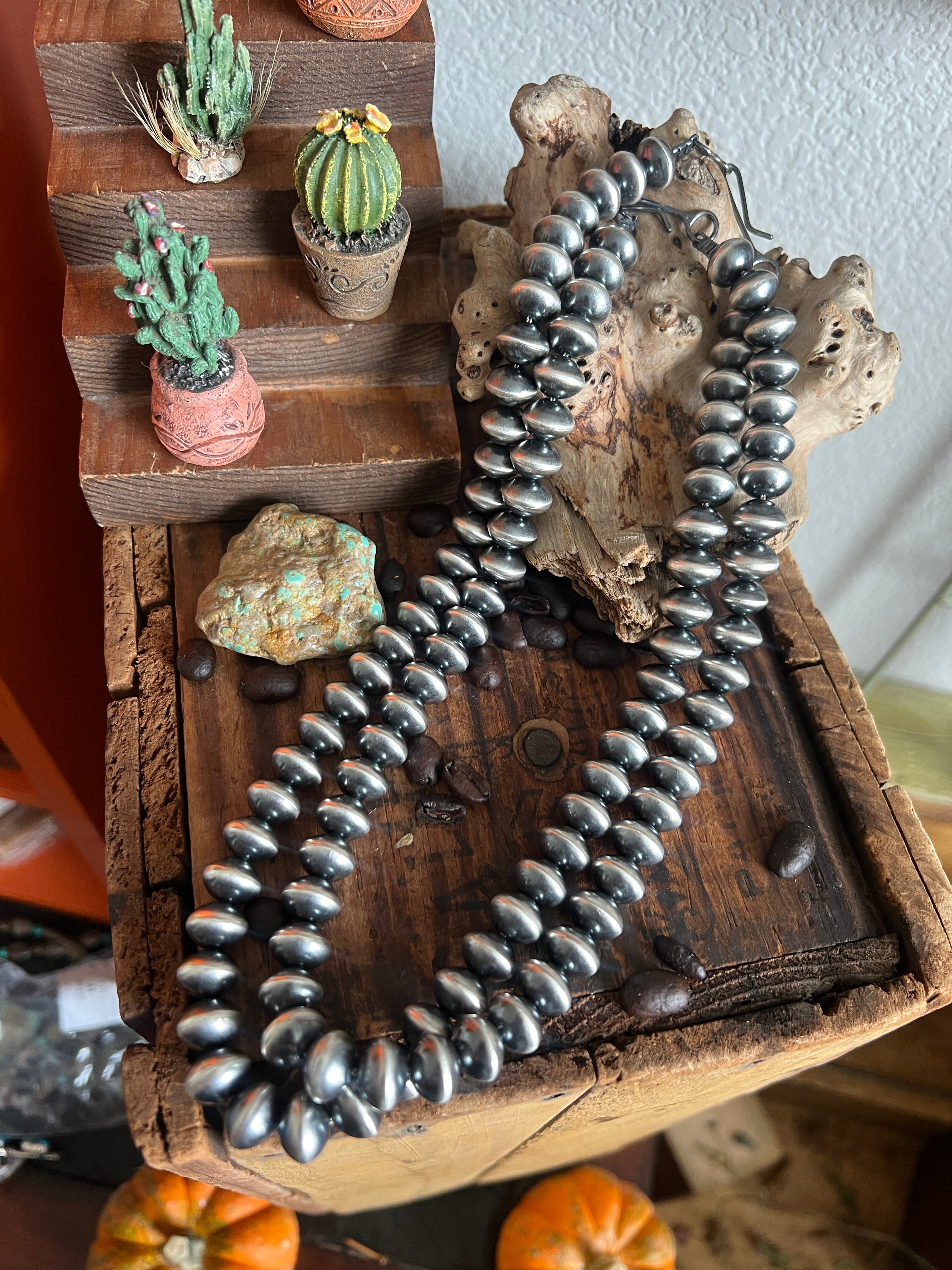 These beautiful strands of 11.5mm sterling silver saucer beads were handcrafted by New Mexico artist, Vinita Cowboy. 11.5mm beads are chunky enough to make a statement on their own but they get even better when layered in with other beads or an added pendant to kick it up a notch! Lengths are stated end to end, which includes the clasp. Vinita stamps a single bead with ‘sterling’ and her initials on each strand. This listing is for one beaded necklace only - be sure to search ‘Vinita Cowboy’ to see all of her beautiful handmade creations on our site.
