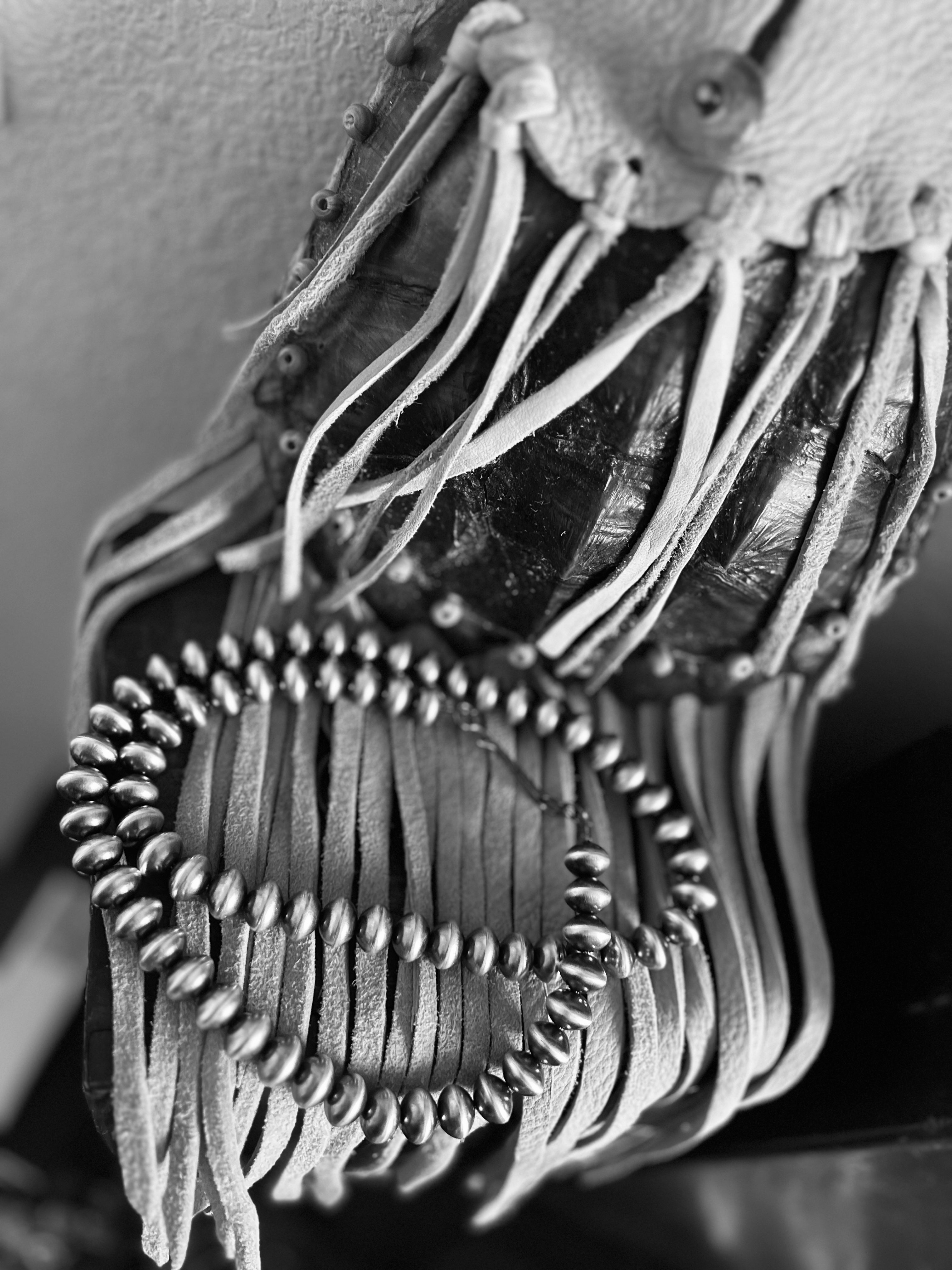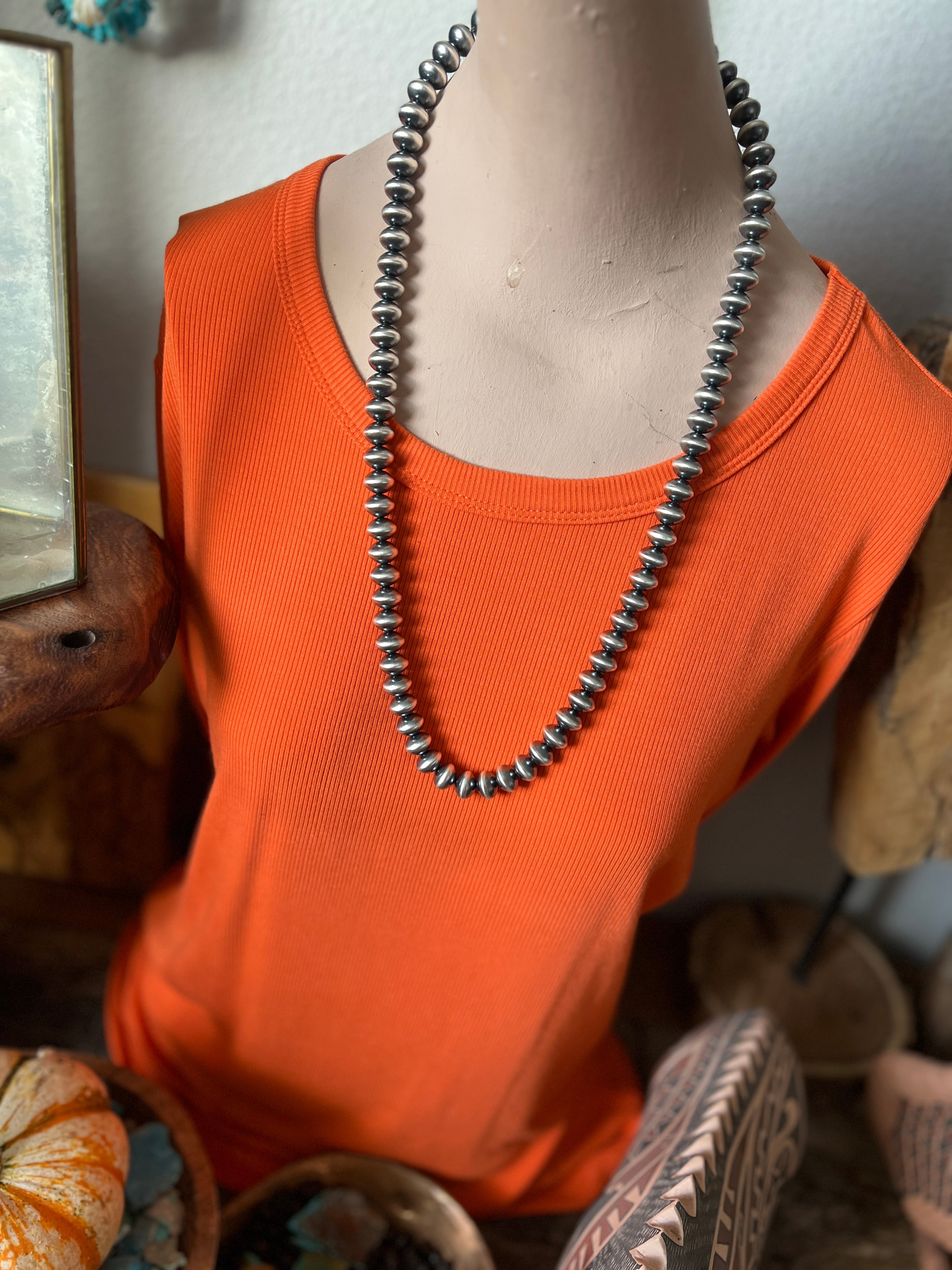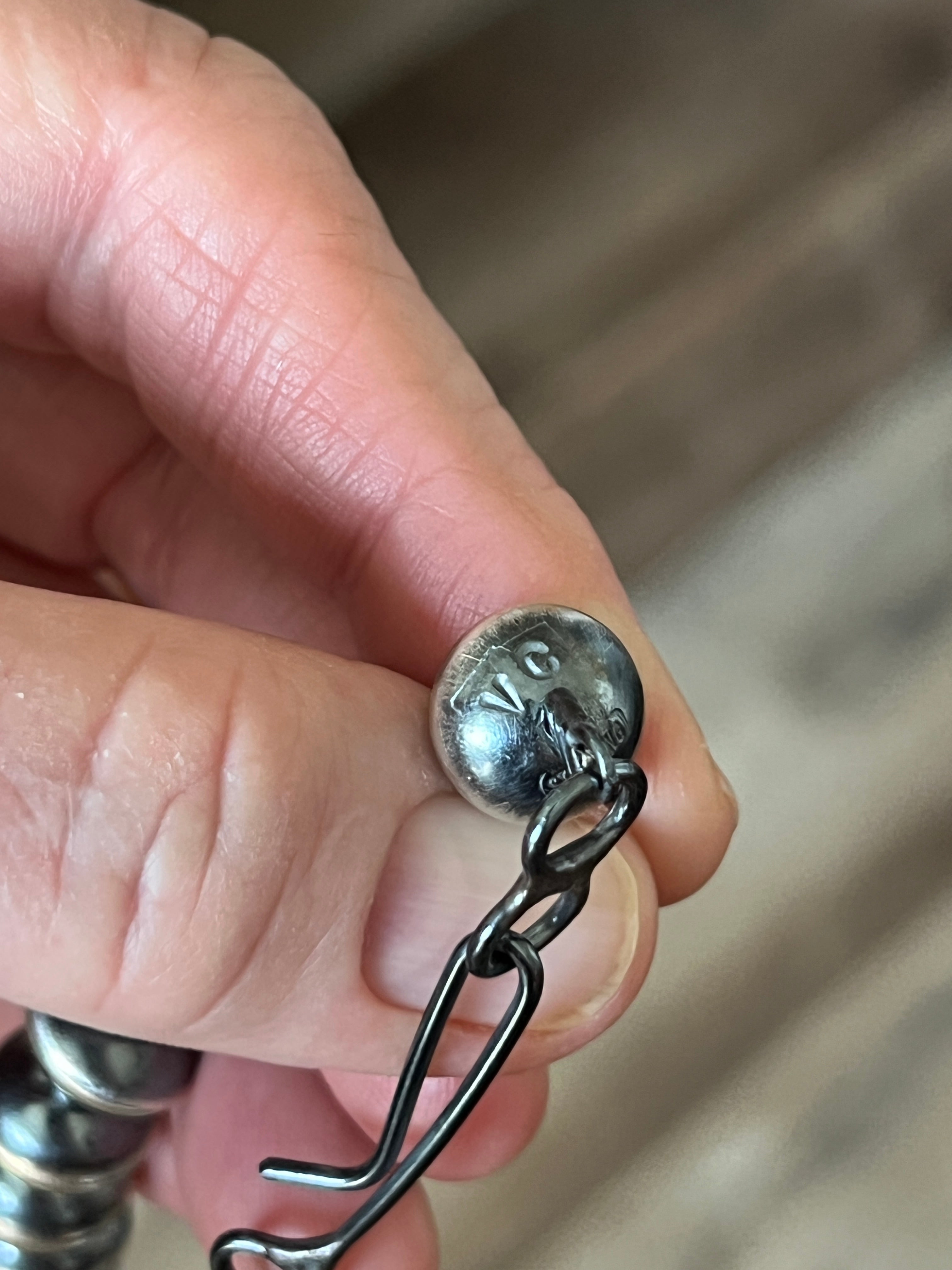 These beautiful strands of 11.5mm sterling silver saucer beads were handcrafted by New Mexico artist, Vinita Cowboy. 11.5mm beads are chunky enough to make a statement on their own but they get even better when layered in with other beads or an added pendant to kick it up a notch! Lengths are stated end to end, which includes the clasp. Vinita stamps a single bead with ‘sterling’ and her initials on each strand. This listing is for one beaded necklace only - be sure to search ‘Vinita Cowboy’ to see all of her beautiful handmade creations on our site.